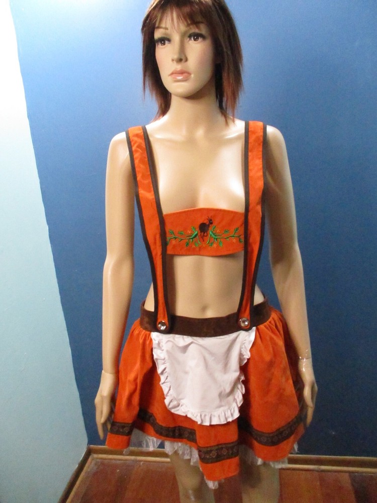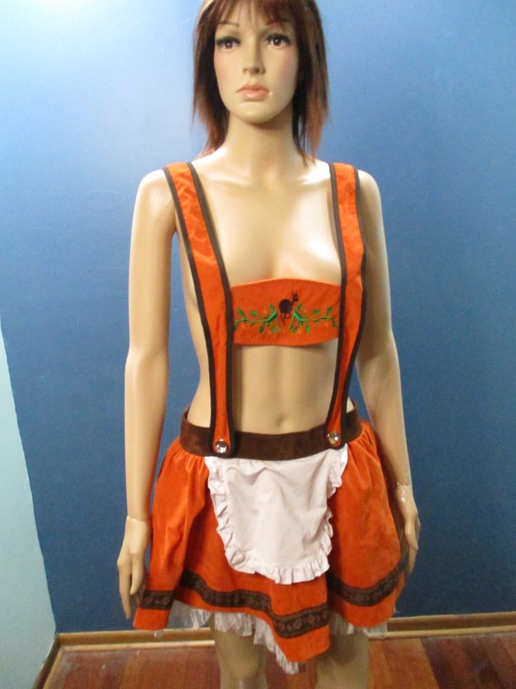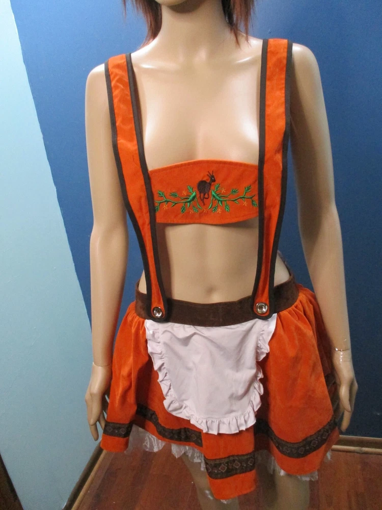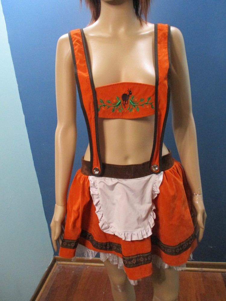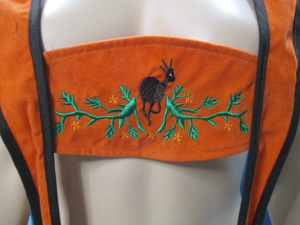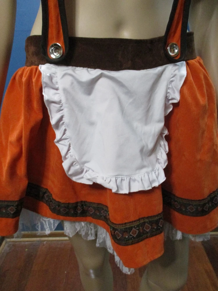 This is a very unique suede style, orange jumper style dress with brown trim. It features a front ruffle bib and an inner ruffled lining. It is embroidere with the image of a deer and some branches. There is an autumn theme going on. It's like a jumper dress with an open stomach, or a skirt with overall straps attached, which cross in the back. This dress is in good condition with standard light wear. It measures like a LARGE size but this is just a guess since there is no tag to say for sure. So PLEASE MIND THE MEASUREMENTS: The waist measures approximately 34 inches around ad the total length is about 35 inchers.