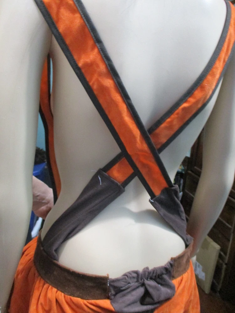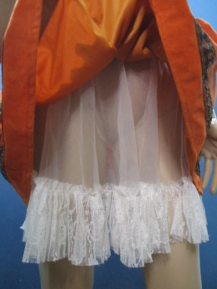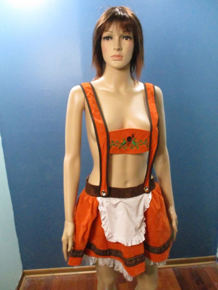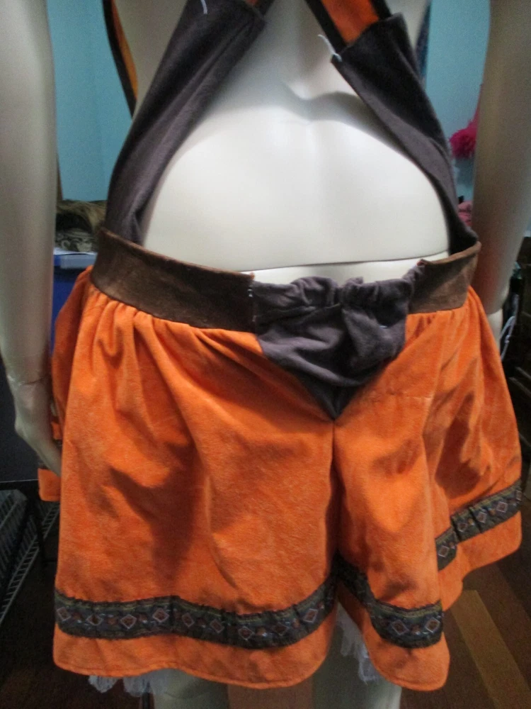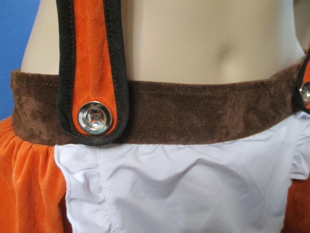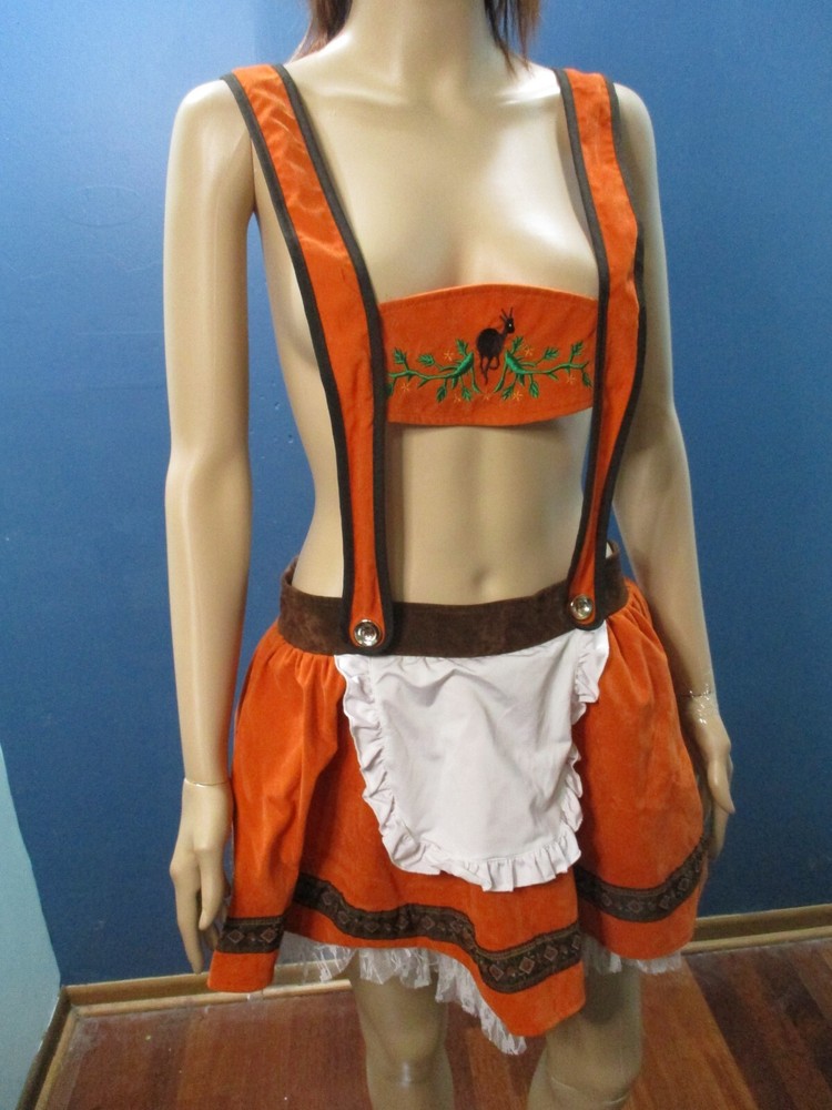 This is a very unique suede style, orange jumper style dress with brown trim. It features a front ruffle bib and an inner ruffled lining. It is embroidere with the image of a deer and some branches. There is an autumn theme going on. It's like a jumper dress with an open stomach, or a skirt with overall straps attached, which cross in the back. This dress is in good condition with standard light wear. It measures like a LARGE size but this is just a guess since there is no tag to say for sure. So PLEASE MIND THE MEASUREMENTS: The waist measures approximately 34 inches around ad the total length is about 35 inchers.