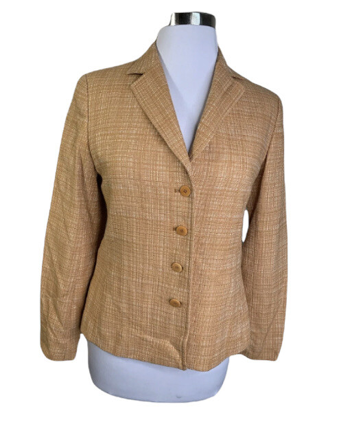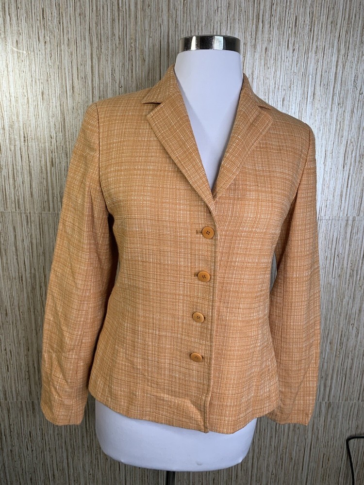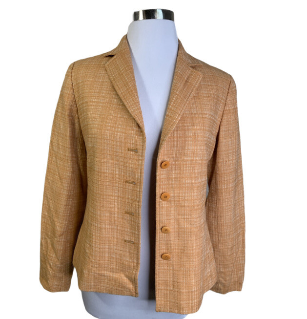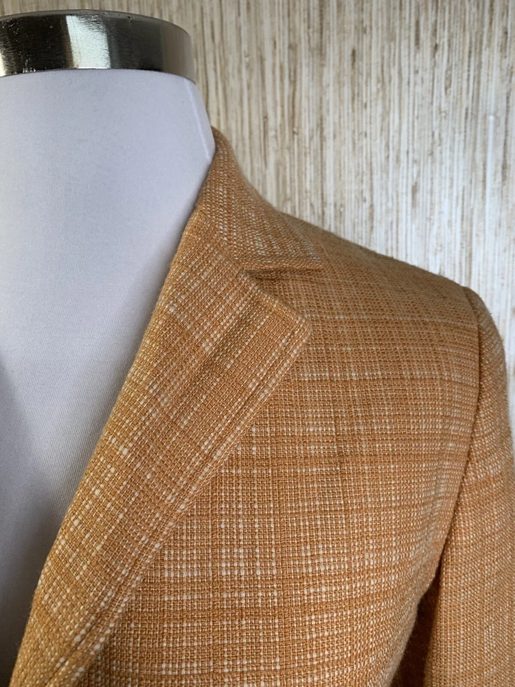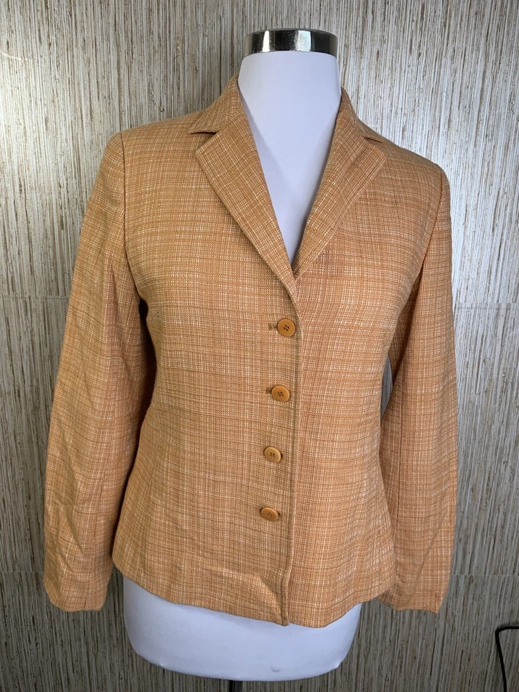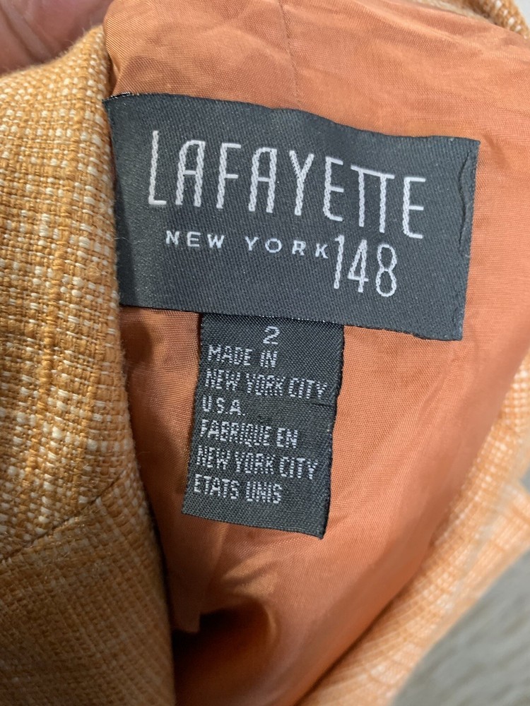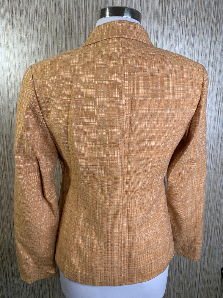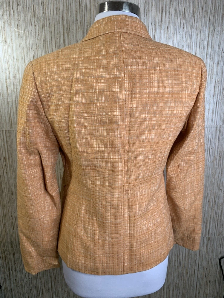 Elevate your workwear with this stunning tweed blazer from Lafayette 148 New York. The cream color with orange accents, 70% New Wool and 40% Silk blend fabric, and mid-length cut make it the perfect statement piece for any business-themed occasion. The collar and button closure add a touch of sophistication, while the long sleeves and silk lining ensure comfort in all seasons. This vintage jacket is a size 2 and in excellent condition, ready to add a touch of timeless elegance to your wardrobe. Retail $298
