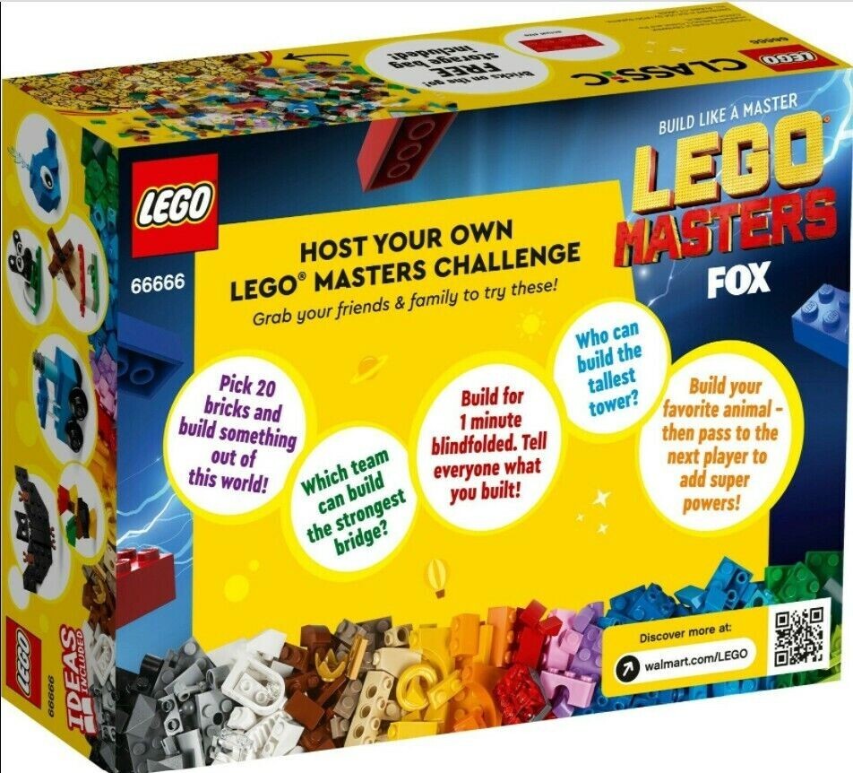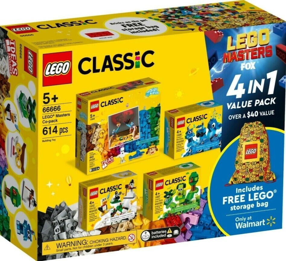 Four sets in one! Builders aged 5 and up can get creative and build like a Master with this Walmart exclusive LEGO Masters Classic Value Pack – inspired by the hit family-friendly TV show LEGO MASTERS, airing Tuesdays on FOX, starting June 1. Challenge friends, family and even yourself to build masterpieces of all shapes and sizes with activity inspiration like “build the tallest tower” and “build blindfolded for 1 minute. Includes 613 pieces in a wide range of shapes and colors, and a FREE LEGO storage bag to take creativity on the go Includes 11009 LEGO Classic Bricks and Lights, 11012 LEGO Classic Creative White Bricks, 11006 LEGO Classic Creative Blue Bricks and 11007 LEGO Classic Creative Green Bricks. Combine sets for even more imaginative fun LEGO Classic bricks fit together in endless combinations to inspire open-ended creativity Fun for everyone aged 5 and up