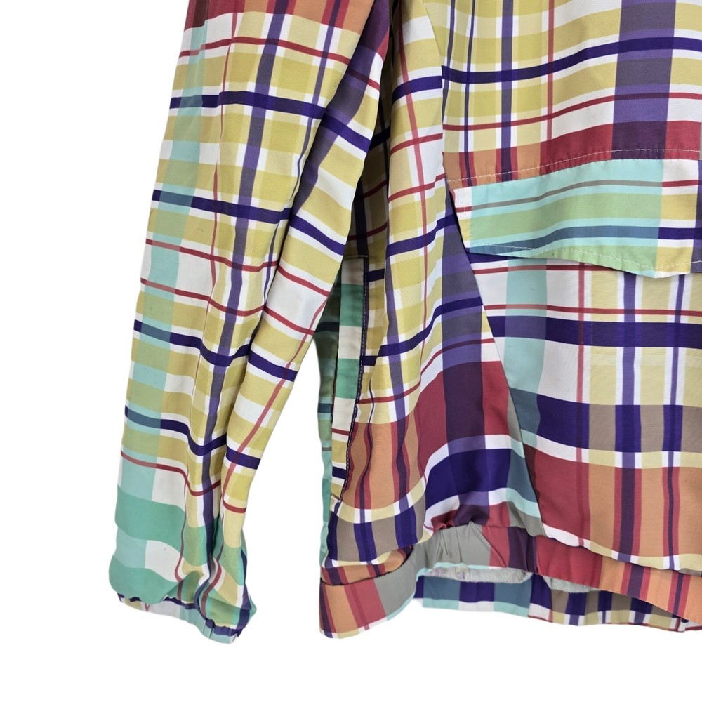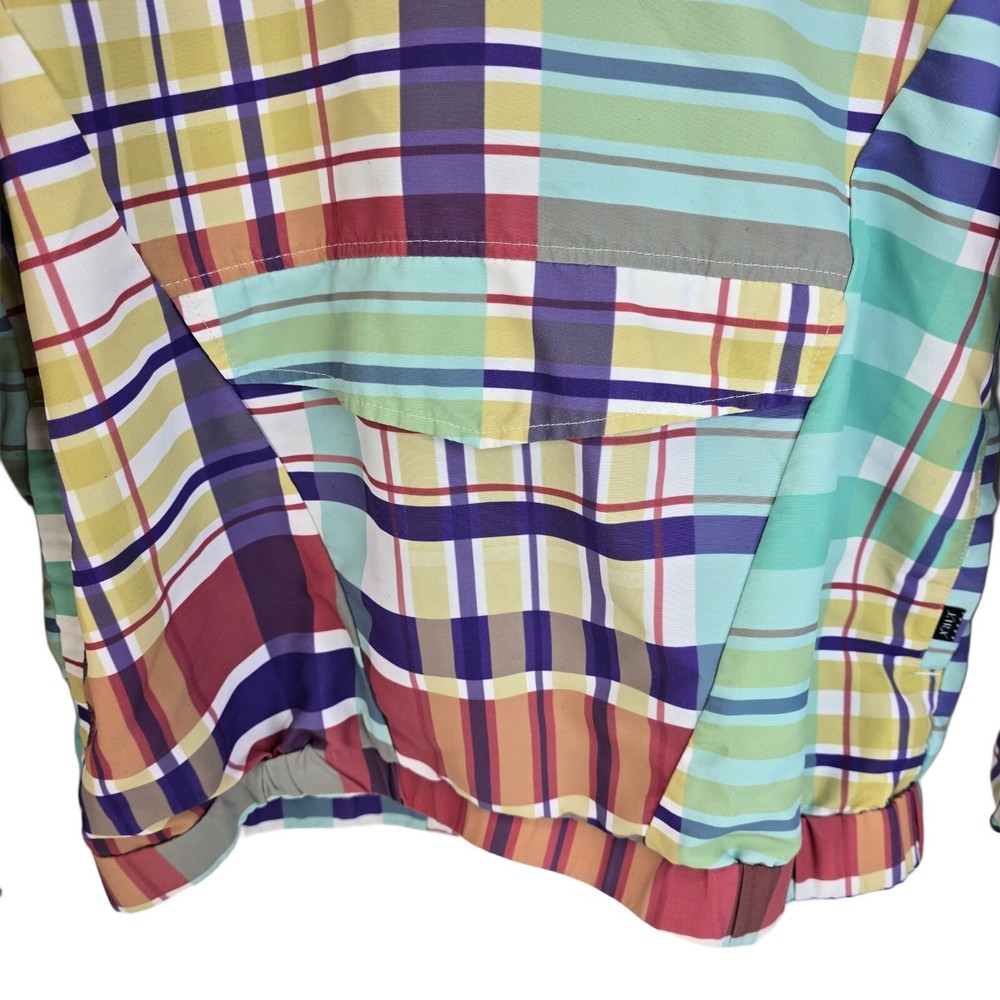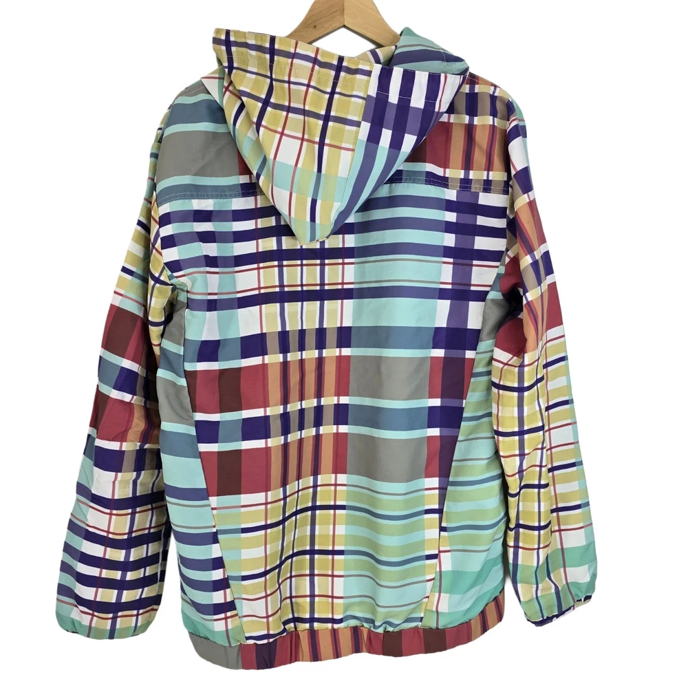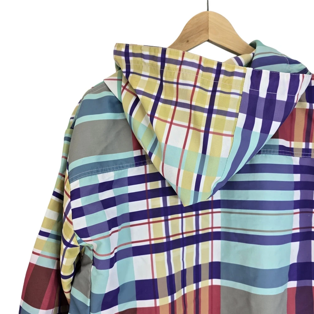 LIRA Mfg Co Creative Society Colorfull Plaid Pull Over Coat Size Medium • In good used condition • No holes - One small stain and is missing string in the hood (SEE photos) • Measurments - Length 27" ...