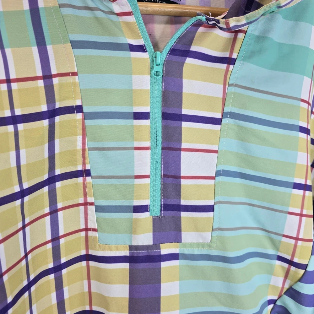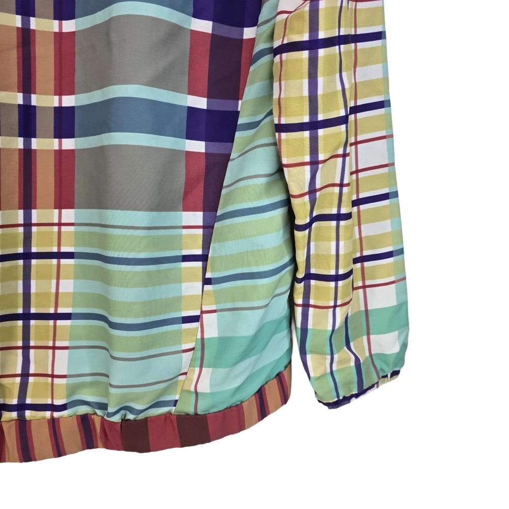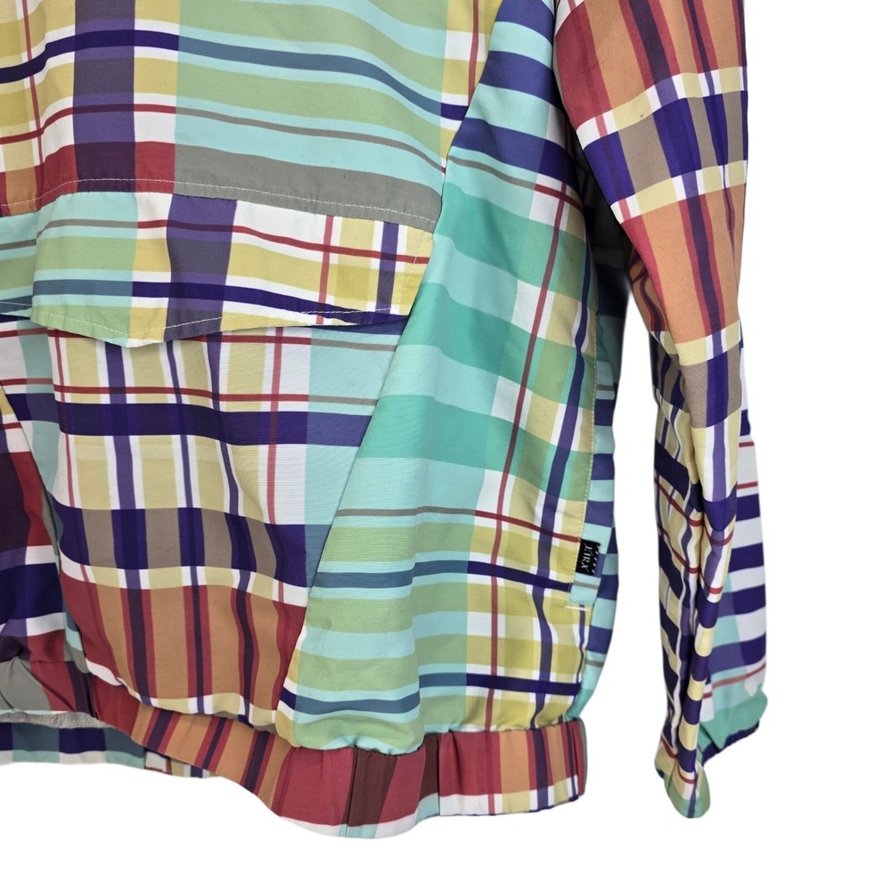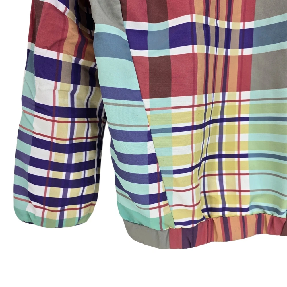 LIRA Mfg Co Creative Society Colorfull Plaid Pull Over Coat Size Medium • In good used condition • No holes - One small stain and is missing string in the hood (SEE photos) • Measurments - Length 27" ...