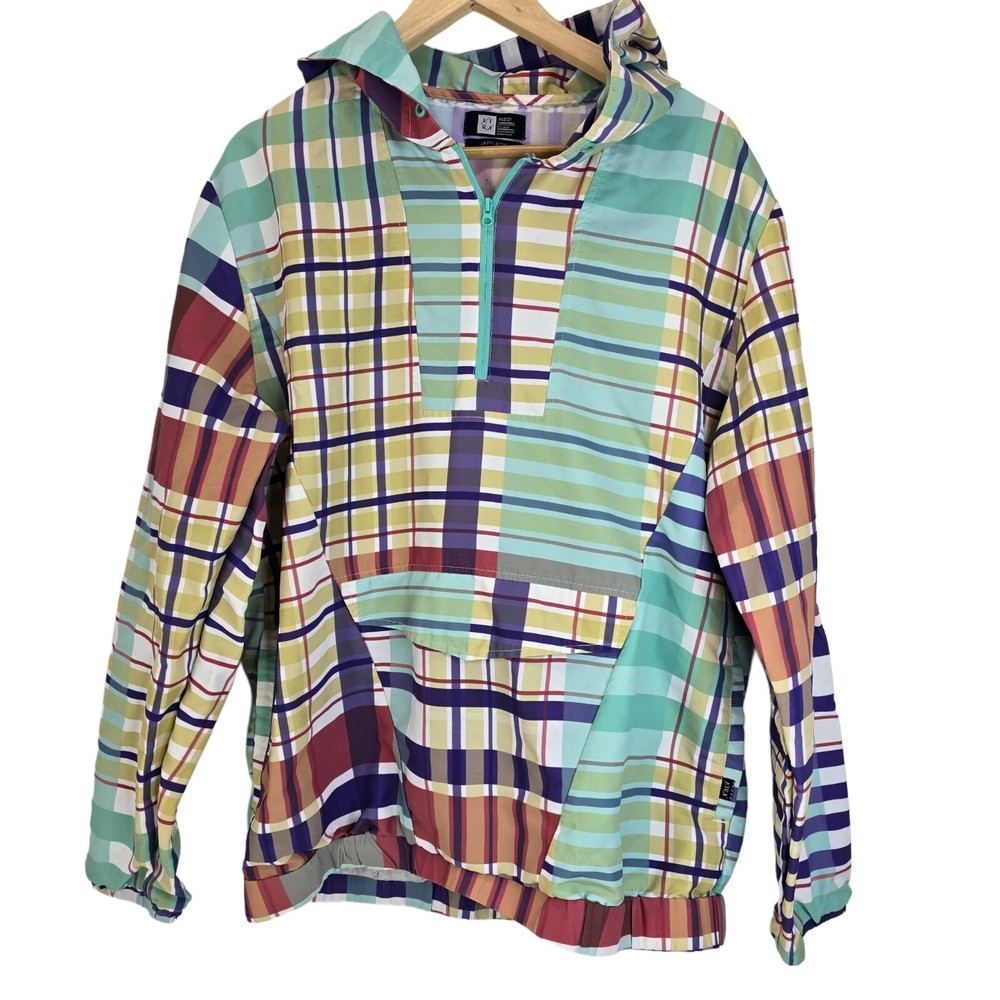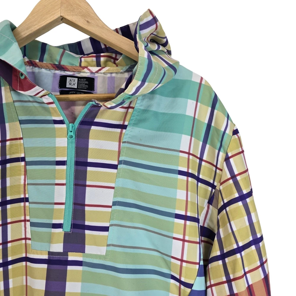 LIRA Mfg Co Creative Society Colorfull Plaid Pull Over Coat Size Medium • In good used condition • No holes - One small stain and is missing string in the hood (SEE photos) • Measurments - Length 27" Chest 20.5" Sleeve 24"