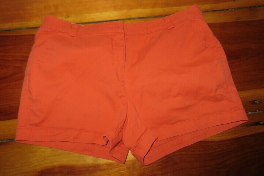 This is a fantastic pair of LL Bean Signature cotton Shorts in women's size 14. Color is orange. Material is soft cotton / spandex. Flat Front. Two hip pockets and two pockets in back. Waist measures 36" and inseam is 3". Very good condition - no stains or damage.