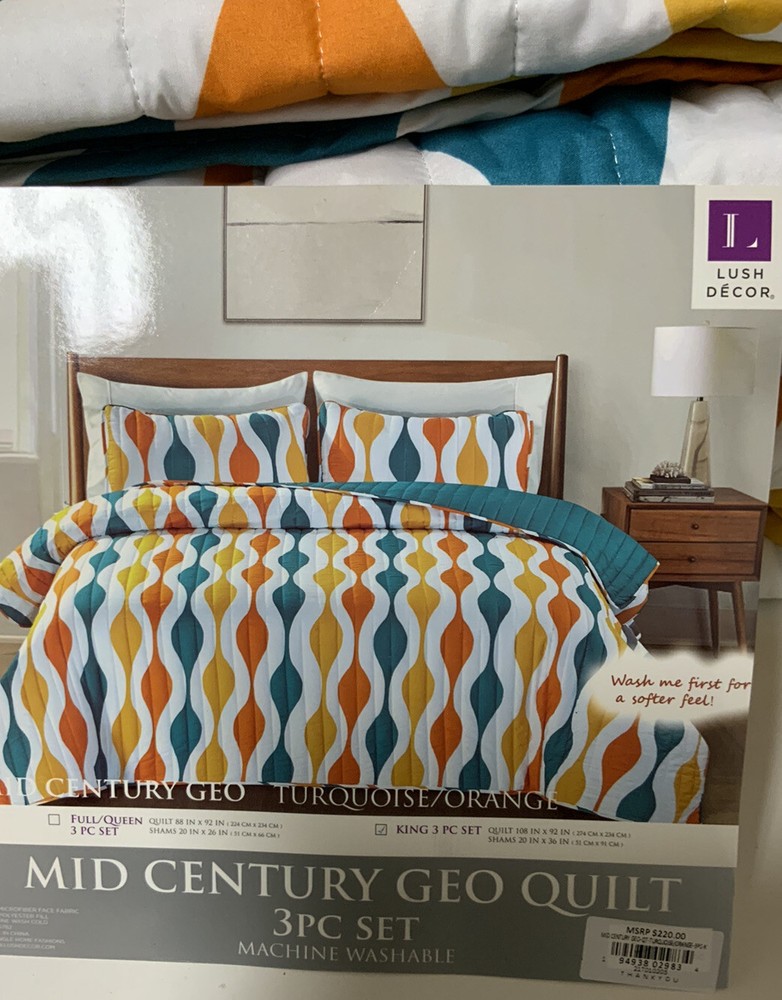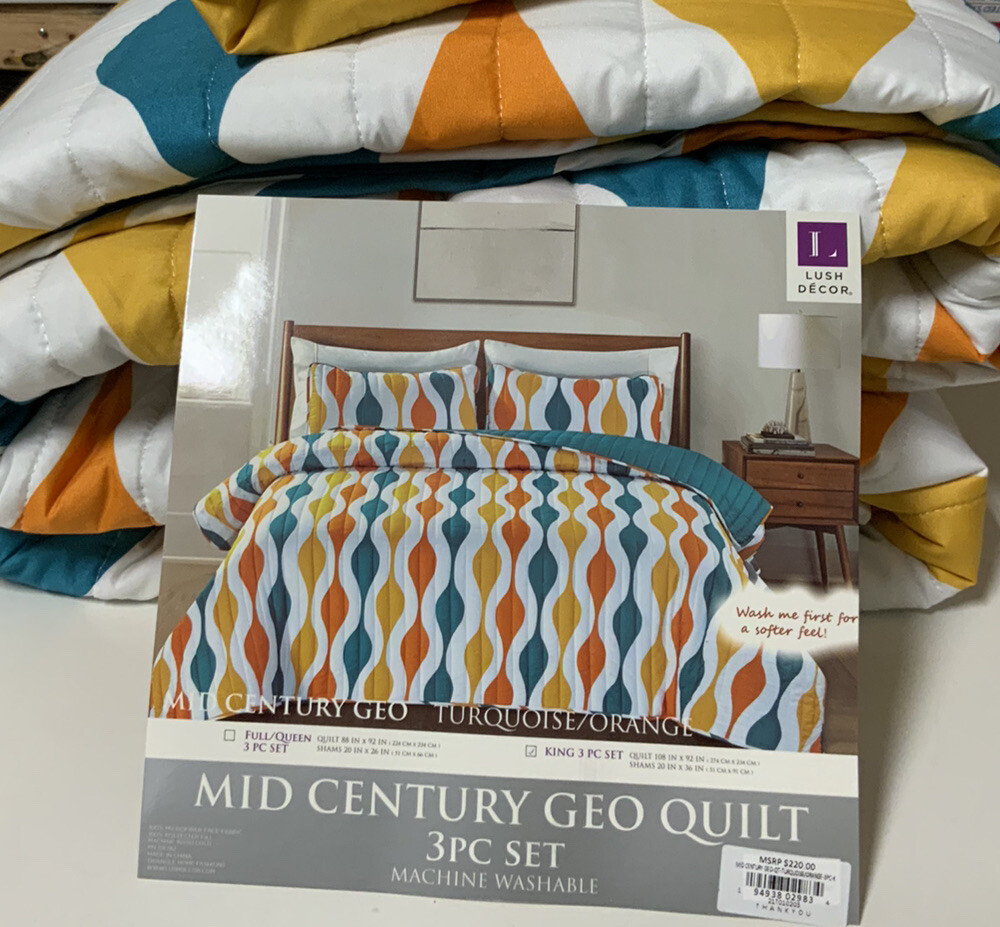 743 863SM🧷 LUSH DECOR MID CENTURY GEO QUILT SET TURQUOISE/ORANGE KING 3pcs 🆕.
