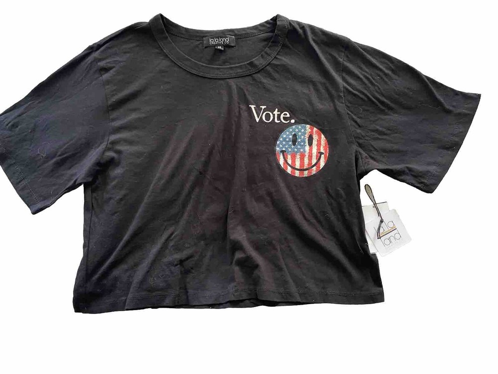 Show off your support for democracy with the La La Land Creative Co Women's Black Crop T-Shirt. Made from 100% cotton, this comfortable shirt features a crew neckline and short sleeves, perfect for staying cool while running errands or hanging out with friends. The cropped style adds a trendy edge to your outfit, while the "Vote" design in bold letters encourages others to exercise their right to vote. Available in size M, this shirt is perfect for any woman who wants to make a statement in style.