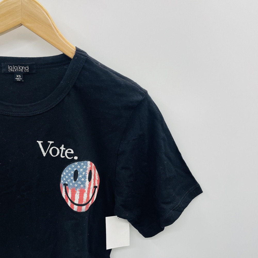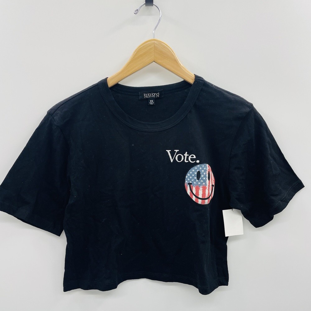 La La Land Creative Co Women's Vote Tshirt Crop Top with Happy Face Graphic in Black Inky black cotton t-shirt with the powerful message “Vote” is lightweight & super comfortable. 100% cotton Cropped Short sleeve Crew neck Size XS Pit to Pit: 17.5" Wide Length: 17.5" Long Condition is new, original tags have been removed. Store reticket tag is attached, see photos. Check out the other items listed in my store.