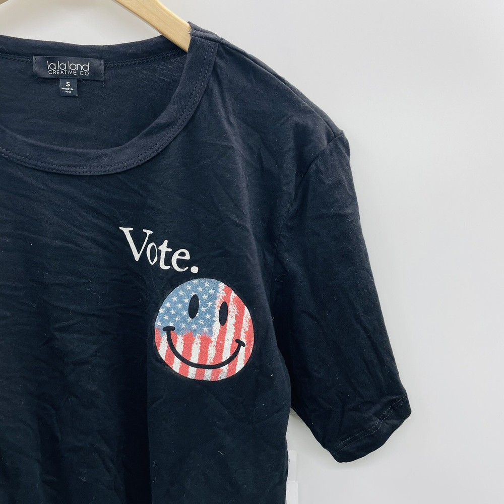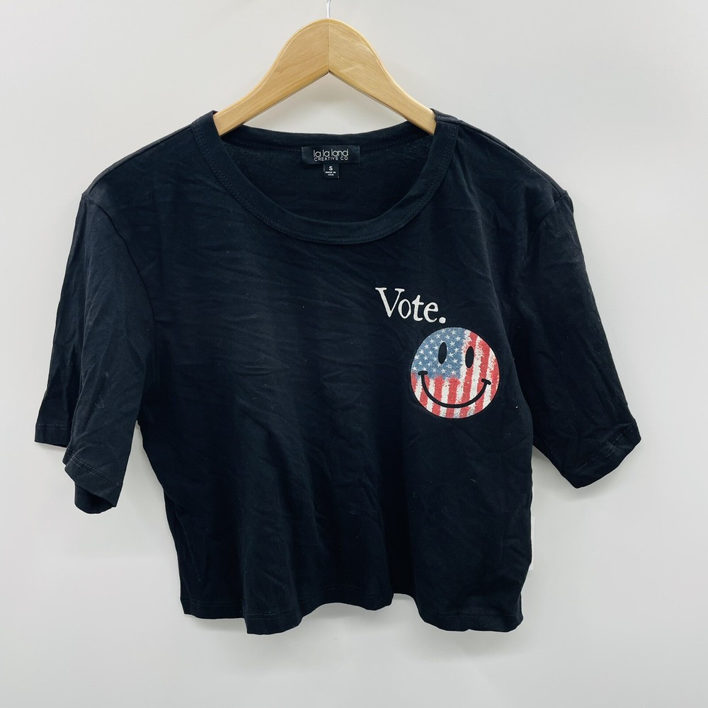 La La Land Creative Co Women's Vote Tshirt Crop Top with Happy Face Graphic in Black Inky black cotton t-shirt with the powerful message “Vote” is lightweight & super comfortable. 100% cotton Cropped Short sleeve Crew neck Size Small Pit to Pit: 19" Wide Length: 18" Long Excellent condition, new with tags! Check out the other items listed in my store.