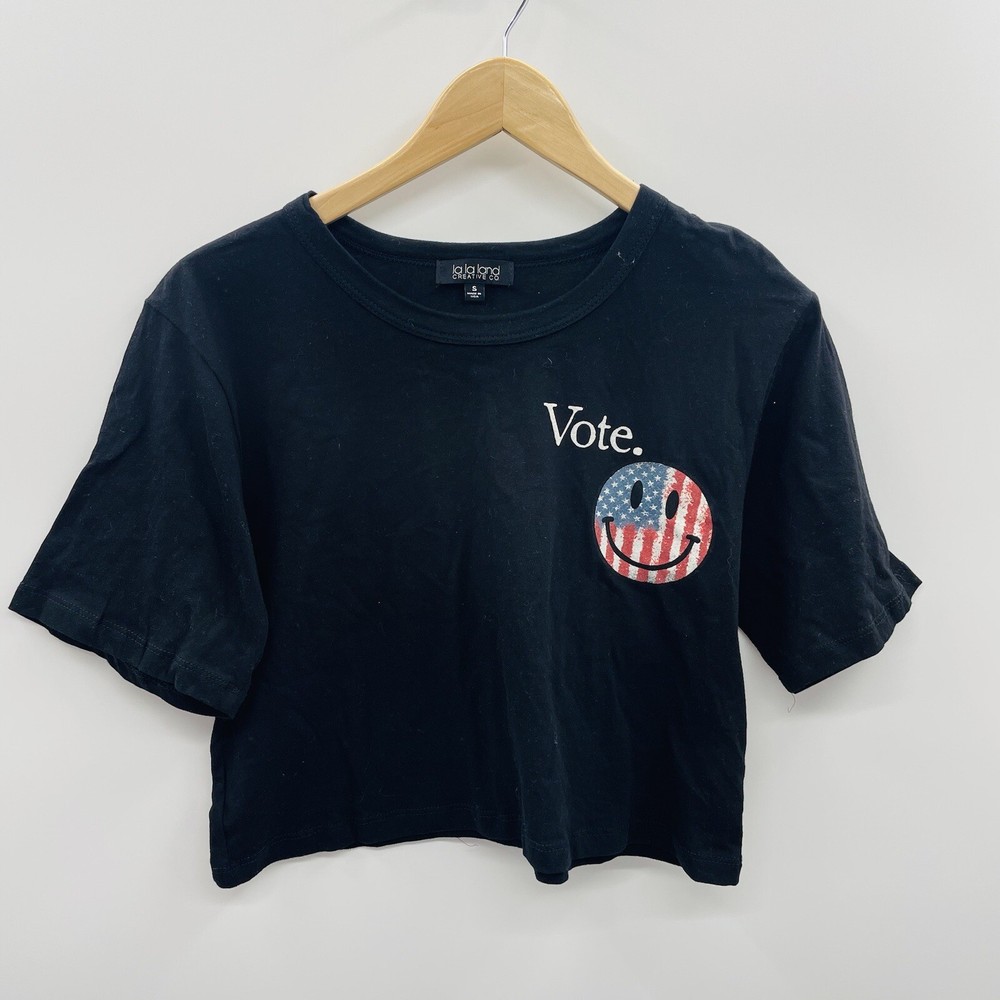 La La Land Creative Co Women's Vote T-shirt Crop Top with Happy Face Graphic in Black Inky black cotton t-shirt with the powerful message “Vote” is lightweight & super comfortable. 100% cotton Cropped Short sleeve Crew neck Size Small Pit to Pit: 18" Wide Length: 18" Long Condition is new original tags have been removed, see photos. Check out the other items listed in my store.