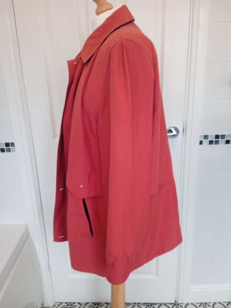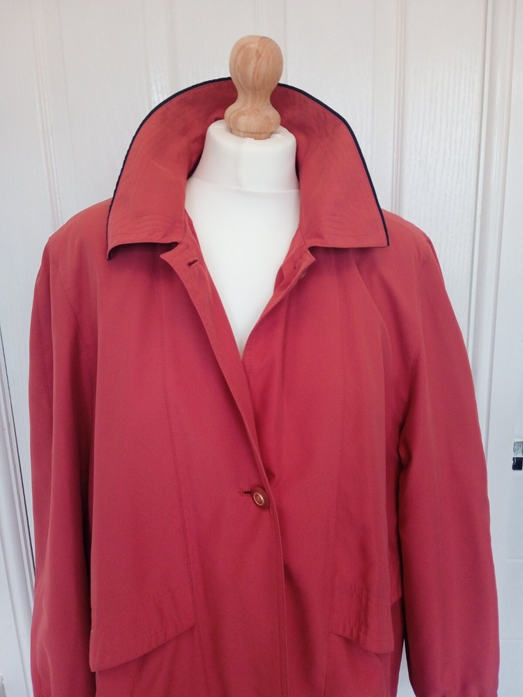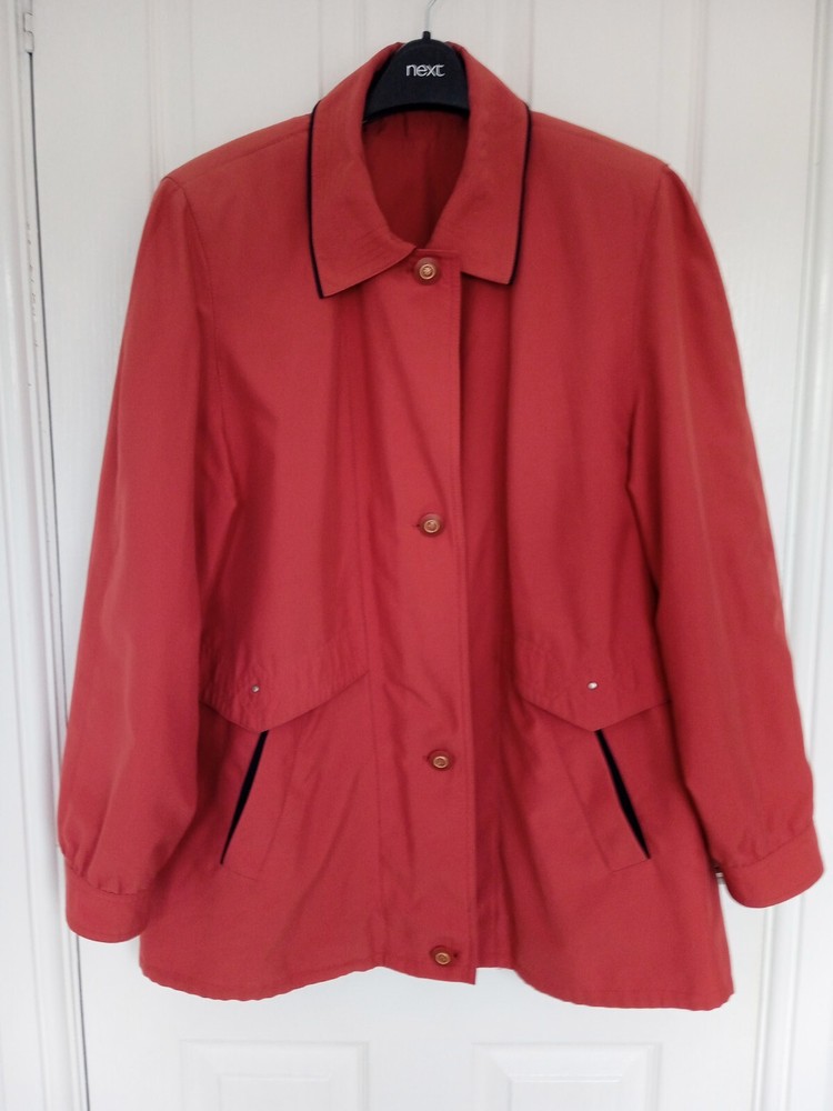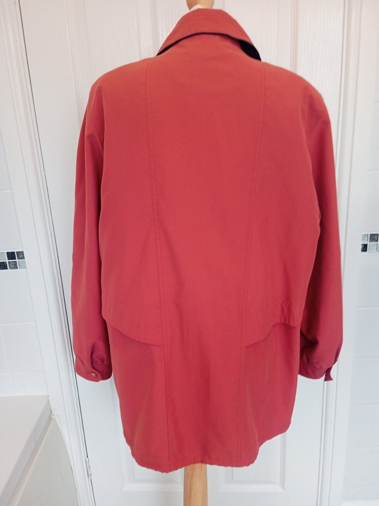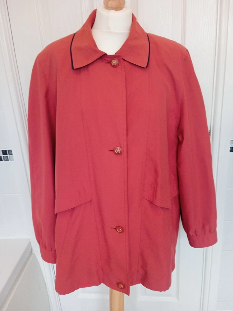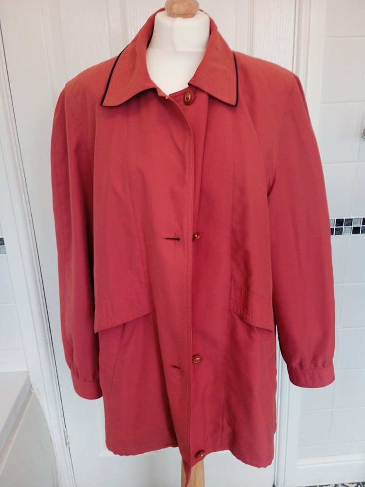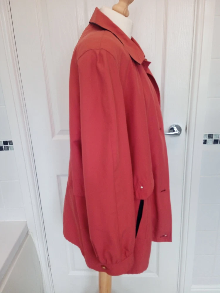 For sale is a lovely ladies thigh length, lightweight jacket/coat with pretty buttons on the front. The fabric is soft and light weight. Condition is very good - freshly laundered with no rips or tears - the coat is fully lined. Soft Collar with contrast piping Colour: Burnt Orange Button front fastening 2 large external pockets + 1 internal pocket Additional storm flaps on front and back Small built in shoulder pads Full length sleeves with piped contrast cuffs Machine washable/ Quick dry and can be ironed on reverse if desired Label size 16 Pit to pit width under arms: 23 inches approx across front when laid flat and fully fastened Length from shoulder seam to hem: 31 inches approx. Take a look at my other items. I'm happy to combine postage for you. Message me if you're interested. Thanks for looking, Green Goddess 2000💚