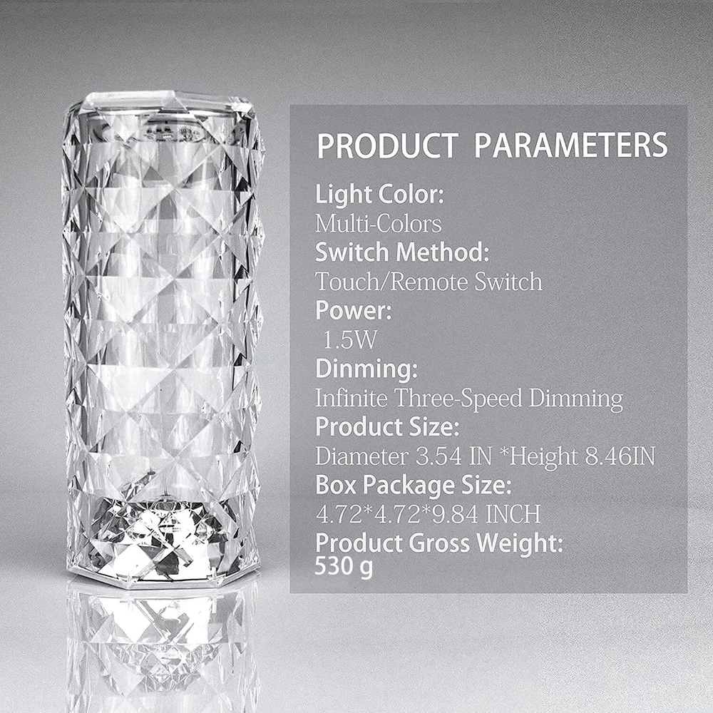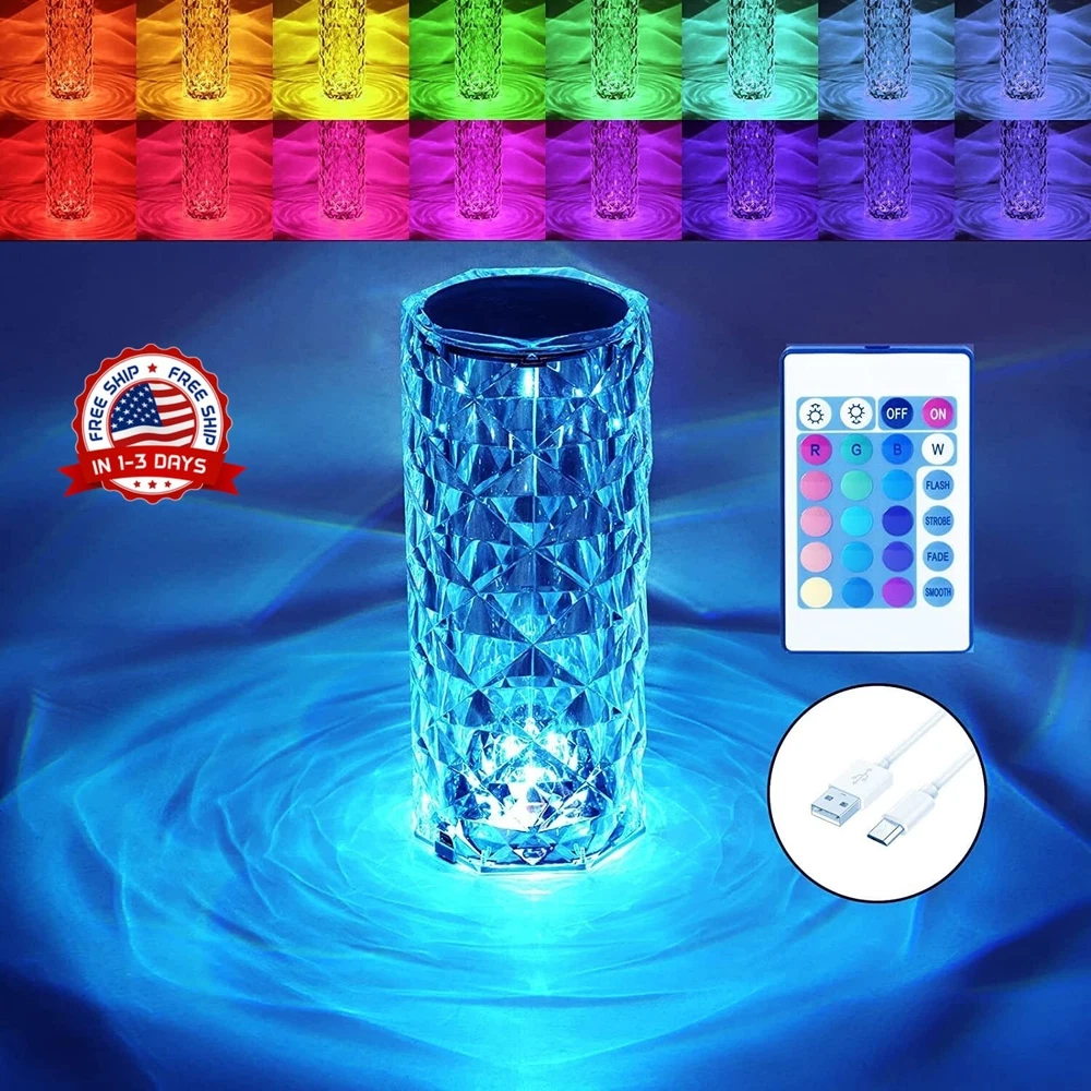 Lampara Acrílico 16 Colores LED Para Mesa Mesita De Noche USB Con Control Remoto MODO DE ESCENA MÚLTIPLE: 8.7 IN * 3.5 IN - (Regalos de Navidad) Lámpara RGB de cristal de 16 colores, cree la atmósfera que necesita con varios modos de escena dinámicos para elegir. Cada modo muestra diferentes colores y efectos de luz, ayudándote a sumergirte completamente en tus mundos artísticos. APARIENCIA DE MODA: el nuevo concepto de diseño de diamantes es una experiencia de lujo simple y moderna. Brilla como un diamante sin perder su especial tecnología 3D. La lámpara de cristal de refracción es brillante y colorida. La exquisita pantalla de mesa de cristal adopta una superficie de corte de diamante para mostrar el hermoso temperamento, decorar su sala de estar y crear una atmósfera cómoda y romántica. SEGURIDAD Y RESISTENCIA: lámpara Rgb hecha con material acrílico de primera calidad. Línea de borde muy suave con luz de cristal LED, para no lastimarse las manos, hecha de material acrílico y el diseño de forma de triángulo de borde, los pequeños movimientos no se dañarán, porque es único diseño simple y cilíndrico, por lo que se puede colocar mejor en múltiples posiciones en la sala de estar. Es una excelente lámpara auxiliar fresca para decorar la habitación y tomar fotografías. REGALO PERFECTO PARA EL DÍA DE SAN VALENTÍN: cuando la luz nocturna no está encendida, es un adorno que combina perfectamente con su habitación. Durante el día, la apariencia natural y elegante del diamante de cristal permite colocarlo en cualquier lugar de la casa sin parecer fuera de lugar. Por la noche, es una hermosa luz nocturna colorida y romántica. , para iluminar tu cuerpo y tu mente. Es el mejor regalo de decoración del día de San Valentín/cumpleaños y regalos de fiesta para tu familia, amigos y compañeros de clase.