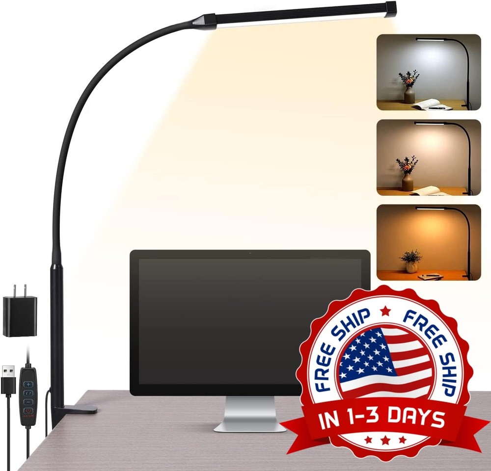 Lampara De Escritorio Y Mesa LED Luz, Clip En Lámpara Luz Cálida Y Blanca, Negro 【Largo cuello de cisne flexible y larga vida útil】: el cuello de cisne flexible ajustable de 360° de largo te permite ajustar la luz de abrazadera regulable con facilidad y dirigir la luz a donde quieras. La placa de luz está hecha de aluminio de alta calidad, que tiene mejor calor. disipación y puede extender la vida útil de la lámpara del brazo oscilante hasta 50.000 horas. 【3 MODOS DE COLOR Y 10 NIVELES DE BRILLO】 : Esta lámpara de clip de escritorio regulable ofrece 3 modos de color: luz cálida (2700 K), luz blanca cálida (4500 K) y luz fría (6500 K). Cada modo de iluminación tiene 10 niveles de atenuación de brillo, ideal para leer, estudiar, relajarse, trabajar, pensar, relajarse, dibujar, tejer, coser, pasatiempos, manualidades, estudio, dormitorio, etc. 【Cuidado de los ojos y alto brillo】: Nuestra luz para el cuidado de los ojos se compone de perlas de lámpara de alta calidad. Sin reflejos, sin parpadeos, sin imágenes fantasma. Brillo uniforme, luz suave, gran cobertura, protegen los ojos de las personas que trabajan y leen durante mucho tiempo contra daños. Esta lámpara de escritorio con abrazadera proporciona suficiente brillo y adopta un diseño de barra de luz ultrafina y tablero de luz para que tenga una mejor transmisión de luz. 【Función de memoria y adaptador USB confiable】: la luz del libro tiene una función de memoria, estará en su configuración anterior cuando se encienda nuevamente para captar su preferencia de iluminación. Nuestras lámparas de pinza vienen con un adaptador de 5V/2A, que es más seguro y confiable que otro adaptador. No es necesario comprar un adaptador adicional. 【Qué obtendrás】: 1 lámpara de escritorio que cuida los ojos, 1 abrazadera de metal, 1 adaptador de corriente confiable (5 V/2 A), 1 manual de usuario.