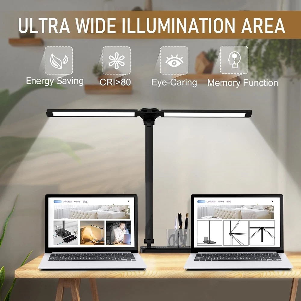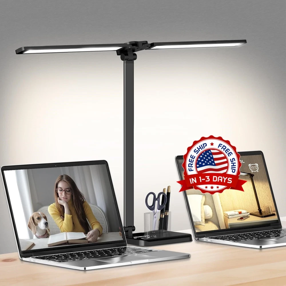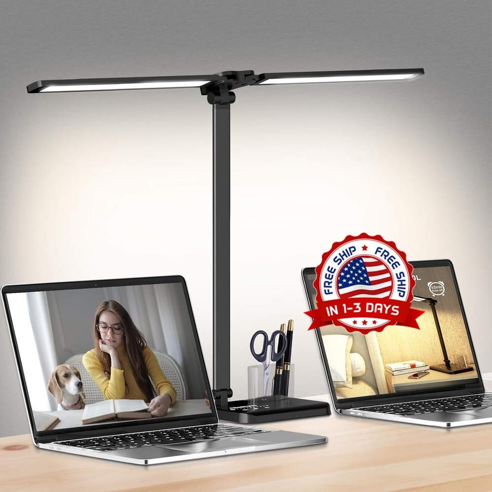 Lampara De Mesa Lampara LED Escritorio Ajustable Intensidad Oficina Casa USB New 【Lámpara de escritorio plegable y con área de iluminación más grande para el hogar de la oficina】La lámpara de escritorio LED tiene un diseño de doble cabezal, la dirección izquierda y derecha se puede extender 180 grados, la dirección arriba y abajo tiene un ángulo de giro de 90 grados, el brazo oscilante doble para brindarle un área de iluminación más grande. Esta lámpara de escritorio también es plegable y viene con un contenedor para bolígrafos, bueno para ayudar a ahorrar espacio en el escritorio. 【10 niveles de brillo y 5 temperaturas de color】Con 10 niveles de brillo y 5 temperaturas de color (3000K-6000K) - ¡Proporciona 50 modos de iluminación diferentes! Esta lámpara de escritorio le permite ajustarla según el entorno para satisfacer sus necesidades. 【Lámparas de escritorio LED que cuidan los ojos y control táctil sensible】Esta lámpara de escritorio cuenta con 76 perlas de lámpara de ahorro de energía que CRI (Ra)> 80%, la luz es uniforme y suave, sin parpadeo, sin deslumbramiento, sin sombras, lo que puede aliviar eficazmente la fatiga ocular y proteger sus ojos. Control sensible al tacto, sin botones complicados, simple y fácil de operar. 【Puerto de carga USB y ahorro de energía】(ADAPTADOR DE CA NO INCLUIDO) Con un puerto USB, puede cargar su teléfono al mismo tiempo cuando la lámpara está encendida. Base ABS, poste de aleación de aluminio. La luz de estudio de ahorro de energía es muy duradera y puede durar hasta 50.000 horas. 【Temporizador de apagado automático y función de memoria】Temporizador de apagado automático de 45 minutos para ayudarlo a dormir libremente sin preocuparse por quedarse dormido cuando lee un libro por la noche. La lámpara de mesa también tiene una función de memoria (excluyendo el modo de lectura) que encenderá automáticamente su último modo de luz y brillo.