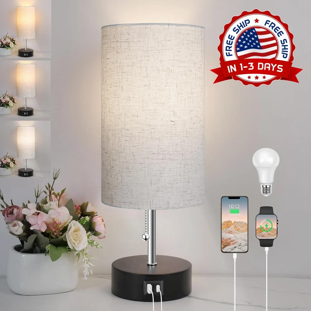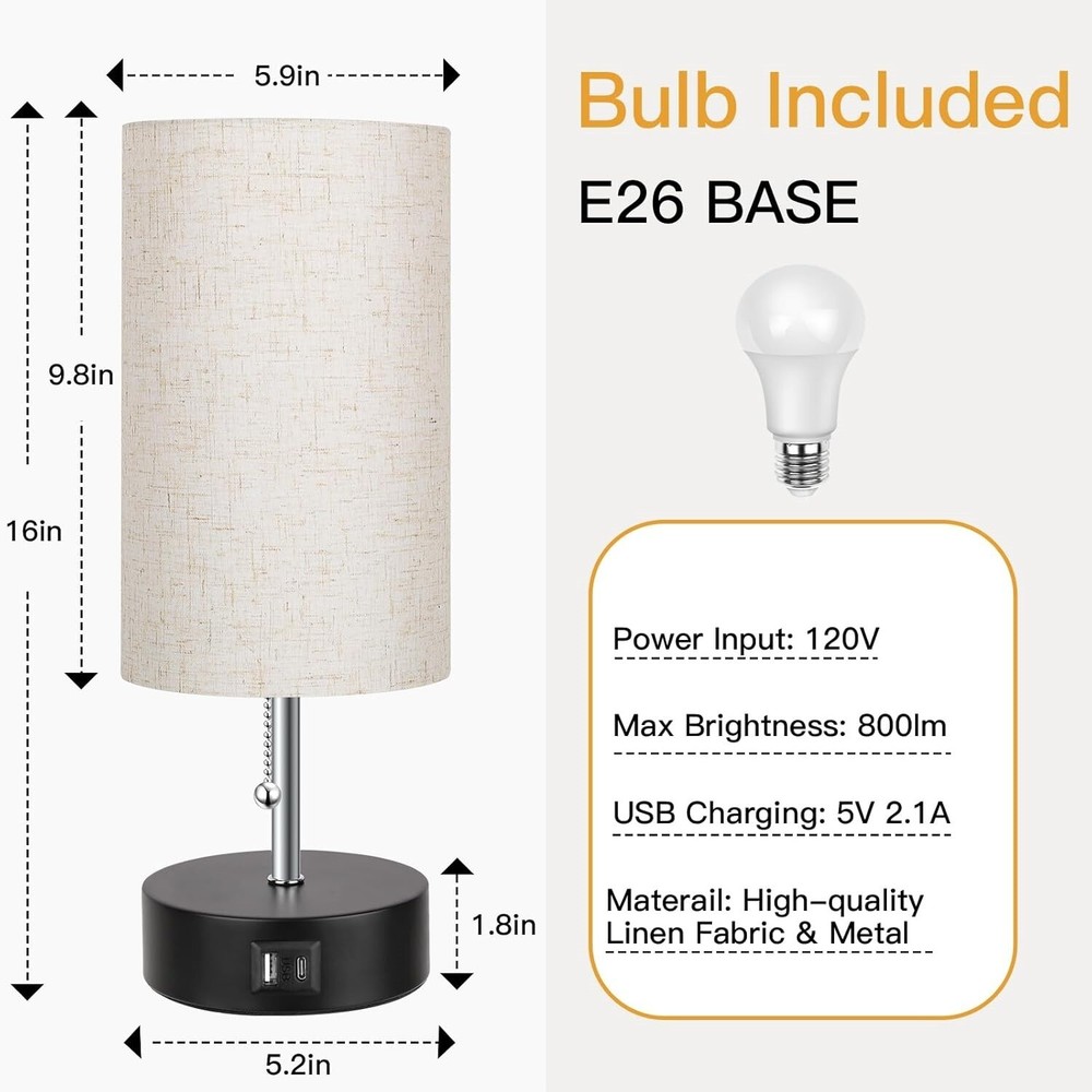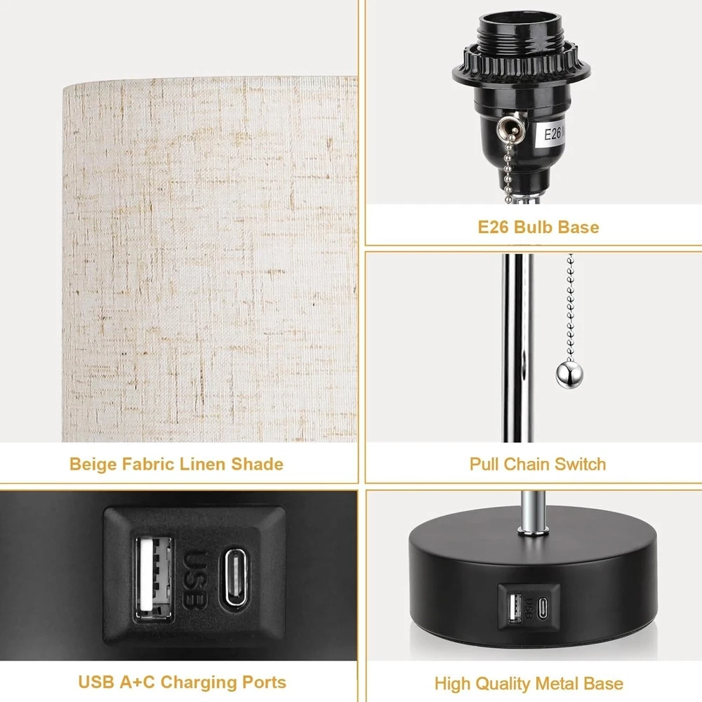 Lampara De Mesa Luces Modernas Mesita De Noche Puerto USB Sala Dormitorio Cocina 【Lámpara de dormitorio con 3 temperaturas de color】La pequeña lámpara de escritorio viene con una bombilla LED de 9 W, tiene 3 modos de temperatura de color (3000 K/4000 K/5000 K) que pueden satisfacer tus diferentes necesidades en diferentes escenarios. Puedes cambiar la luz tirando de la cadena. Los diferentes modos crean una atmósfera diferente. 【Puertos de carga rápida USB A y C】La moderna lámpara de mesa para dormitorio está equipada con puertos de carga USB A y C (5 V/2,1 A) para una carga rápida, cargando completamente tus teléfonos, humidificador, Kindle, auriculares, altavoz y otros dispositivos electrónicos. Y la mayor ventaja de nuestra lámpara de guardería es que, tanto si la lámpara está encendida como apagada, estos puertos de carga pueden seguir funcionando. 【Bombilla LED gratuita incluida】Para tu comodidad, hay una bombilla gratuita en el paquete para evitarte la molestia de comprar una bombilla. La bombilla emite una luz de 3000K/4000K/5000K 800LM con un consumo de solo 9 vatios, lo que ahorra mucha energía y es respetuoso con el medio ambiente, lo que le permite ahorrar mucho en las facturas de electricidad. Lo más importante es que la bombilla no parpadea, no produce mareos y puede proteger sus ojos de manera eficiente. 【Diseño minimalista para el hogar】 La lámpara de mesa USB con un diseño minimalista la convierte en un complemento perfecto para su hogar. La pantalla de tela y la base de metal negro son perfectas para decorar cualquier lugar de su casa. Es una excelente opción llevar esta lámpara de mesita de noche como regalo para sus amigos y familiares. Una lámpara de noche perfecta para sala de estar, dormitorio, sala de estudio, habitación de niños, estudio, guardería. 【Brillo que protege los ojos】 La pantalla gris es elegante y resistente, y también puede suavizar la radiación de la luz para proteger sus ojos y darle a su dormitorio un tono suave. Nuestra pequeña lámpara de mesa crea una sensación agradable y reconfortante en la casa cuando pasa tiempo con su familia, ya que la pantalla de tela de lino suaviza la luz y la hace mejor para proteger sus ojos.