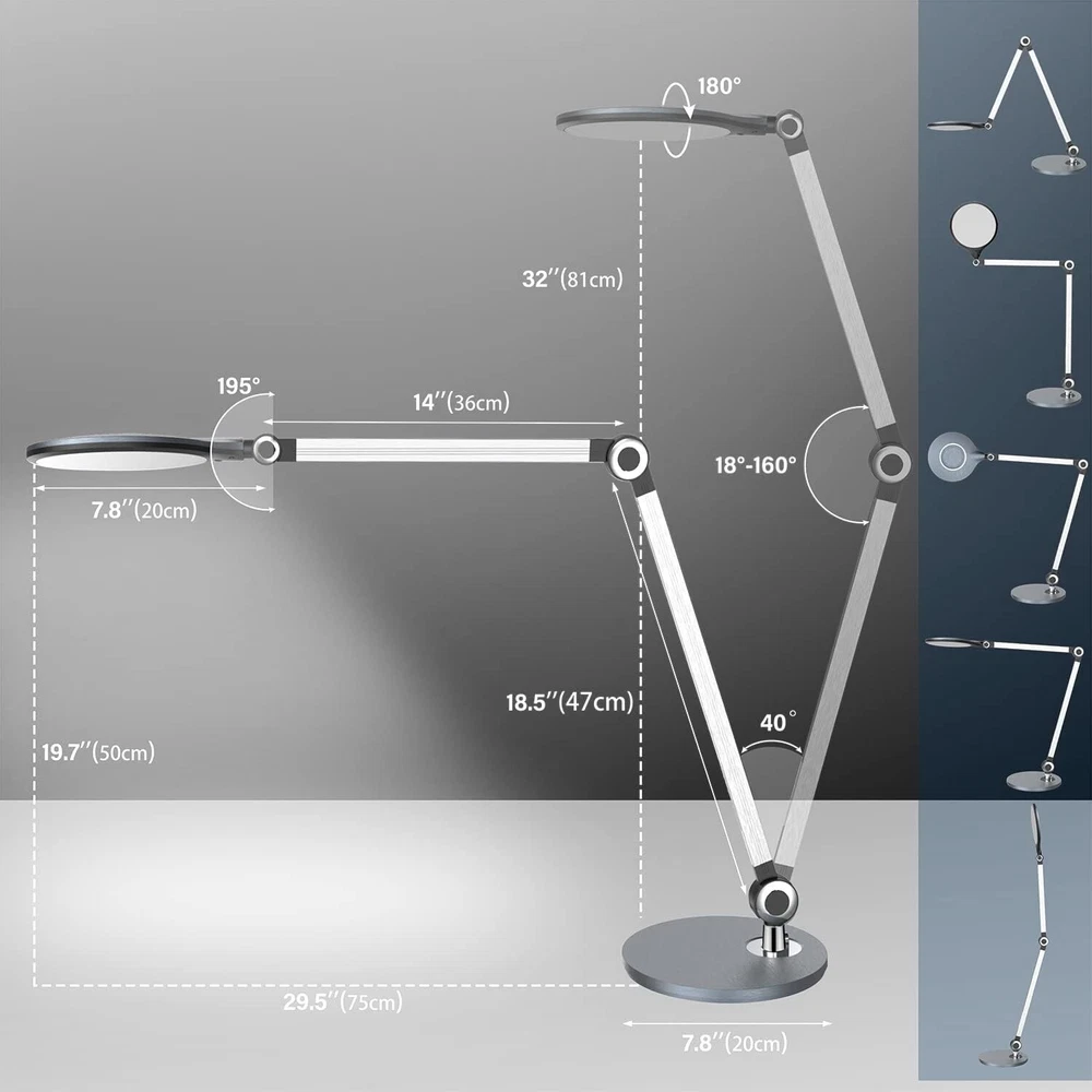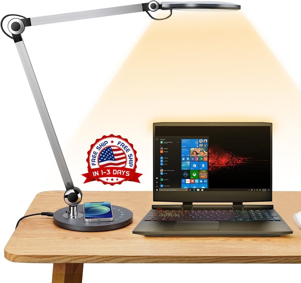 Lampara Para Mesa Mesita De Noche Escritorio De Bateria Recargable Portatil NEW Lámpara de oficina de calidad superior: la matriz de 120 LED hace que la luz sea más uniforme y brillante. Aunque es más cara que otras lámparas de escritorio, vale la pena. Líneas exquisitas y suaves, apariencia hermosa, 15 tipos de luces, larga vida útil, una de las opciones de regalos de alta gama. Lámpara de mesa multifuncional: esta lámpara de escritorio LED con carga inalámbrica puede cargar rápidamente dispositivos iPhone y Samsung compatibles. Los modos de brillo regulables continuamente y las 3 temperaturas de color son perfectos para leer, trabajar en la oficina, pensar, relajarse, dibujar, tejer, coser, pasatiempos. El brazo oscilante y el cabezal giratorio brindan la luz adecuada desde cualquier posición, LA FUNCIÓN DE MEMORIA recuerda la última configuración de iluminación. Lámpara de escritorio con iluminación de protección para los ojos: toque el interruptor de la lámpara de escritorio, puede ajustar 3 temperaturas de color y cada modo de color tiene 5 niveles de brillo. Luz blanca 6000 K/luz natural 4500 K/luz cálida 3000 K. La lámpara de mesa emitirá luz sin parpadeos. que ilumina tu espacio sin dañar tus ojos. Iluminación ideal para estudiar, leer y trabajar. Ajuste multiángulo y diseño de control táctil: ajuste flexible de varios ángulos para satisfacer las necesidades de iluminación en diferentes escenarios. El diseño del iluminador circular hace que la luz sea más concentrada y brillante, buena para estudiar y trabajar. También puedes configurar los niveles de brillo simplemente deslizando ligeramente el panel táctil. Vida útil de 50.000 horas: la construcción de aleación de aluminio de primera calidad actúa como disipador de calor pasivo, protege y prolonga la vida útil del LED. Nuestra lámpara de mesa está diseñada para durar más de 50.000 horas. Consumo de energía del 20% como lo hace una bombilla incandescente.