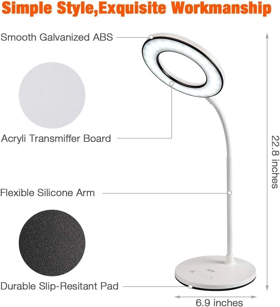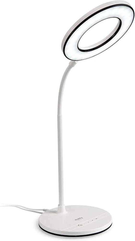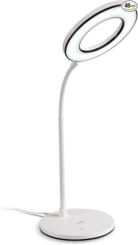 Lampara led para escritorio de uñas para mesa maquillaje lectura estudiar luz US About this item Comfortable & Adjustable Brightness:Designed with 48 LED bulbs (48lumen), which gives out natural and non-flickering light that won't hurt or strain your eyes. And there are 12 light modes, you can adjust the brightness and the temp simply by touching the switch. 360° Flexible Goose Neck: designed with a soft, durable and 360 degrees rotatable goose neck, easier to adjust the lighting direction to your working area at will without harsh sound. Round Design: The table lamp uses a special ring design, the light is more uniform than the solid,no dizzy light, no shadow and soft light,, so that your eyes no longer tired, study for long time. Modern Design: Naturally fit your desk, room , living room and office; rotatable lamp head, made from durable plastic with 48 LEDs, cool and modern desk light. Worry-Free Warranty:We back our lights with an 12-month warranty and promise quick respond customer support.