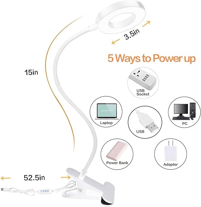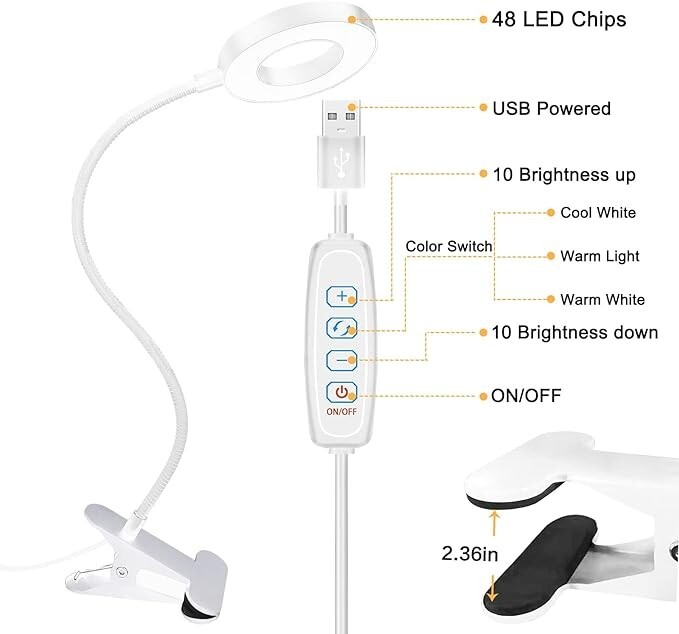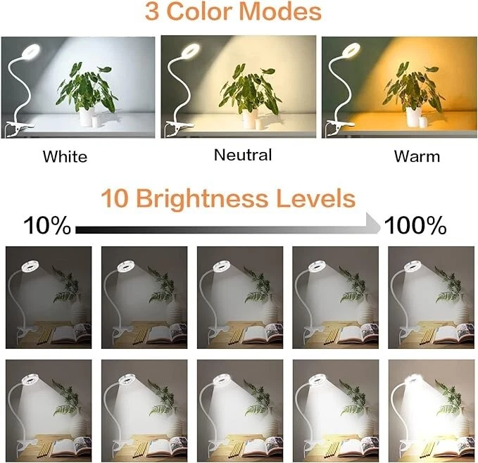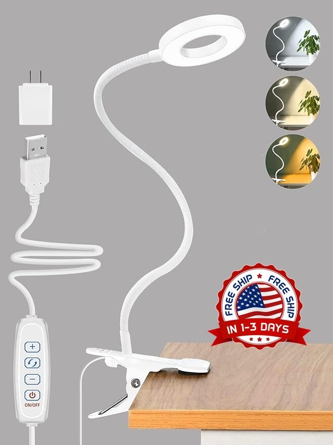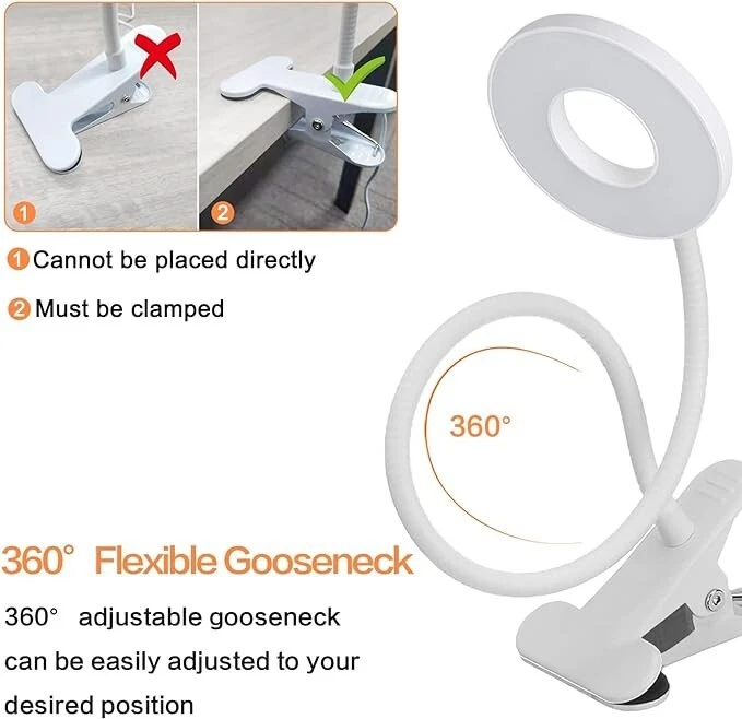 Lampara led para escritorio de uñas para mesa maquillaje lectura estudiar luz Acerca de este artículo 【30 opciones de brillo y práctica luz de lectura】La lámpara de cuello de cisne tiene 3 temperaturas de color (luz cálida, blanco cálido, blanco frío), cada una con 10 niveles de brillo, lo que equivale a 30 modos para satisfacer sus necesidades de iluminación en diferentes entornos. La luz cálida puede crear una atmósfera más cálida y tranquila, perfecta para dormir o relajarse por la noche. La luz de color blanco frío es más adecuada para trabajar, leer o estudiar. 【Protección ocular y función de memoria】La luz de clip utiliza tecnología luminosa avanzada. Los 48 chips LED incorporados garantizan una luz estable sin parpadeos y bloquean el 99,95 % de la luz azul, que es perjudicial para los ojos humanos. El diseño del anillo de luz garantiza que se ilumine sin sombras. Nuestra lámpara de cama admite la función de memoria de apagado, que puede restaurar su último modo de iluminación y ayudarlo a recordar el color y el brillo de la luz, lo que le facilita mantener sus hábitos de iluminación. 【Cuello de cisne flexible de 360° y clip resistente】El cuello de cisne flexible de 360° te permite ajustar y dirigir fácilmente la luz a donde quieras. El resistente clip de metal se abre a 2,36 pulgadas y también es muy portátil para fijarlo en un escritorio, mesa, tocador, cabecera, computadora y otros lugares. El diseño del anillo es ideal para una mejor disipación del calor y disfrutar de un área luminosa más grande. 【Alimentación por USB (adaptador incluido) y LED de ahorro de energía】La luz de escritorio LED tiene un cable USB de 52,5 pulgadas y un adaptador. La interfaz USB se adapta a una variedad de opciones de alimentación, como computadora portátil, computadora de escritorio, computadora, toma USB, banco de energía, adaptador USB, etc. Nuestra lámpara de escritorio con clip es un 80% más eficiente energéticamente que las lámparas incandescentes tradicionales, lo que significa facturas de electricidad reducidas. . 【Amplia aplicación y servicio posventa】La lámpara de pinza se puede utilizar ampliamente para leer, dormir, trabajar, estudiar, manicura, tatuajes, maquillaje, videoconferencias, etc.