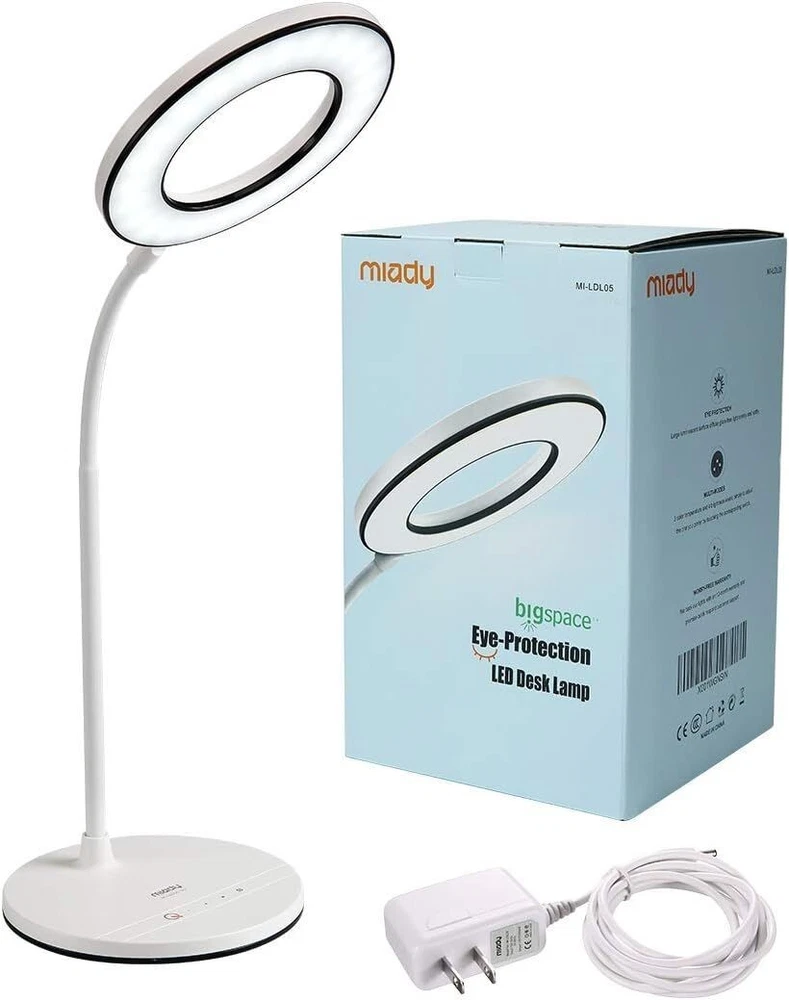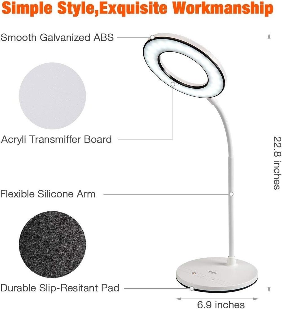 Finish Type Painted Base Material Plastic Product Dimensions 5"D x 3"W x 6"H Item Weight 2.1 Pounds Lamp Type Desk Lamp About this item Comfortable & Adjustable Brightness:Designed with 48 LED bulbs (48lumen), which gives out natural and non-flickering light that won't hurt or strain your eyes. And there are 12 light modes, you can adjust the brightness and the temp simply by touching the switch. 360° Flexible Goose Neck: designed with a soft, durable and 360 degrees rotatable goose neck, easier to adjust the lighting direction to your working area at will without harsh sound. Round Design: The table lamp uses a special ring design, the light is more uniform than the solid,no dizzy light, no shadow and soft light,, so that your eyes no longer tired, study for long time. Modern Design: Naturally fit your desk, room , living room and office; rotatable lamp head, made from durable plastic with 48 LEDs, cool and modern desk light. Worry-Free Warranty:We back our lights with an 12-month warranty and promise quick respond customer support.