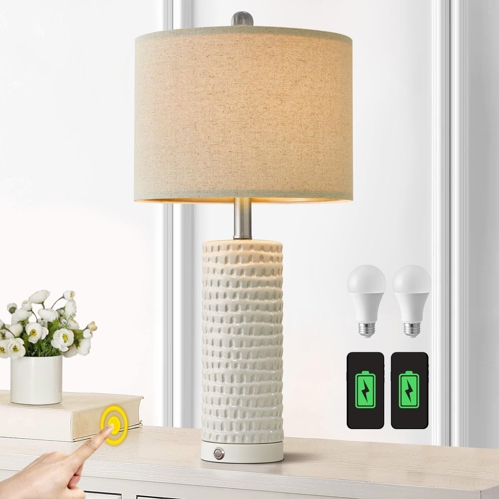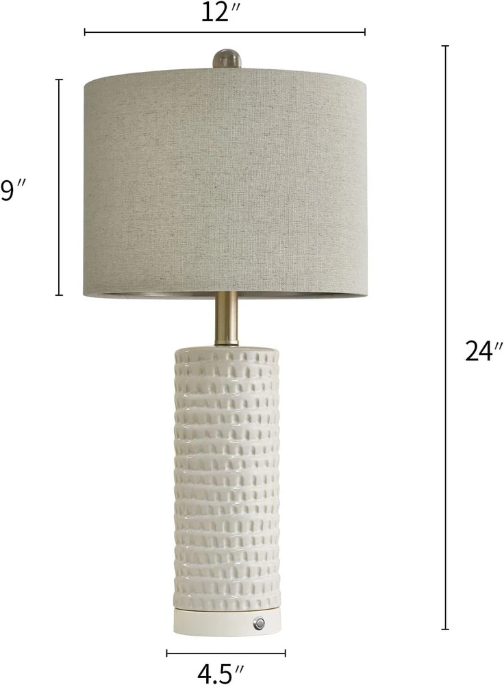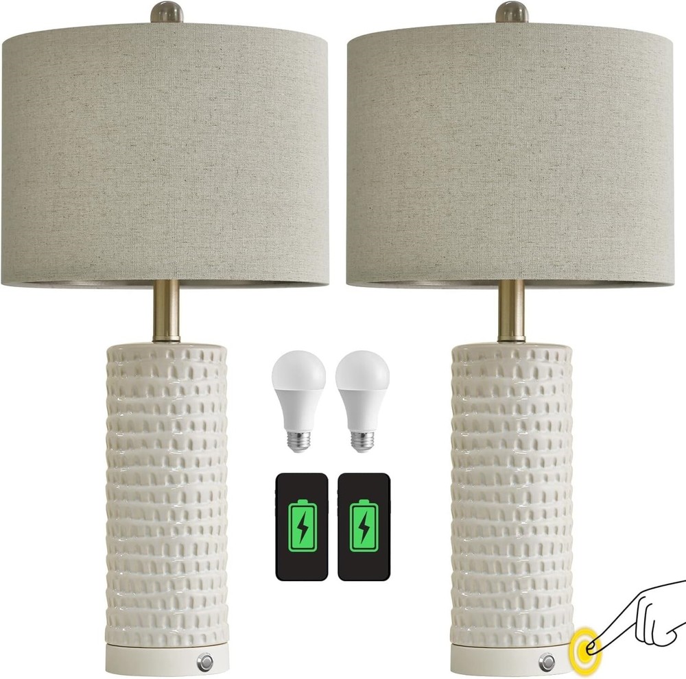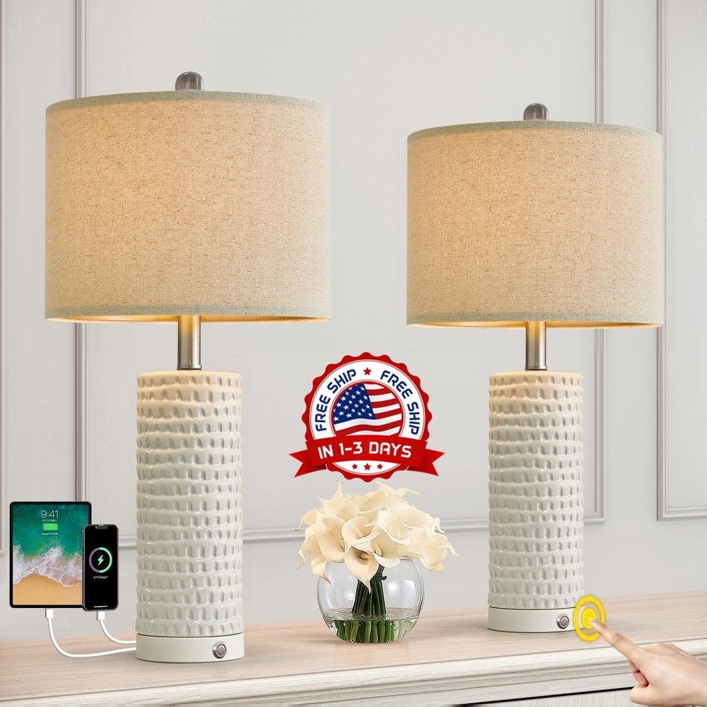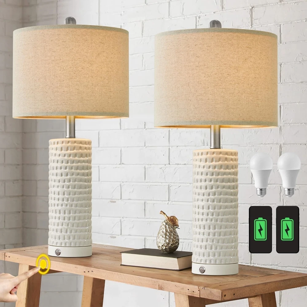 Lamparas De Mesa De Noche Con Lampara Para Escritorio Dormitorio Sala 24'' NUEVO Juego de 2 lámparas de mesa táctiles regulables de 3 vías: diseñadas con control táctil, nuestro juego de 2 lámparas te permite tocar el interruptor de control táctil de la base para ajustar el brillo de 3 niveles (bajo, medio, alto) y encenderlo. apagado. Puede librarte de la molestia de tocar el interruptor en la oscuridad, especialmente cuando te despiertas en mitad de la noche, perfecto para la mesita de noche, la mesa de la esquina, el escritorio, la mesa de café y la mesa del comedor. (2 bombillas regulables incluidas) 【Prácticos puertos de carga USB A+C】: esta lámpara de noche de mesa contiene puertos de carga USB A+C para que puedas cargar tus teléfonos móviles, Kindle, Apple Watch, tabletas, portátiles y otros dispositivos electrónicos. El puerto USB funciona independientemente de si la lámpara está encendida o apagada. Crea más comodidad para tu vida. ((Es necesario ensamblar las pantallas de las lámparas). 【Decoración y regalo perfectos】: la lámpara de noche de diseño clásico y elegante será un buen adorno doméstico. Regalo perfecto para su familia o amigos en cumpleaños, Navidad, Año Nuevo y otros días de celebración. 【SEGURIDAD】 En términos de calidad del producto, hemos seguido un sistema de altos estándares para limitar cada proceso de producción, para garantizar que cada lámpara cumpla con los estándares nacionales de calidad y seguridad.