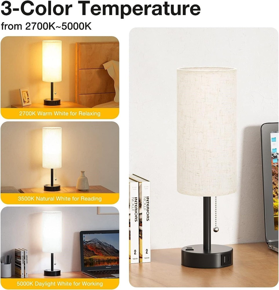 Lamparas De Mesa De Noche Con Puerto USB Lampara Para Escritorio Dormitorio Sala 【3 modos de color e interruptor de cadena】Este juego de 2 lámparas para dormitorio controla el brillo con una cremallera de alta calidad y viene en 3 modos de color: blanco cálido, blanco natural y blanco luz diurna (2700 K, 3500 K, 5000 K). Simplemente tira de la cremallera de la lámpara de la mesita de noche y puedes elegir diferentes modos para crear diferentes atmósferas para satisfacer tus necesidades diarias. En comparación con las lámparas de noche táctiles, nuestra lámpara de mesa con cadena no tiene que preocuparse por toques accidentales. 【USB C+A y salida de CA mejoradas】Esta lámpara de mesa está diseñada con un puerto de carga USB-C (5 V/2,1 A), un puerto de carga USB-A y una salida de CA de 2 clavijas en la base de la lámpara de mesa lateral. Puedes cargar tres dispositivos a la vez, perfecto para cargar teléfonos, Kindle, Pad, difusores de aromaterapia y otros dispositivos eléctricos. El puerto USB y la salida funcionan tanto si la lámpara pequeña está encendida como apagada. 【Dos bombillas LED E26 incluidas】No es necesario comprar bombillas para lámparas de dormitorio por separado. Para combinar perfectamente con la lámpara de noche de 3 temperaturas de color, hemos preparado bombillas LED especialmente. Nuestra lámpara de noche no parpadea, no deslumbra ni emite sonido cuando la usa. El blanco cálido de 2700 K es perfecto para relajarse, el blanco natural de 4000 K es perfecto para leer, el blanco de luz diurna de 5000 K es perfecto para trabajar o jugar. Amplia aplicación y regalo ideal: nuestro juego de 2 lámparas de dormitorio para mesita de noche está hecho de una base de metal negro resistente y una pantalla de tela de lino beige de alta calidad. Es lo suficientemente elegante como para ser perfecto para la decoración de su hogar moderno, minimalista o vintage. Puede colocar esta lámpara de mesa auxiliar en cualquier lugar que desee iluminar, como habitaciones de invitados, dormitorios, oficinas, cuartos de repuesto, guarderías, mesitas de noche, mesas de sofá, mesas de café, caravanas y más. 【Fácil Instalación】La instalación de esta lámpara de noche es muy sencilla, solo 4 pasos para conseguir una hermosa lámpara con puerto usb y toma de corriente en muy poco tiempo.