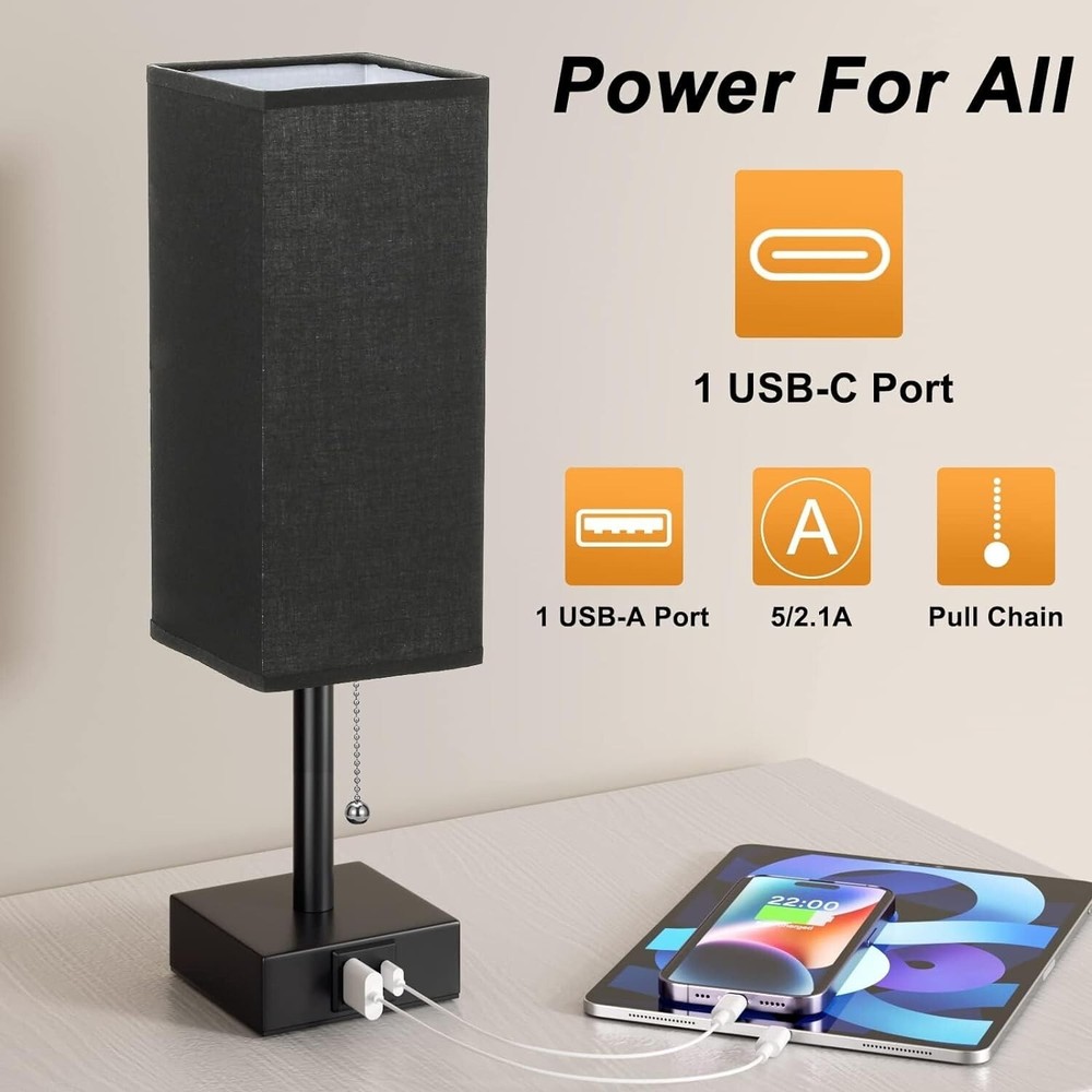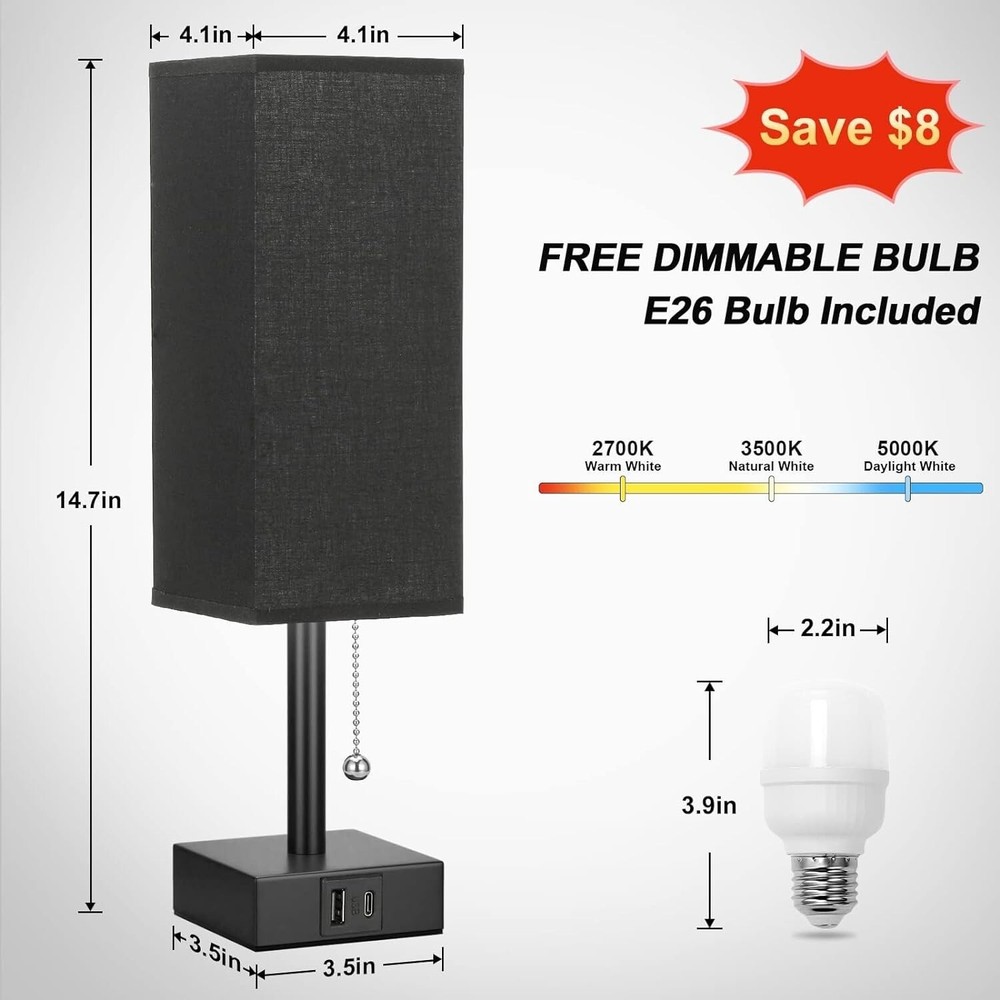 Color Black Shade Black Base Product Dimensions 3.5"D x 8"W x 14.7"H Special Feature 3CCT, Corded About this item 【💡Bedside Table Lamp with 3 Color Modes】 Bedroom lamp comes with a stylish pull chain to control the lamp, you can easy to adjust 3 color temperatures: warm light, natural light and cool white(2700K, 3500K, 5000K) or turn on/off the light by pulling the chain, even in the darkness. Different Modes creates a different atmosphere to meet your daily needs. 【💡Upgraded Small lamp with USB C+A Ports】Table lamp for bedroom built in USB C & USB ports (5V/2.1A)for fast charging, can charge your phone, kindle, tablet, watch and other devices no matter the side lamp is on or off. 【💡Save $8 Free Dimmable LED Bulb Included】To save you from troubles in finding right bulb to match, the USB lamp comes with E26 base 2700K,3500K,5000K LED bulb, giving off stable warm/natural/daylight light protecting your eyes.2700K perfect for sleeping and nursing, 3500K suitable for reading and playing, 5000K perfect for working. 【💡Small Table Lamp for Lighting and Home Decor】Black lampshade and black lampbase are available in designs ranging from contemporary to retro. Bedside lamps meet the lighting requirements and can also decorate the home well. Simple shape and functions are great for daily lamp lighting or as a decoration in your home. Perfect choice for a gift for your family, and friends. 【💡Good Quality and No-worry Buy】Our lamps are made with a heavy solid base and quality fabric shade, each product has been well tested by the manufacturer to ensure a high-quality product before being shipped. Provide 90-Day Money Back Guarantee and 3 Months Warranty. Please feel free to contact us if you have any problem with the table lamp.