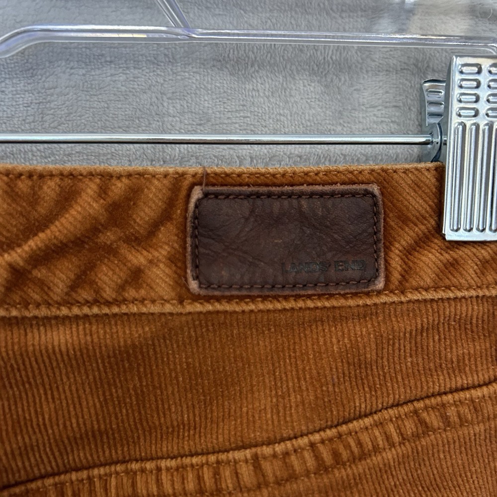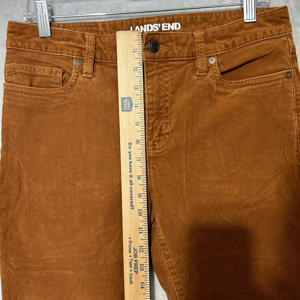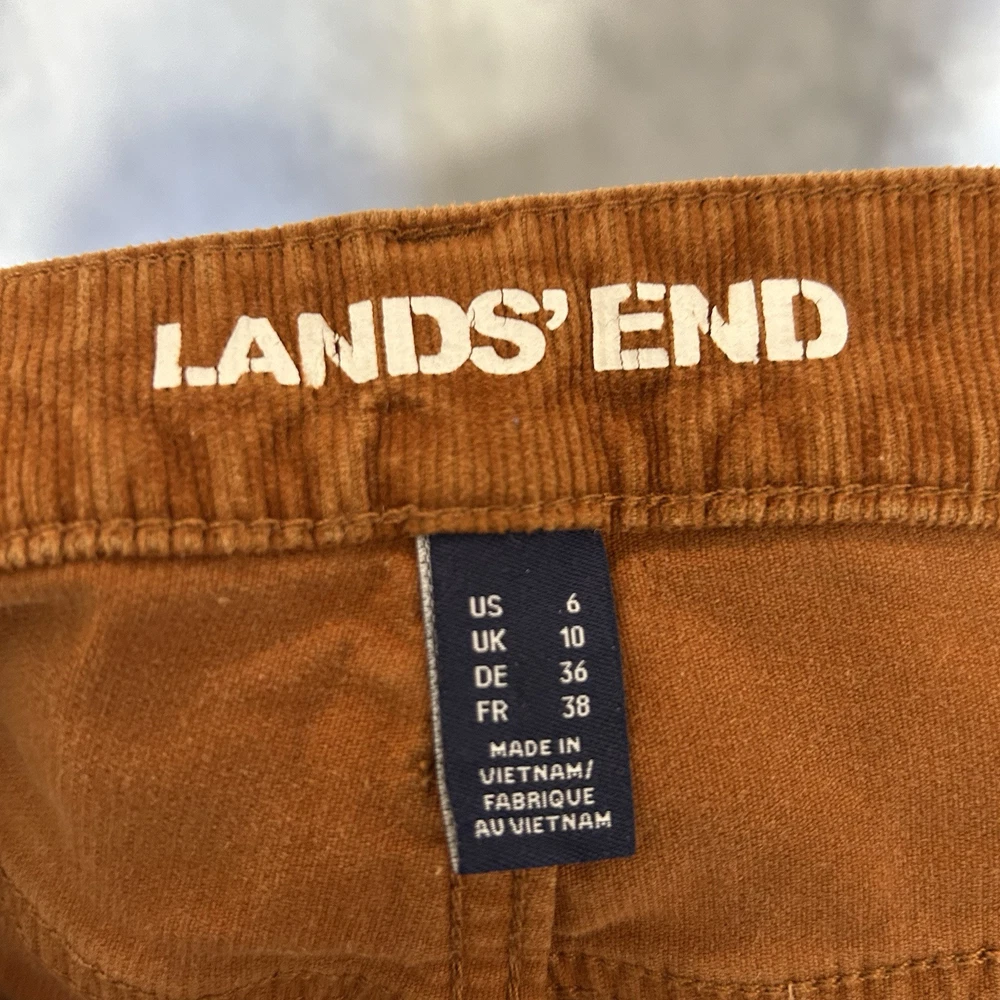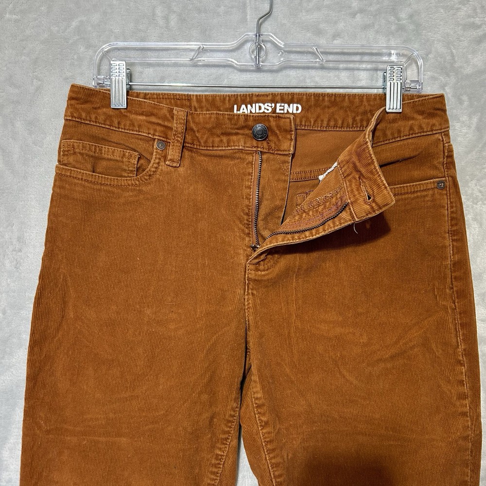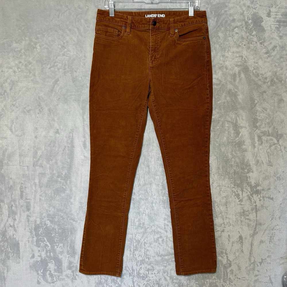 These orange corduroy pants from Lands' End are a size 6 with a mid-rise and straight leg fit. They feature a button closure, flat front, and zipper accents. Made of cotton with a stretch fabric, these chinos offer comfort and style, suitable for travel, casual, or business occasions in fall, winter, or spring. Perfect for a preppy look, they have pockets and are designed for women. Made in Vietnam.