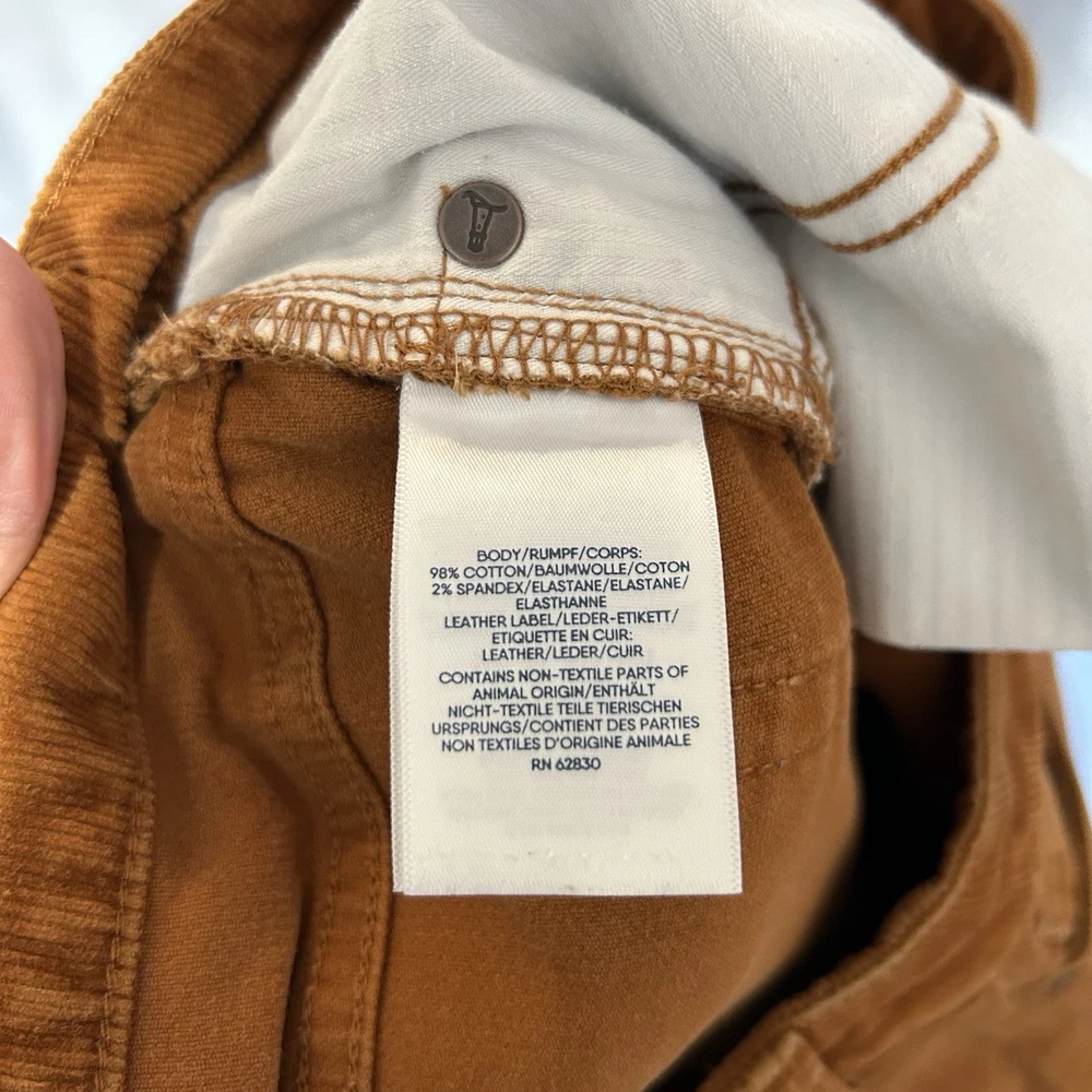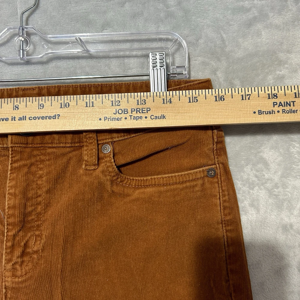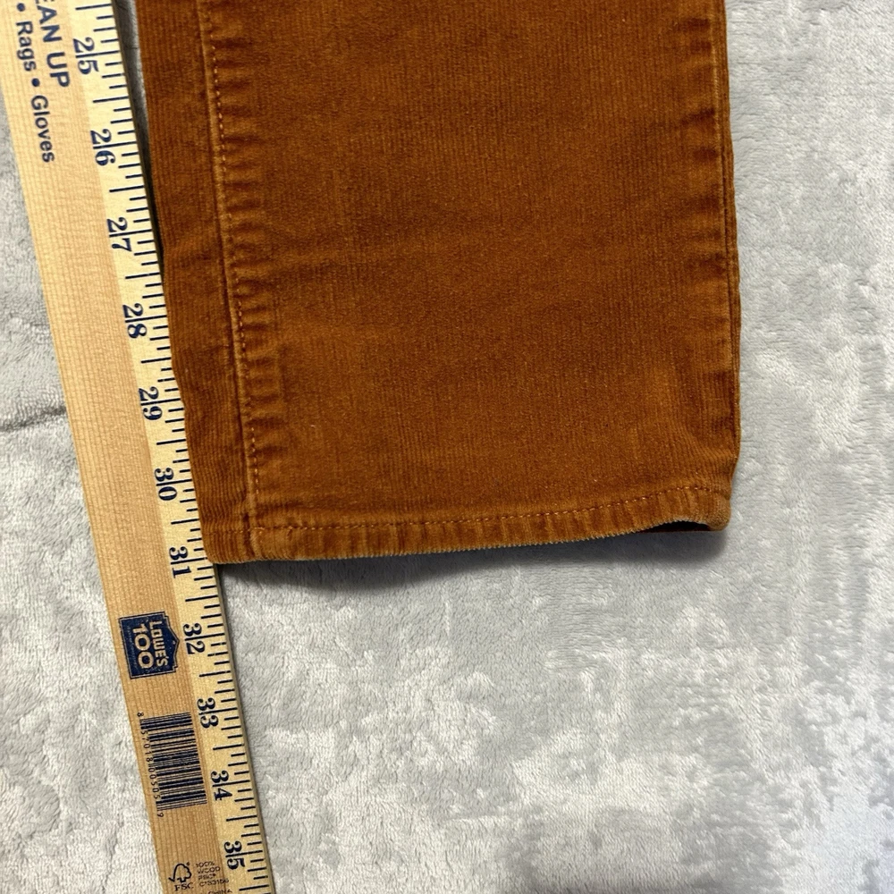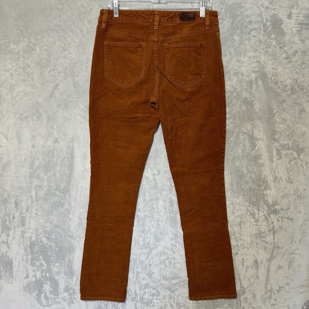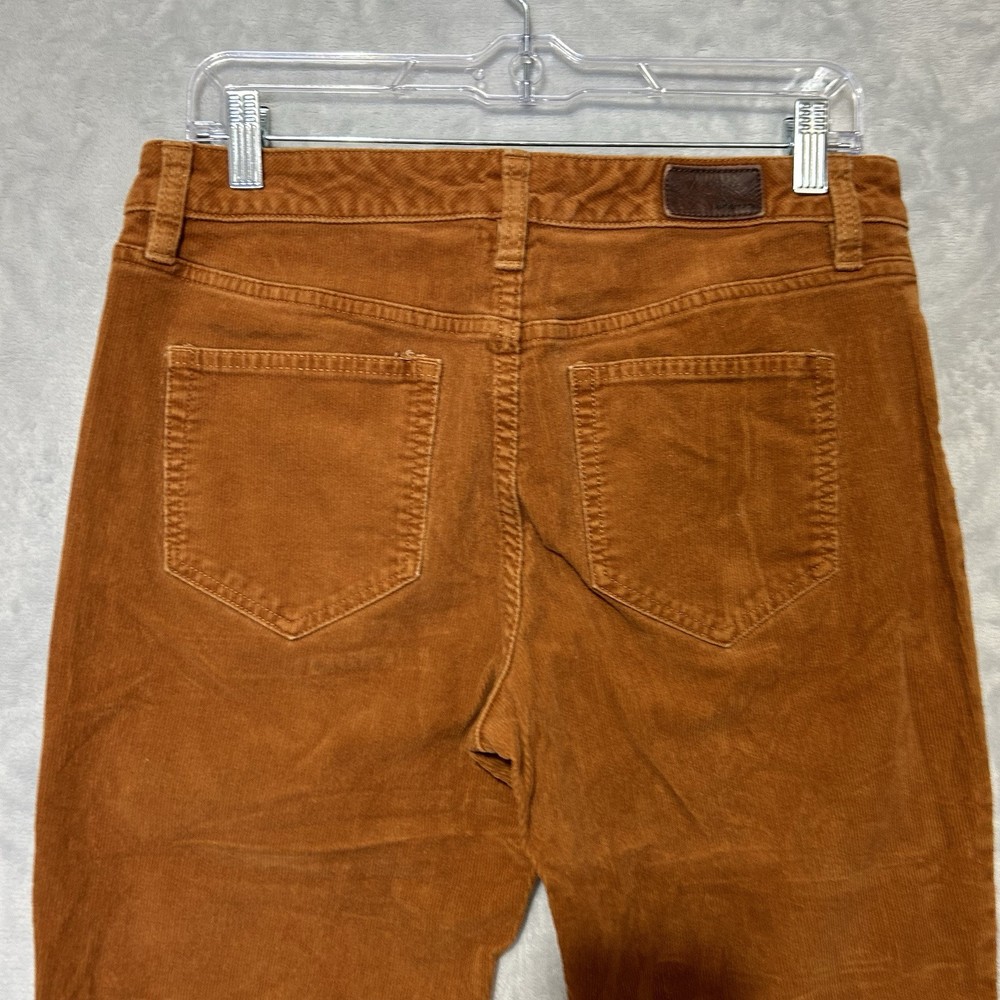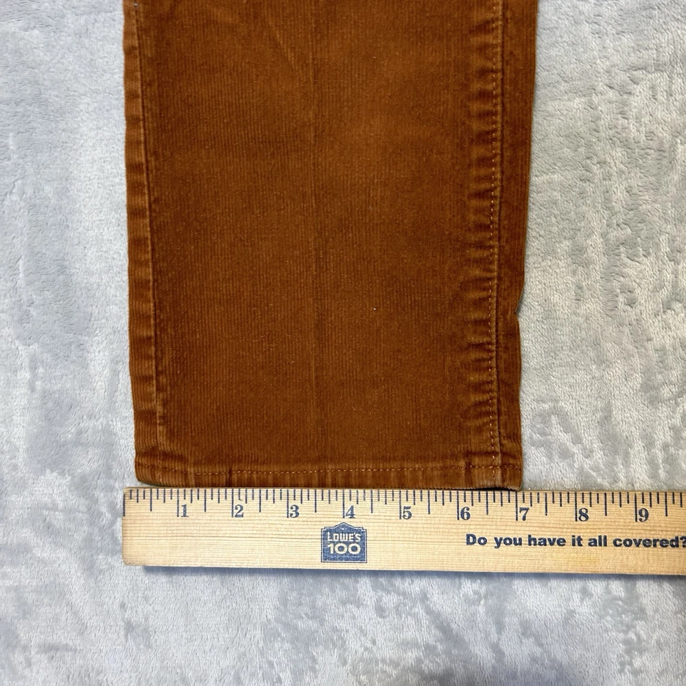 These orange corduroy pants from Lands' End are a size 6 with a mid-rise and straight leg fit. They feature a button closure, flat front, and zipper accents. Made of cotton with a stretch fabric, these chinos offer comfort and style, suitable for travel, casual, or business occasions in fall, winter, or spring. Perfect for a preppy look, they have pockets and are designed for women. Made in Vietnam.