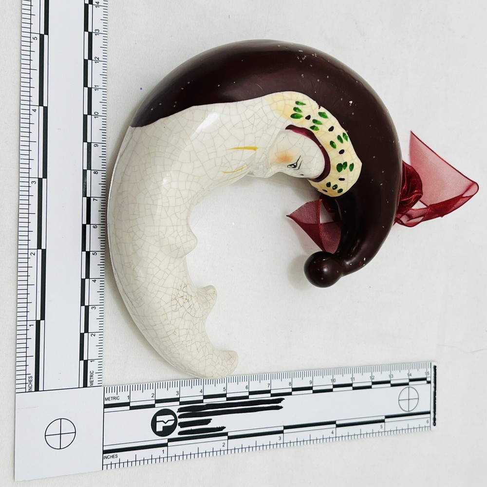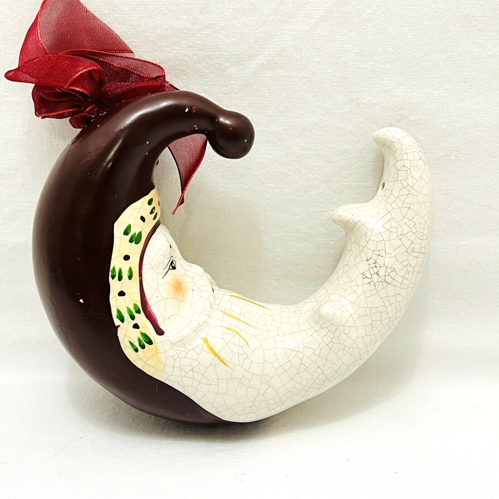 Stunning and immaculate Santa Moon ornament from Creativeco-op that is approximately 5 x 5 inches in size. This is a ceramic handpainted ornament that has been purposefully cracked to create a unique antique look. This is a heavy ornament.
