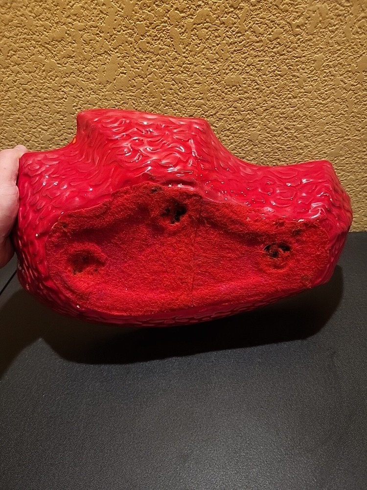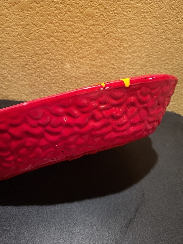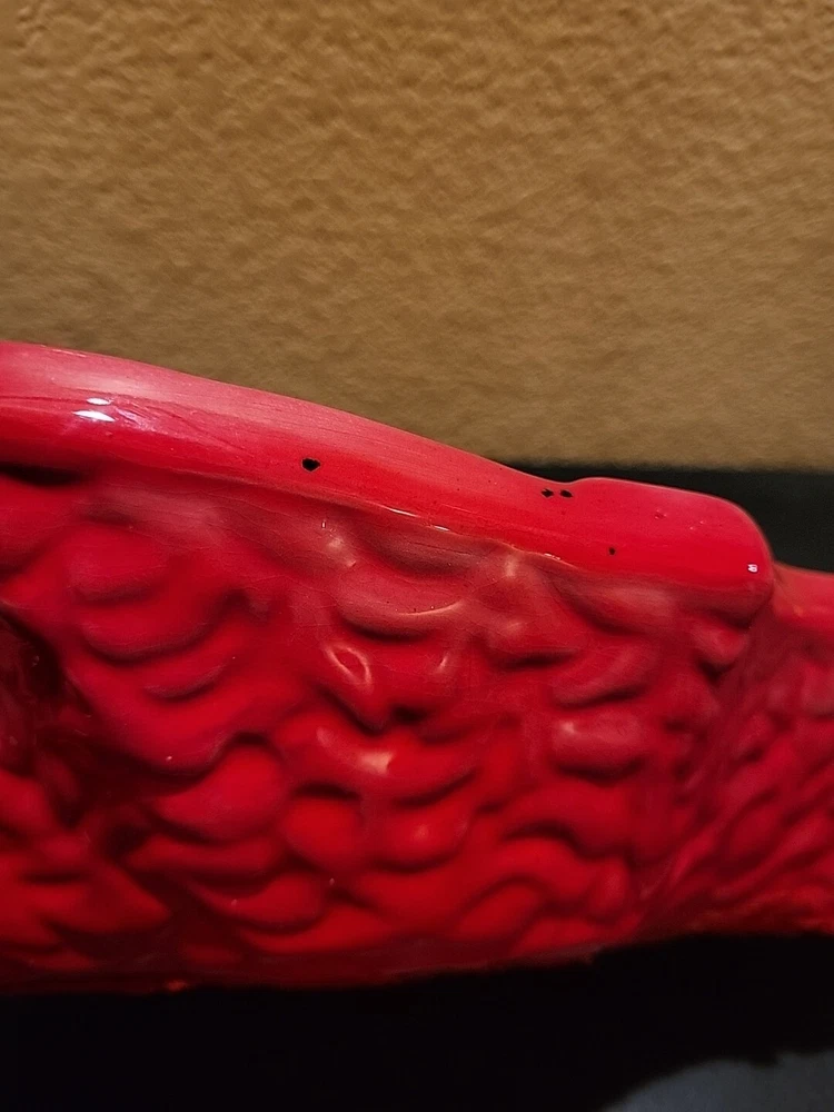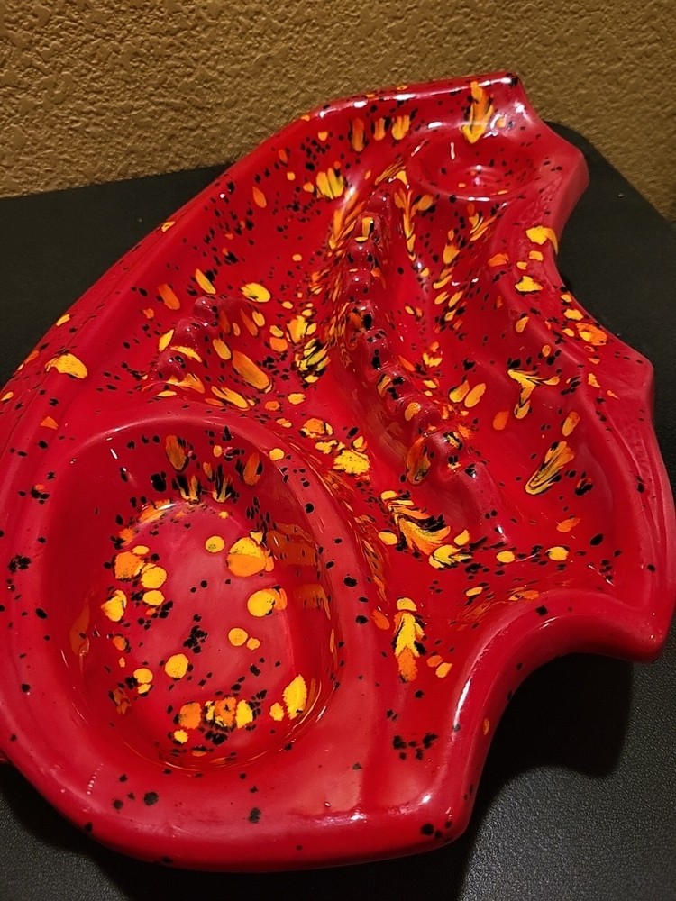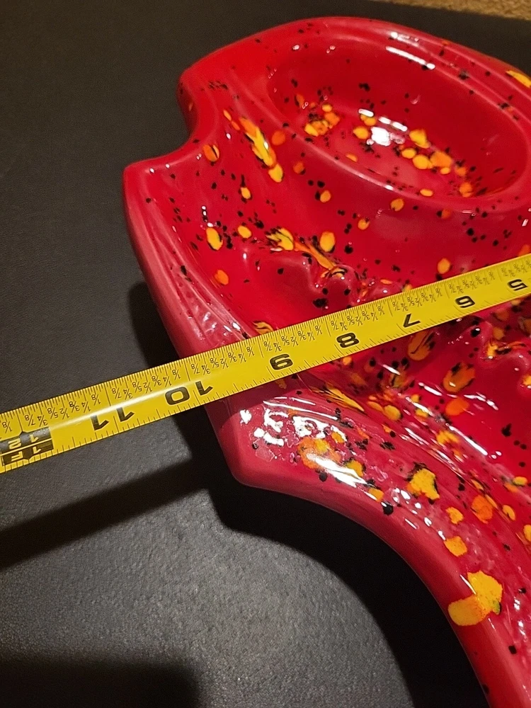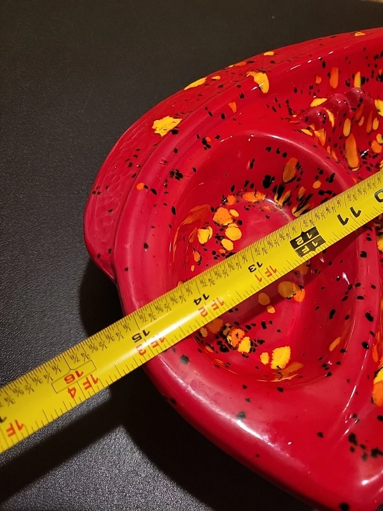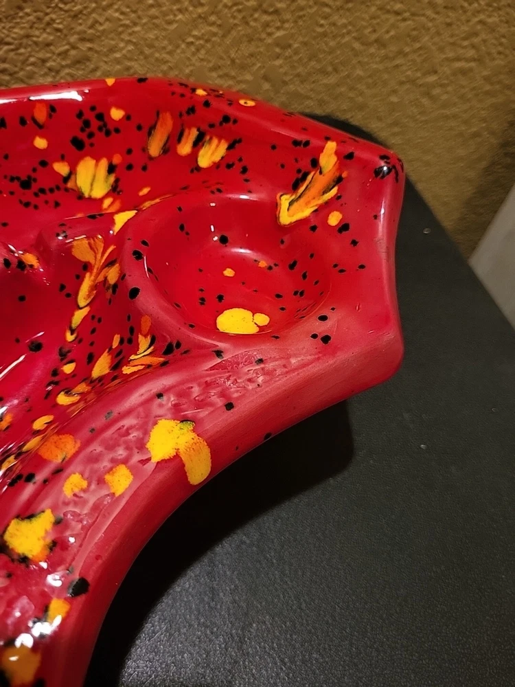 This is a large retro ashtray. It has some places where the red is a little thin and you can see the ceramic white coming through. No chips or cracks.