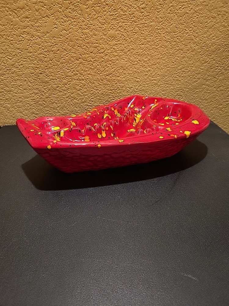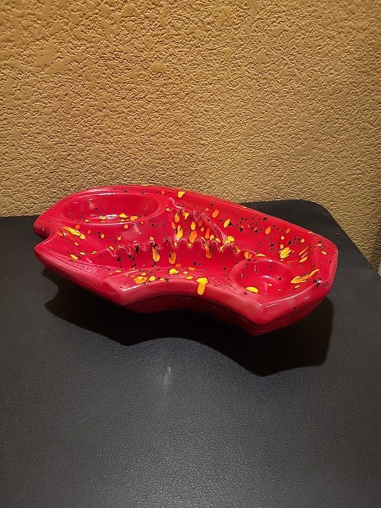 This is a large retro ashtray. It has some places where the red is a little thin and you can see the ceramic white coming through. No chips or cracks....