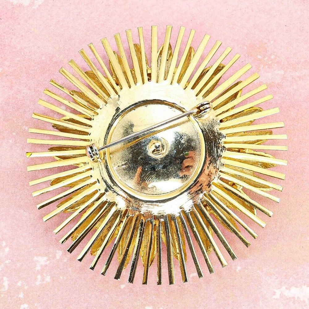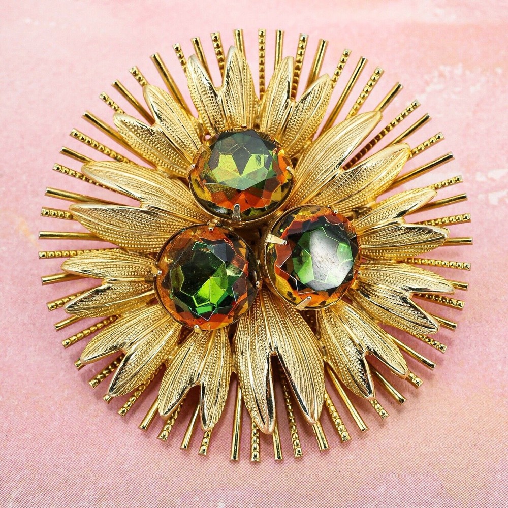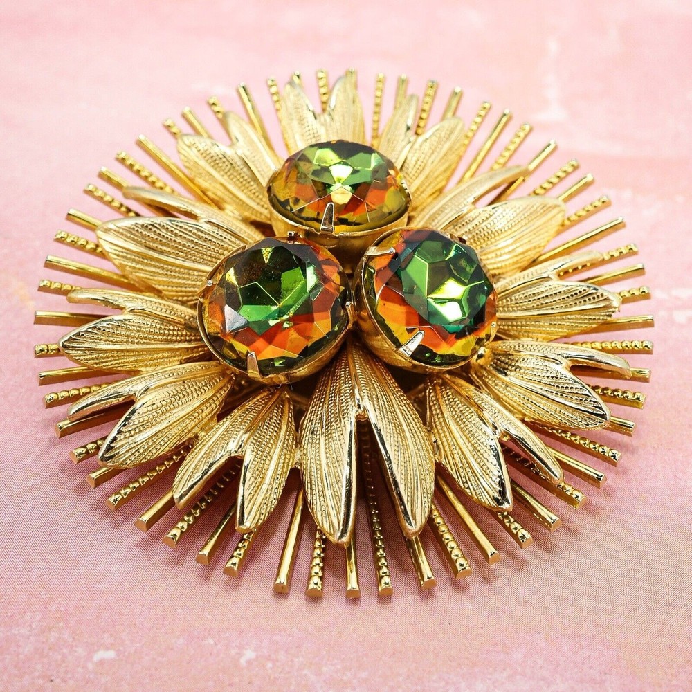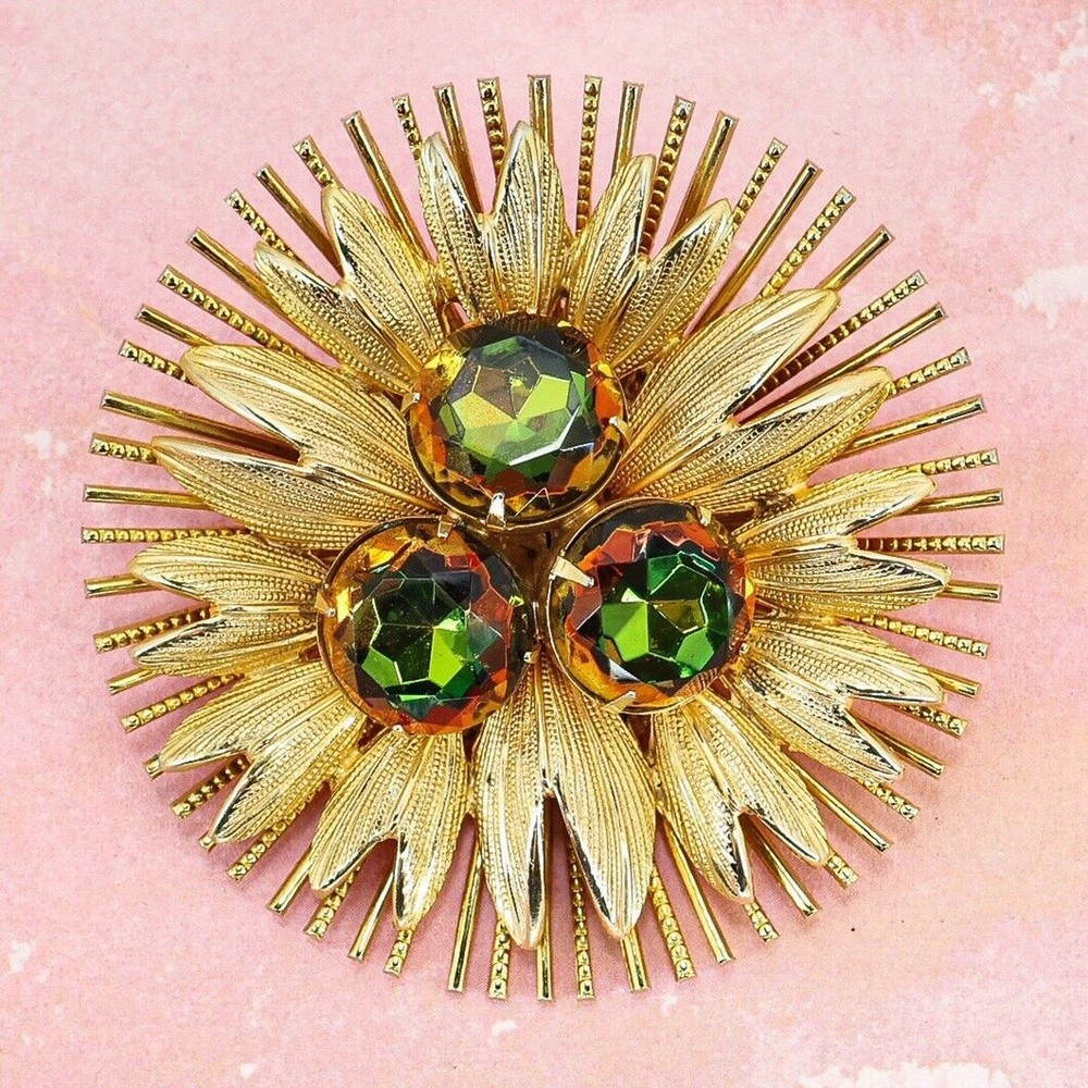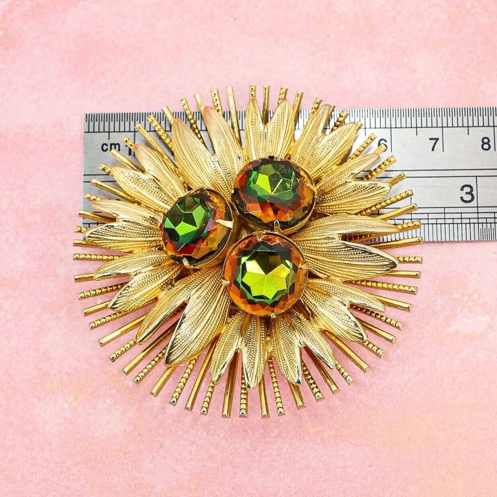 <![CDATA[<div>Large Mid Century Starburst / Flower Brooch Dichroic Vitrail Green / Orange Glass Stones...