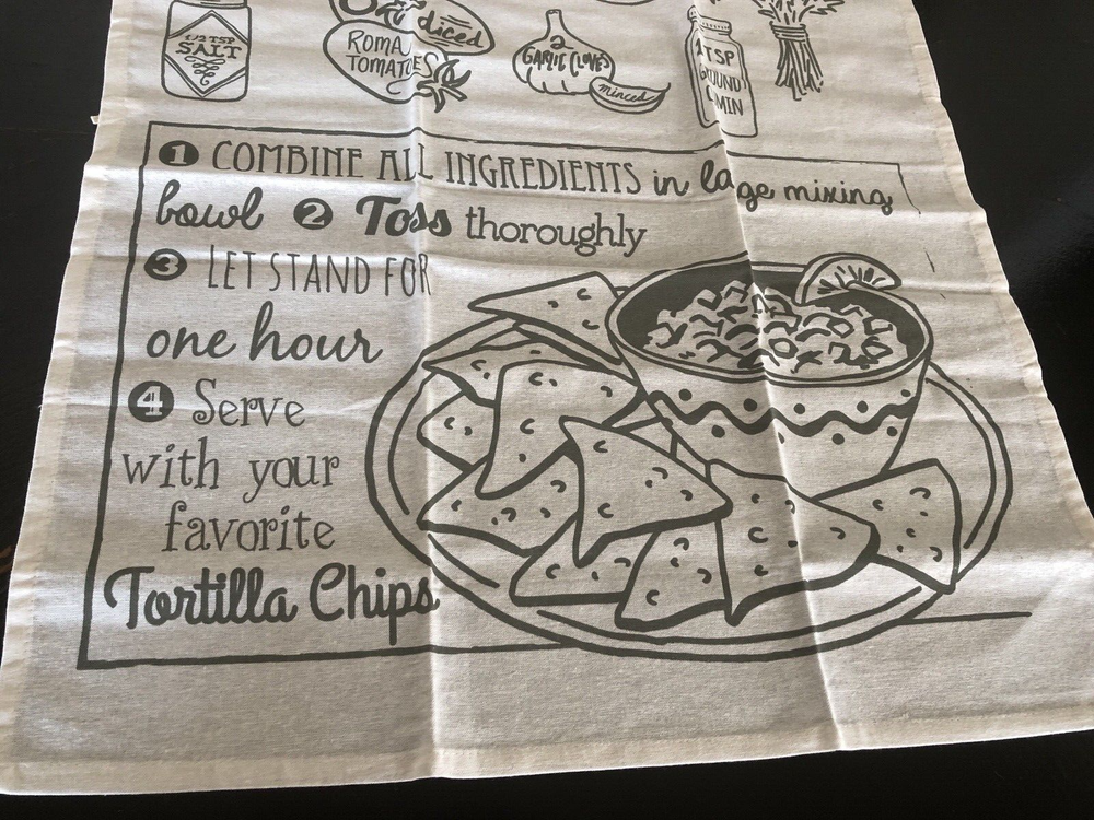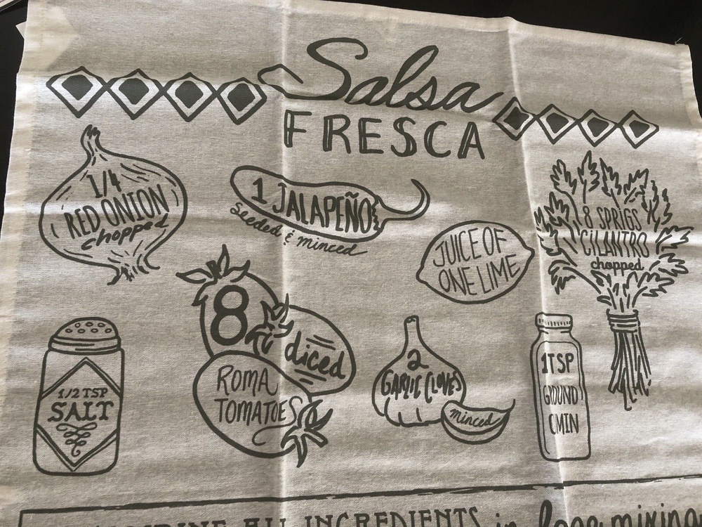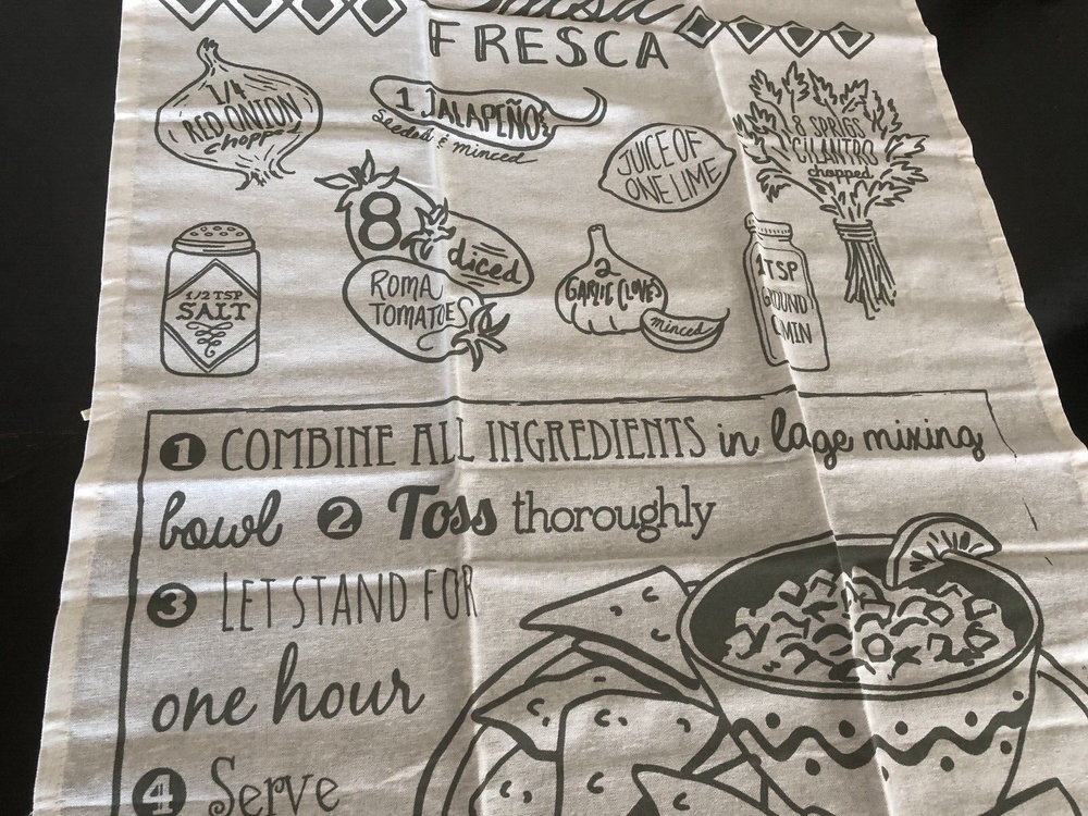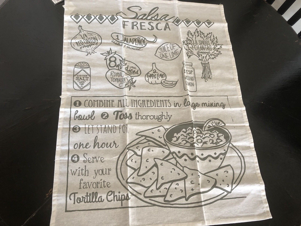 Very nice and large tea towel with Salsa recipe and great graphics. This is a very large tea towel and could also be used as a table runner or would also make a nice wall hanging. Would also make a great gift. See photos for more details. Measures approx: 30 1/4" long x 23 1/2" wide. #A06-00 Be sure to follow us here on Ebay and check out our other tea towel listings.