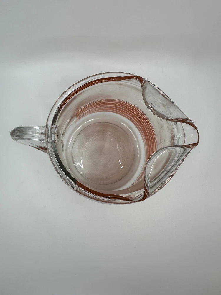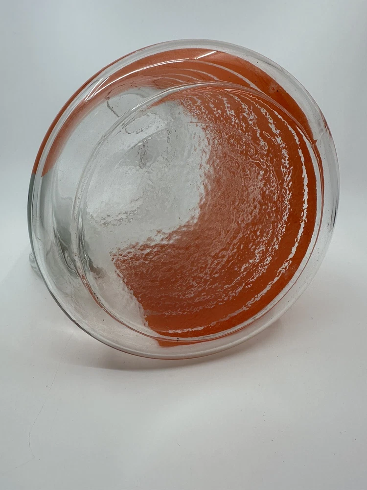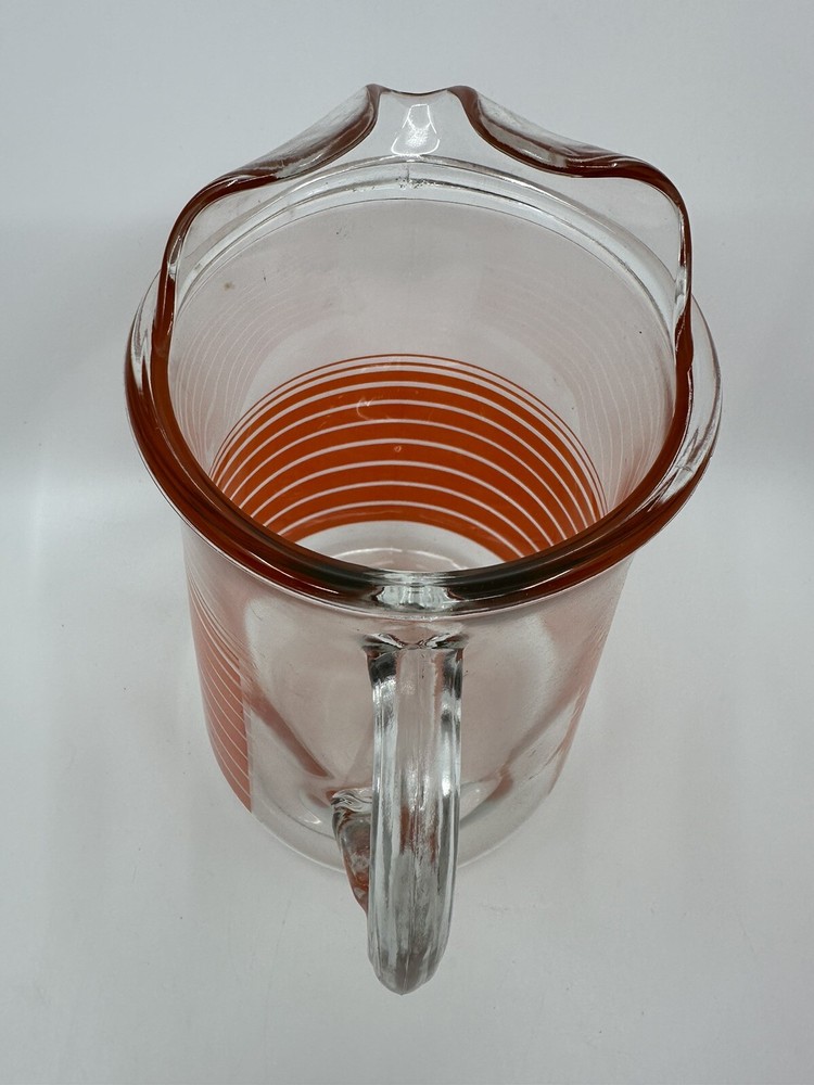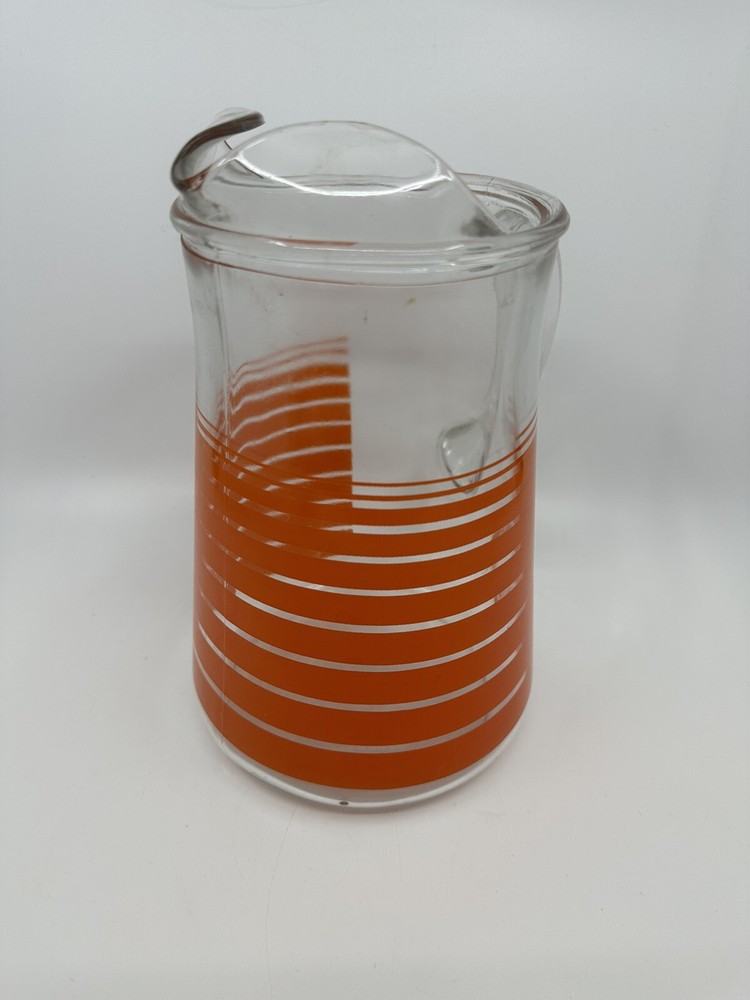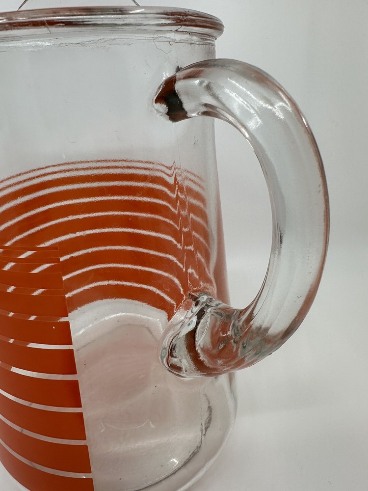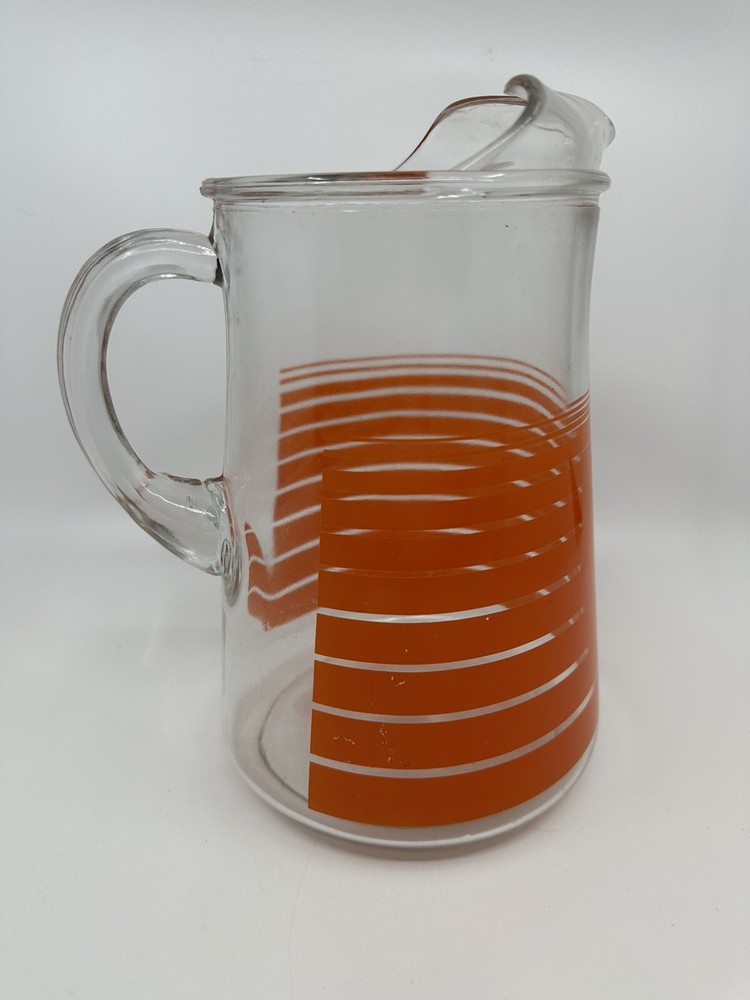 This is a unique vintage glass pitcher with a cool retro vibe. It has vibrant orange stripes. It is in good condition with no chips or cracks. There are some natural variations and bubbles in the glass. There is also some mild scratching of the transfer that you can see in the one close-up picture. Please see all photos for complete details and condition. Message me with any questions before purchasing. Thanks for looking!