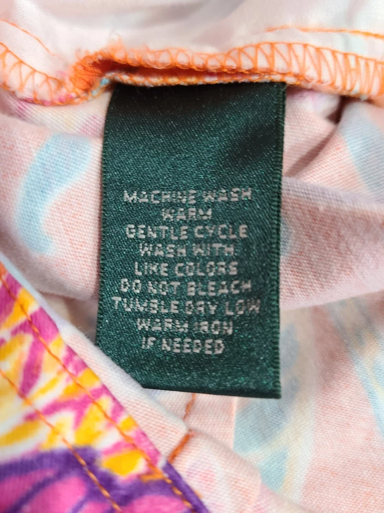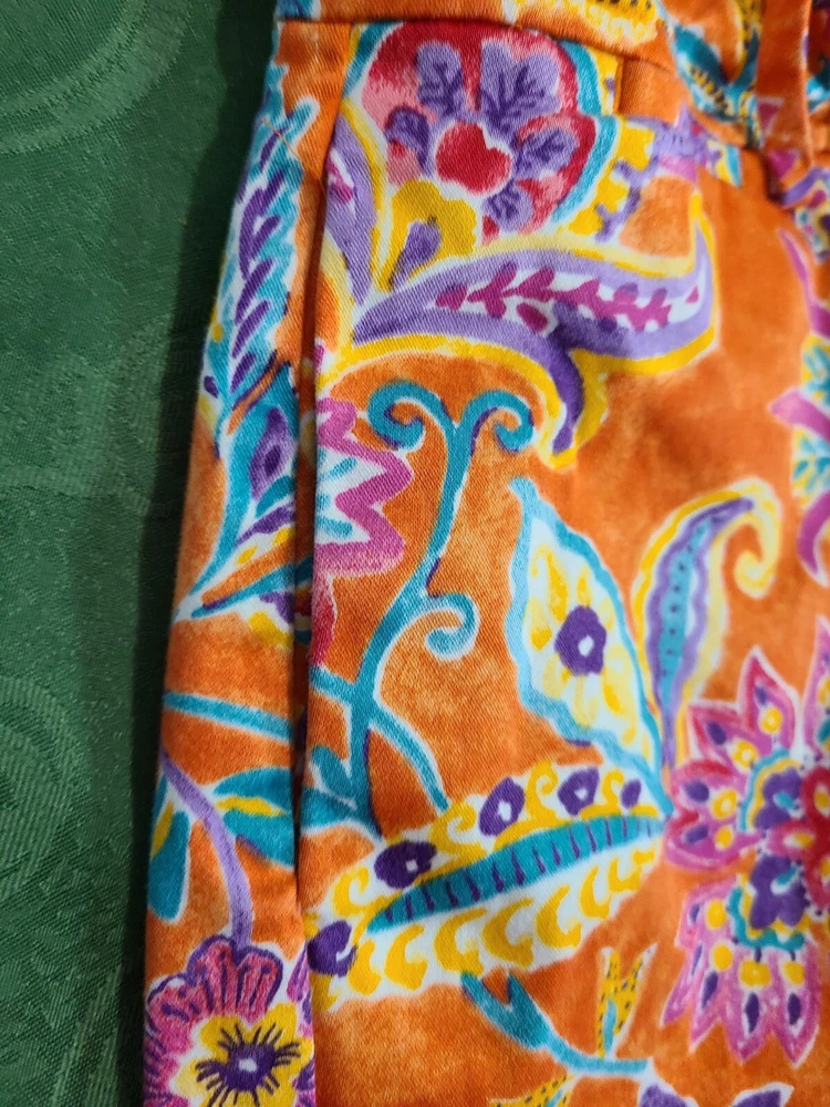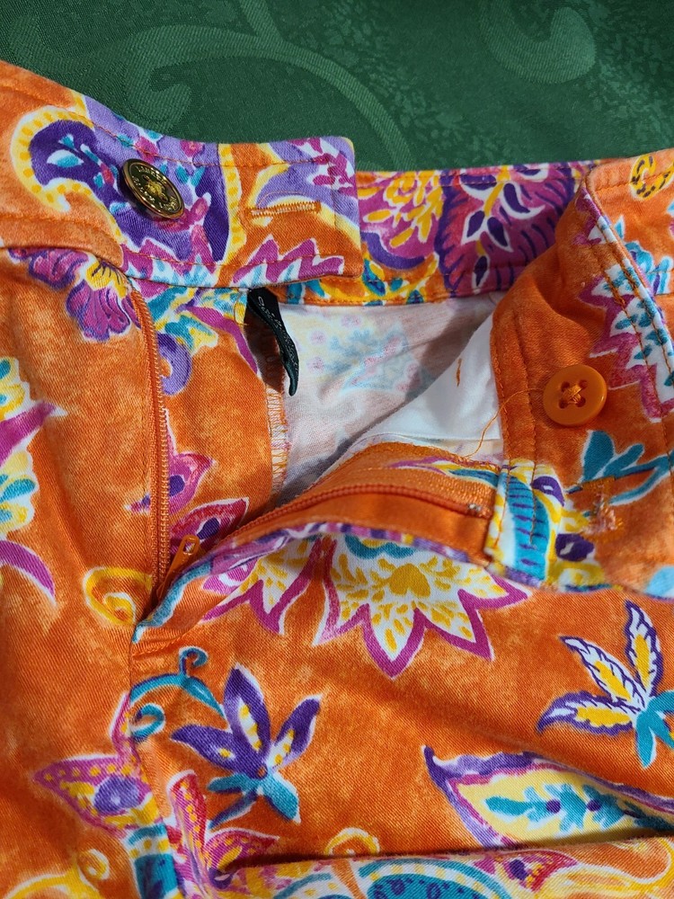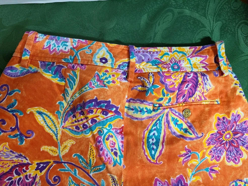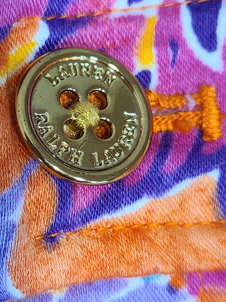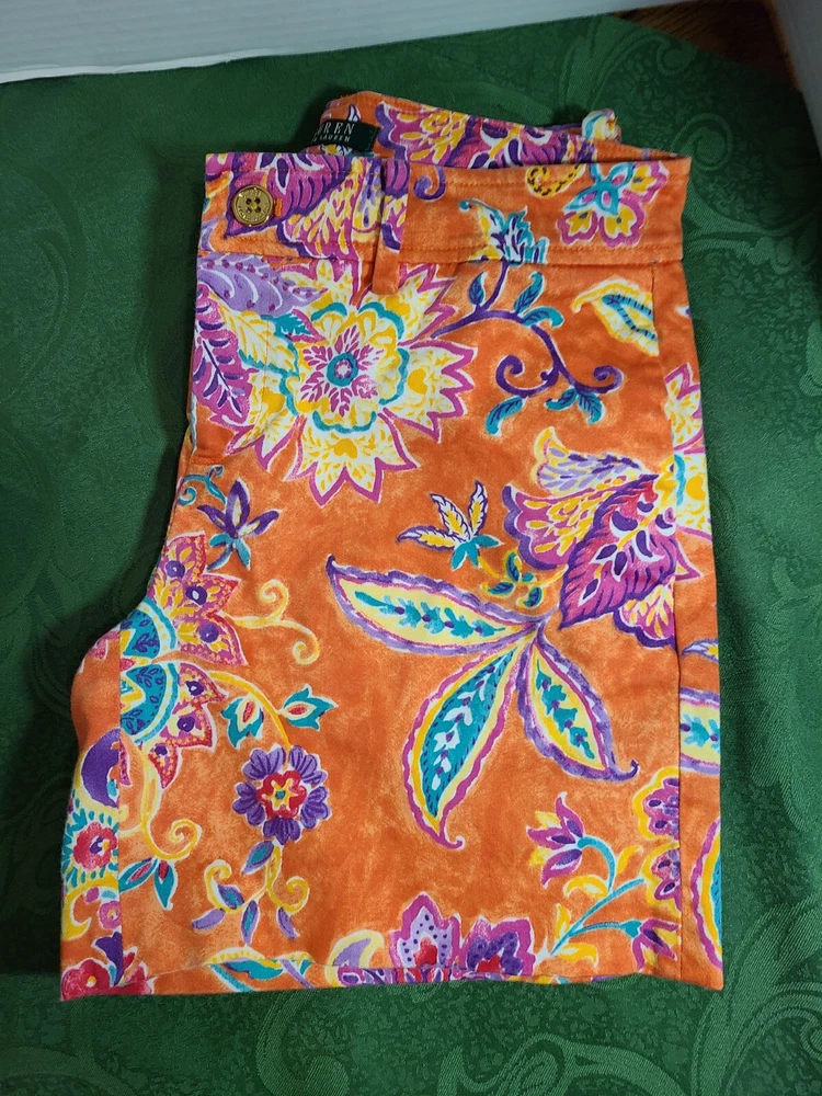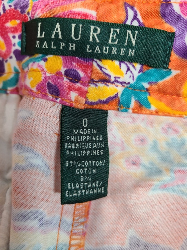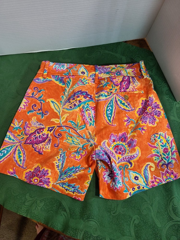 Elevate your travel, activewear, or casual wardrobe with these stylish Lauren Ralph Lauren chino shorts. The orange floral pattern adds a touch of designer classic Americana to your outfit, while the zip closure ensures a secure fit. Made from 100% cotton twill, these shorts are comfortable and durable, perfect for a day at the beach or a resort travel adventure. The mid-rise, flat front design offers a flattering fit for women's size 0, with a waist size of 26 inches. The shorts are perfect for tennis, beach, or travel, making them a versatile addition to your wardrobe. Whether you're a fan of designer fashion, tropical themes, or resort travel, these chino shorts are a must-have. In good clean condition. No stains no holes. 26" waist. 5.5" inseam. From waist to hem measures 13". Belt loops. Pockets.