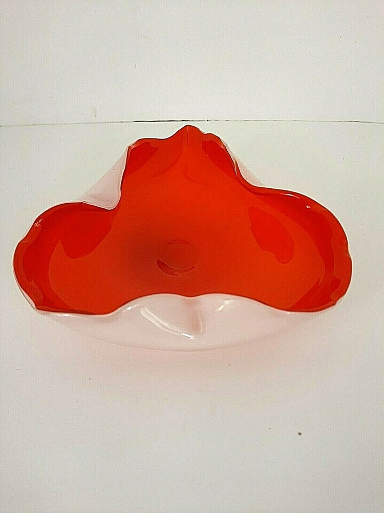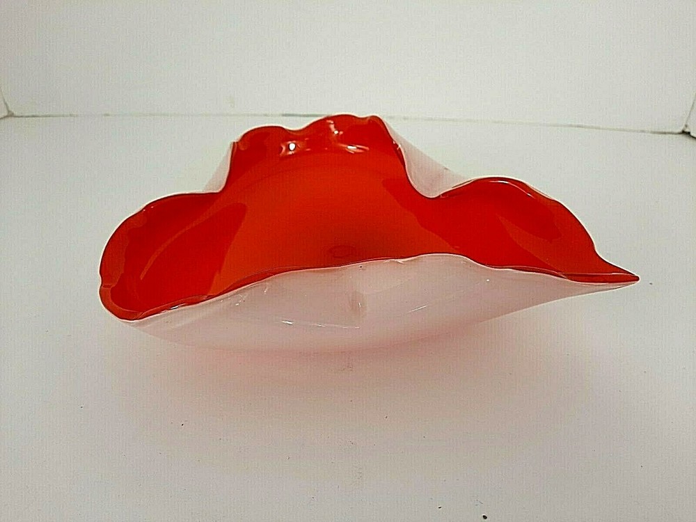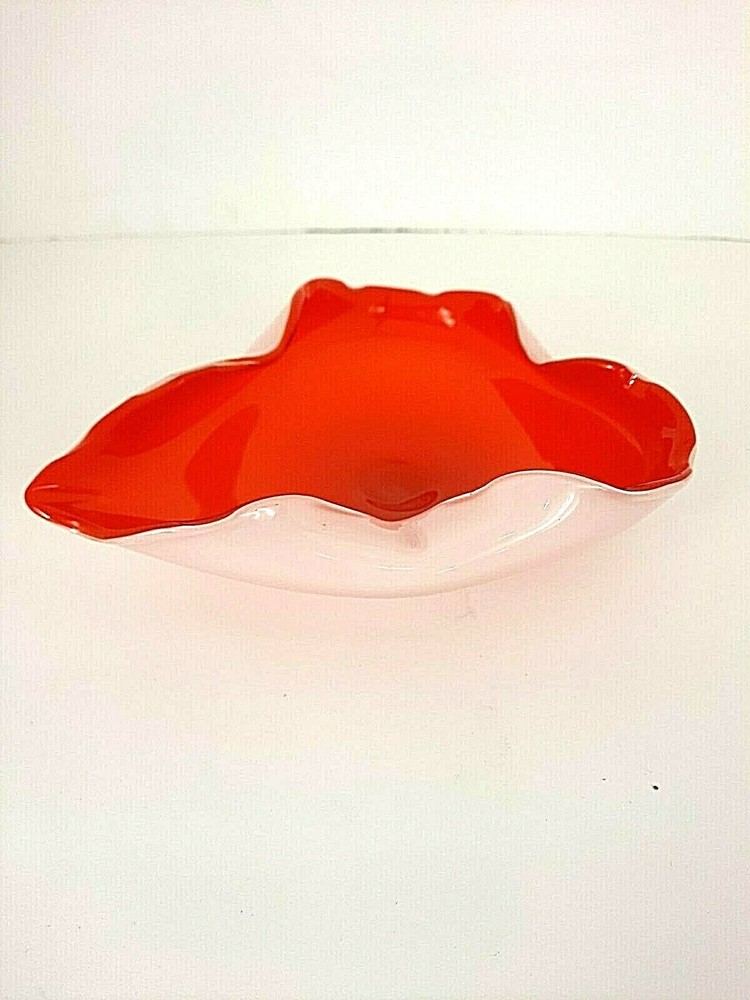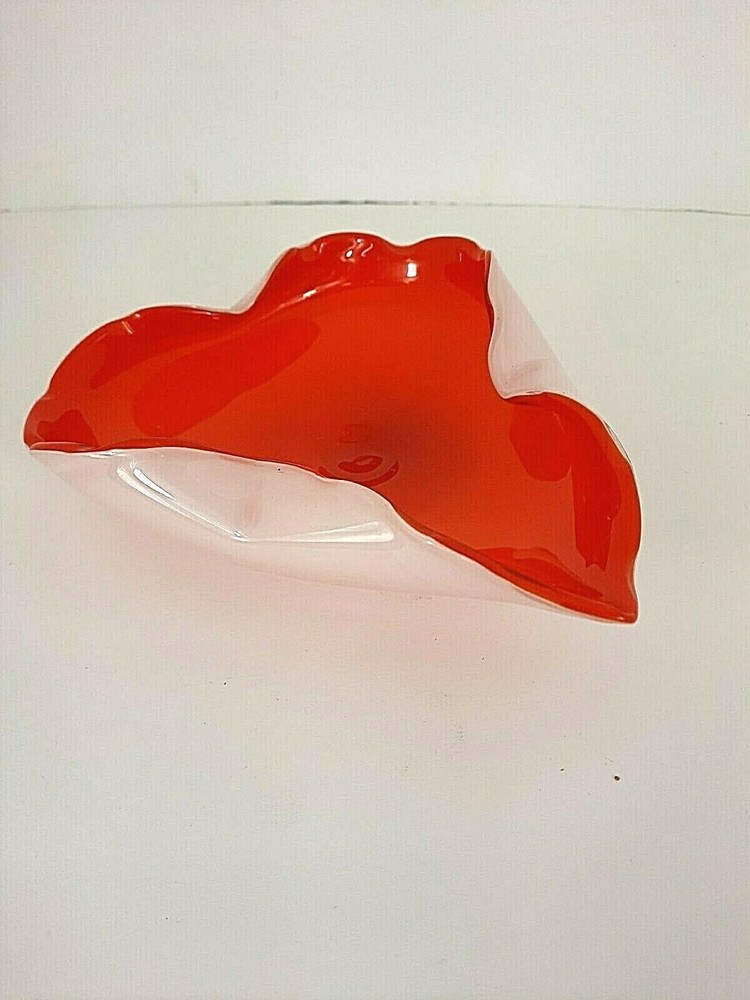 This is a beautiful mid century handblown glass cased leaf candy dish in orange and white. It measures 7" X 6". There are no chips or cracks....