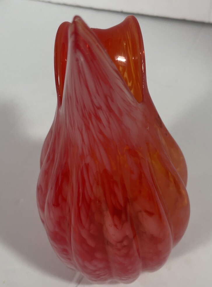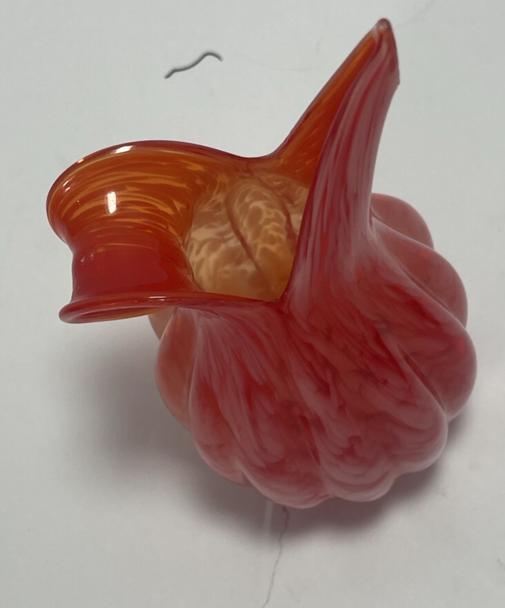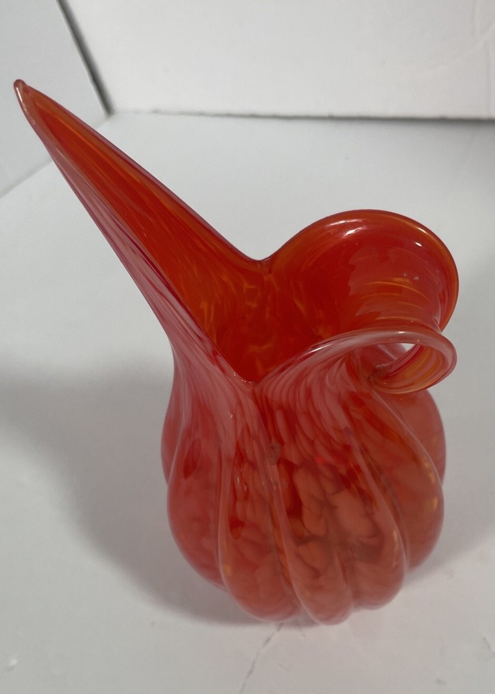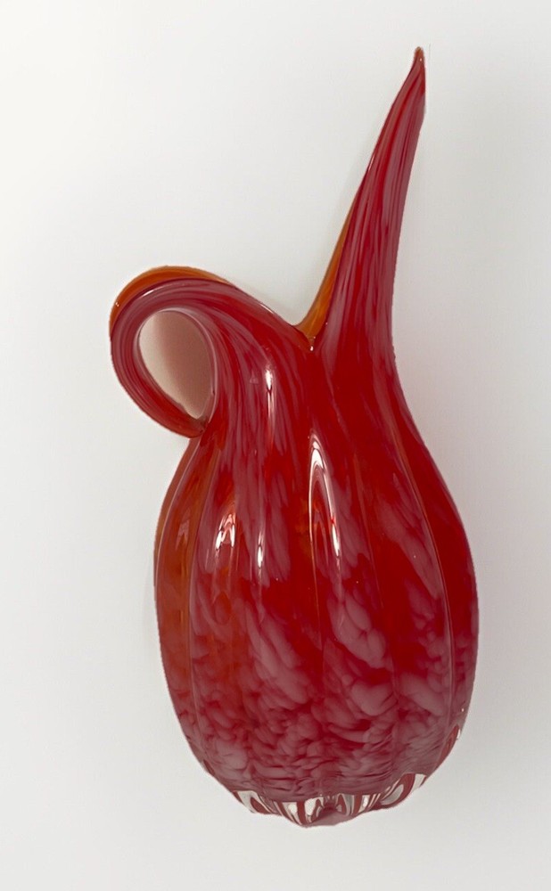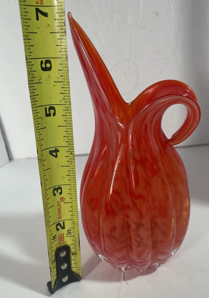 This stunning vintage pitcher is a true mid-century gem! The hand-blown coral swirl glass has a gorgeous orange hue that catches the light beautifully. The craftsmanship is incredible—you can see the delicate swirls and organic texture up close. It’s lighter in person than photos suggest, with a warm, almost peachy tone. Found at an estate sale, it’s now the star of my bar cart, adding retro flair to my space. Perfect for collectors or anyone who loves unique MCM pieces!