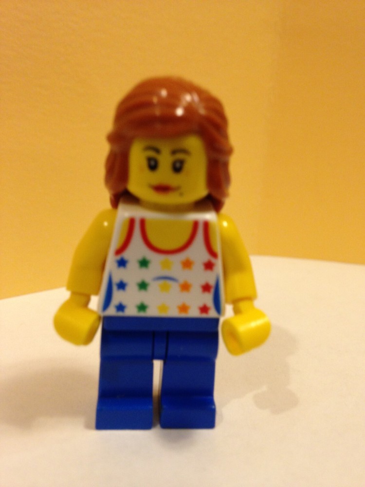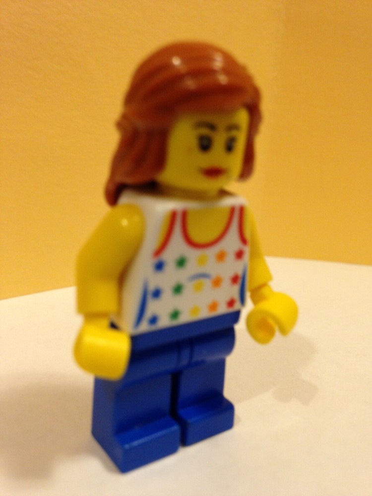 | LEGO Character | Female with Rainbow Stars top/Dk Orange mid-length hair |