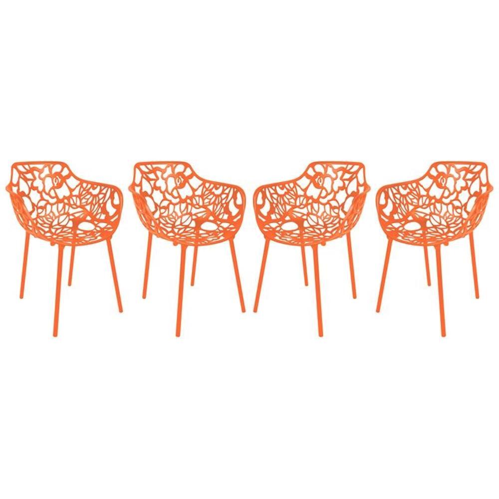 The attractive flower design of this chair is an asset for the home of any modern furniture lover. The eye catching stylish design will have your guests raving over your decor. This is the sort of outdoor accent chair that makes a statement. The Devon Chair is constructed of an aluminum frame three times stronger than steel with a painted finish, crafted to stand the test of time. The unique cut-out design lends a modern touch of beauty that can work in a variety of spaces. Great for transforming any area in your home or backyard into an elegant dining area. Features: Seat and legs are crafted of stronger than steel Aluminum for optimal durability Suitable for indoor & outdoor use High-Quality Painted-Finish to prevent fading, with glossy Finish Stackable & legs comes with plastic cap floor protectors Armrests for added comfort UV-protected from direct exposure to the sun No assembly required Color Orange Specifications: Patio Dining Chair Dimensions: 31.5" H x 24.5" W x 21.5" D Seat Dimensions: 17.5" H x 25" W x 16.5" D Arm Height: 27" Arm Width: 24.5" Product Weight: 13.1 lbs