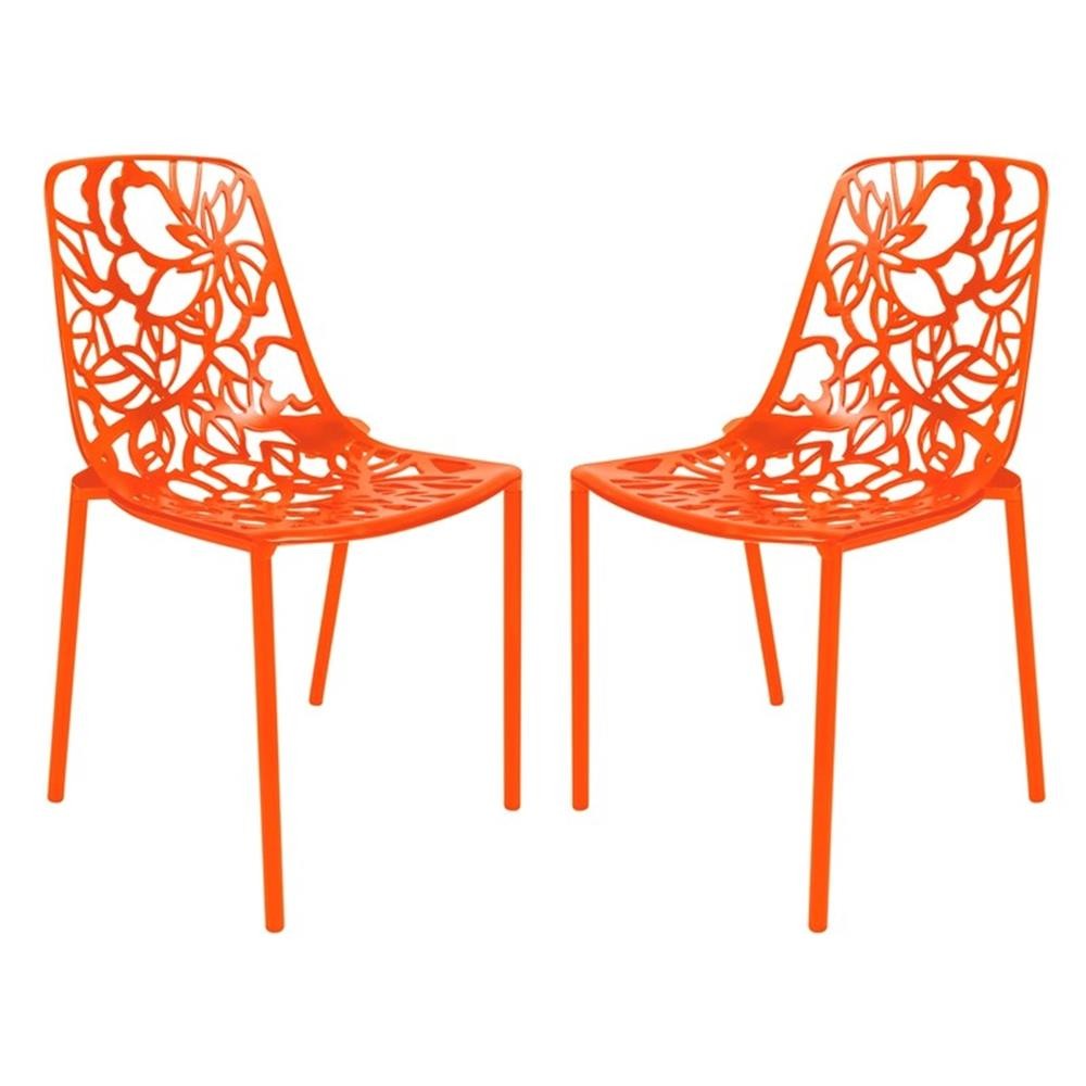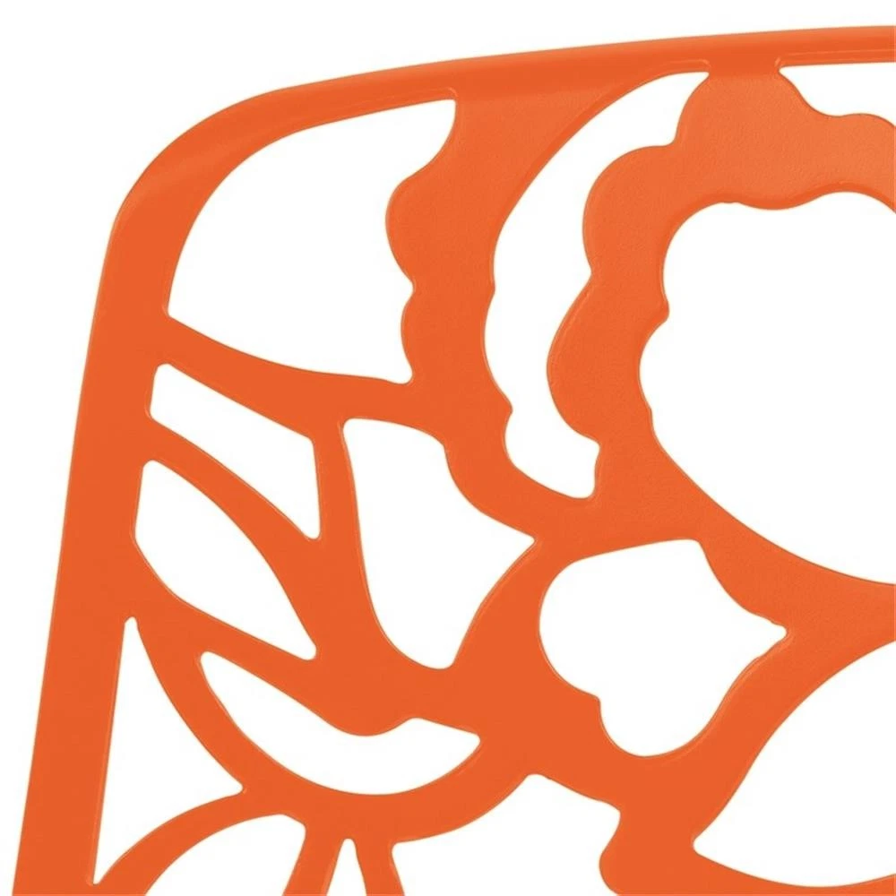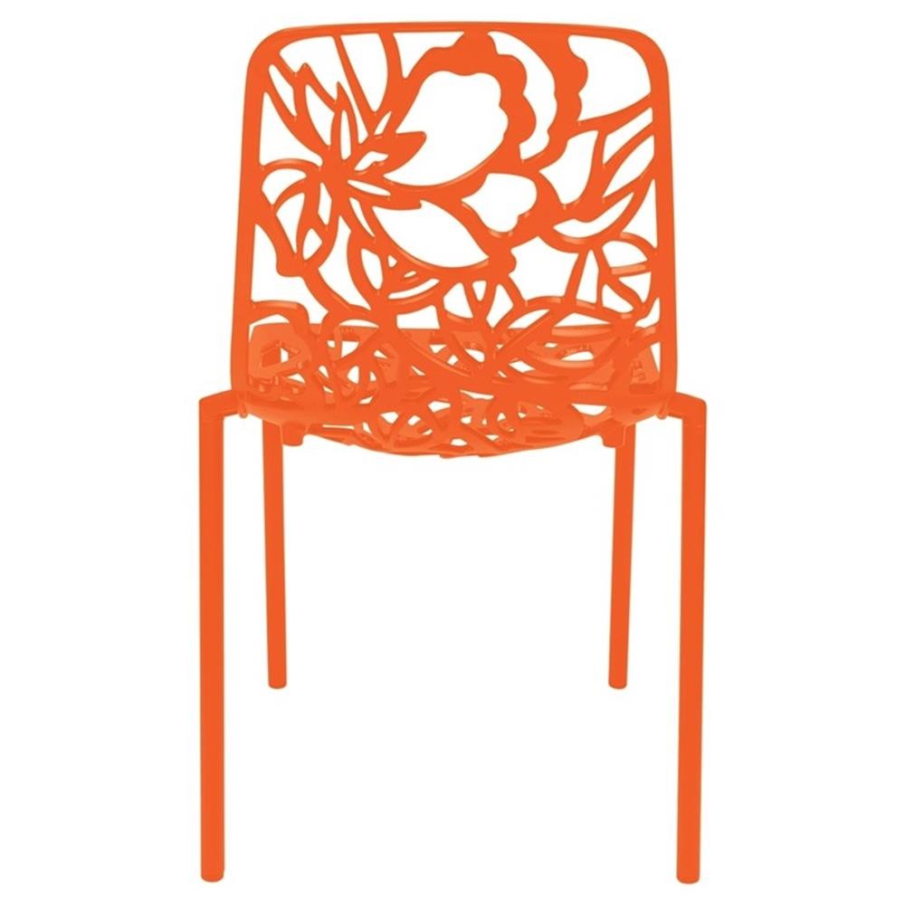Discover a perfect balance of artistry and function with the LeisureMod Devon Stackable Dining Chair. The intricate floral cutout design on the backrest and seat isn’t just visually striking—it enhances airflow for added comfort. Crafted with a robust powder-coated aluminum frame, this chair offers unmatched durability and weather resistance, ideal for outdoor living. The UV-protected finish preserves its beauty even under harsh sunlight, while the stackable design simplifies storage in any setting. Thoughtfully equipped with plastic floor protectors, it ensures safety for both indoor and outdoor surfaces. Delivered fully assembled, the Devon chair seamlessly transitions between patios, gardens, dining rooms, or balconies, blending timeless style with everyday convenience. Features: The backrest and seat feature a detailed floral cutout pattern, designed to promote airflow for enhanced ventilation and add an attractive visual element to the dining accent chair. The aluminum frame provides strength and durability, ensuring lasting performance for daily use. A powder-coated finish adds a protective layer to resist rust and weather exposure, making the dining chair dependable in outdoor settings. A UV-protected coating guards the chair's surface against sun exposure and fading, preserving the durability and pristine finish of the material. This feature ensures the chair maintains its reliable appearance and functionality over time. The stackable design accommodates efficient storage by allowing multiple chairs to be neatly stacked together. This practical feature minimizes the space required when the chairs are not in use. Each leg is fitted with plastic caps that safeguard floors from scratches and damage. This thoughtful addition ensures the chair remains safe for use on both indoor and outdoor surfaces. The side chair is built to fit effortlessly into a variety of spaces, including patios, gardens, balconies, or dining rooms. Its strong build makes it dependable for outdoor use while still providing the comfort needed for indoor settings. The chairs arrive fully assembled, eliminating the need for additional setup. This feature allows for immediate use straight out of the box, saving time and providing a hassle-free experience. Specifications: Product Dimensions: 32" H x 18.5" W x 15.5" D Seat Height: 18" Product Weight: 10.9 lbs Weight Capacity: 275 lbs Product Color: Orange