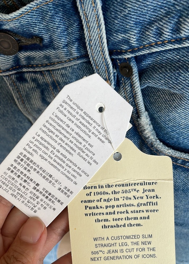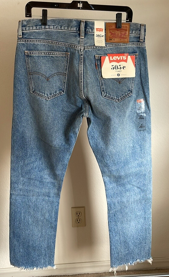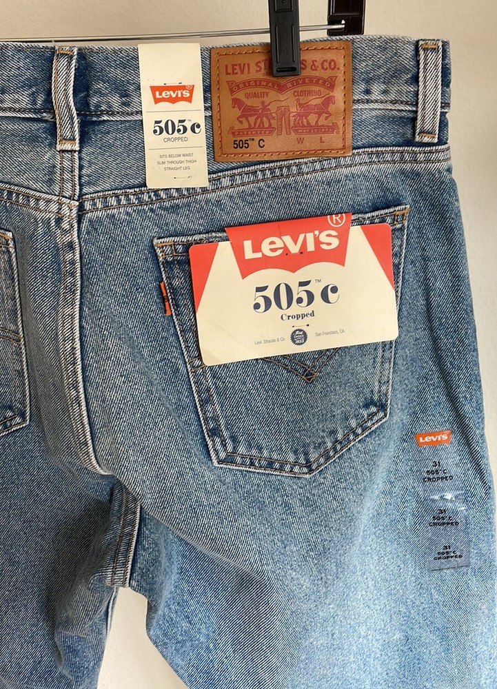 Elevate your denim collection with these Levi's 505C Orange Tab Cropped Jeans. The mid-rise, regular fit and straight leg silhouette offer a timeless and flattering look. The 5-pocket design and button closure add classic details while the cropped length and 70's theme bring a unique twist. These jeans are made of a medium-wash cotton blend denim fabric and are machine washable for convenience. The Levi's 505C Series product line provides a vintage-inspired look while still maintaining modern comfort and style. Perfect for any season, these jeans are a must-have addition to any wardrobe. Levi’s 505 Cropped with orange tab. Approx. measurements waist 34”, hip 40”, inseam 27”. Medium Wash. 5 pocket Zip fly. Leather back patch.