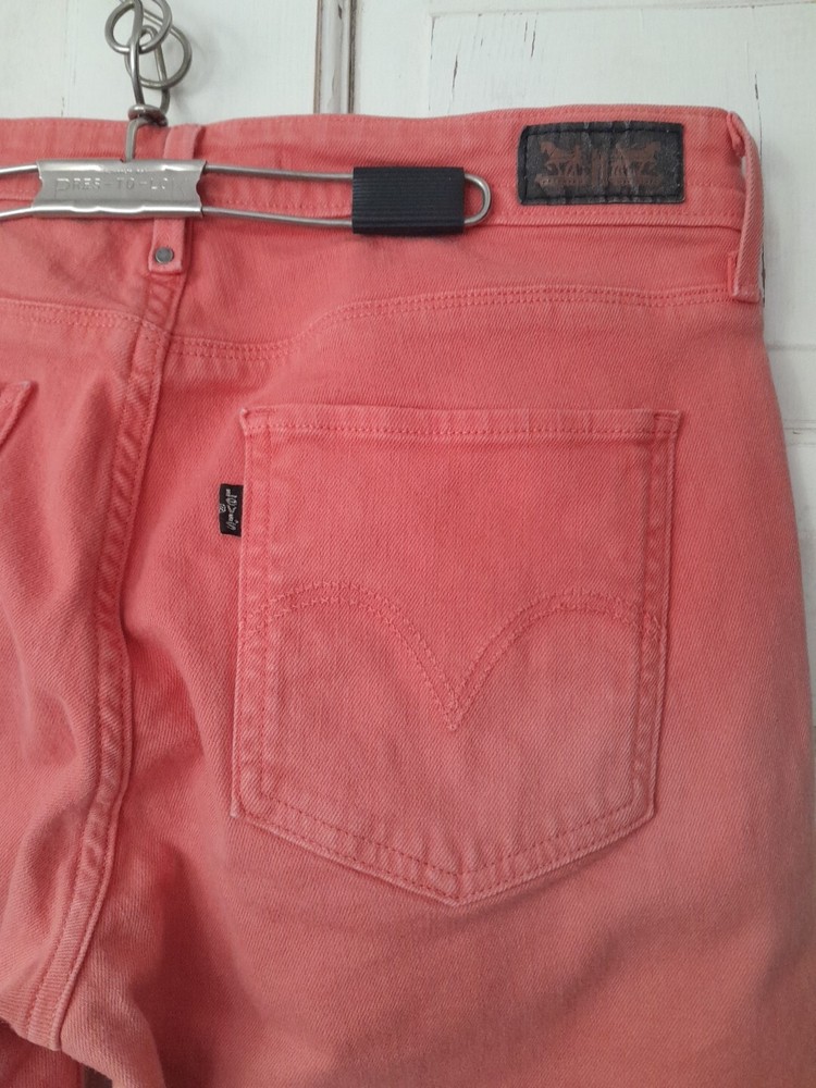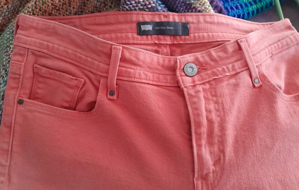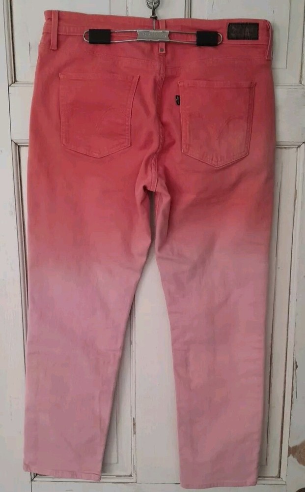 These Levi's jeans are a size 10 with a mid-rise waist measuring 30 inches. They feature a stylish ombre fabric wash in peach color, giving them a unique and trendy look. Made from a comfortable cotton blend material, the slim-fit skinny style jeans are designed for women and have a 5-pocket design with a zip closure. The Levi's brand ensures quality and style in this wardrobe essential.