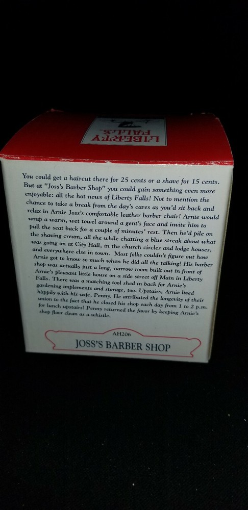 Liberty Falls Collection - AH206 - Joss's Barber Shop - New in box - 2000. Condition is New. Item sold as is Please ask all questions prior to purchase