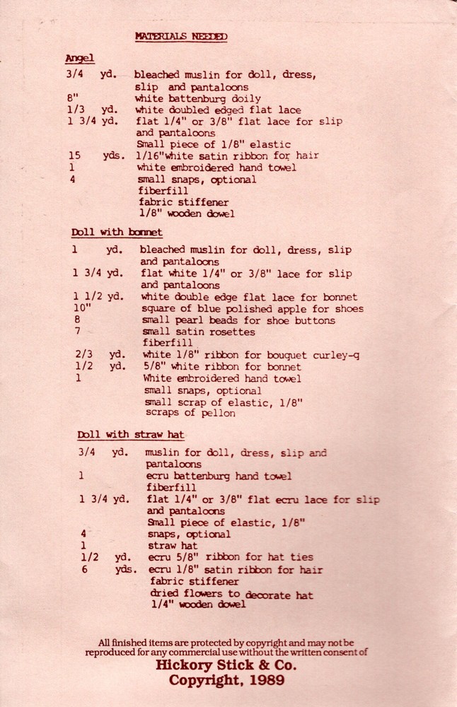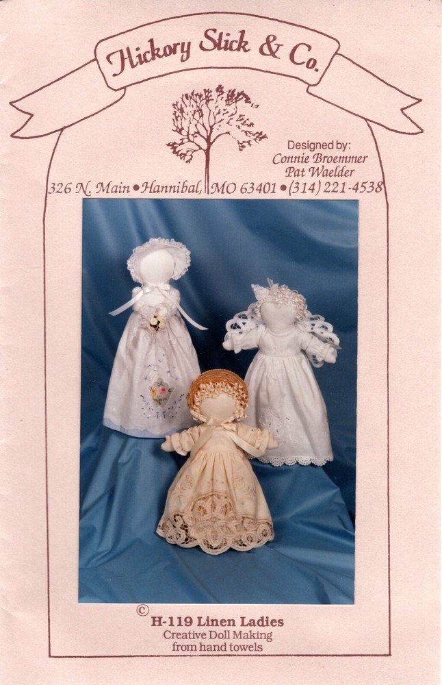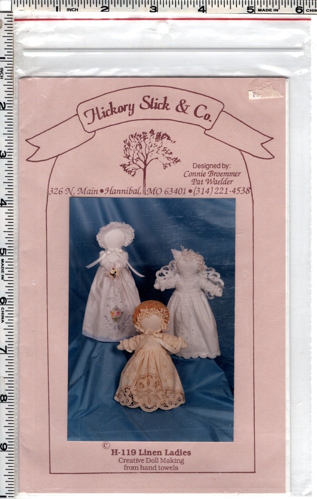 Item Description ©1989 Hickory Stick & Co. Sewing Craft Dollmaking Pattern # H-119 "Linen Ladies" Designed by Connie Broemmer & Pat Waelder Pattern Size: One Size Uncut SHIPS FREE! Pictures are taken by me and are representative of the actual pattern you are purchasing, not stock or stolen photos. Please review the pictures carefully! Domestic economy shipping via USPS is FREE! Purchase 3 or more of my 'FREE SHIPPING' patterns at one time using the E b a y 'Shopping Cart' feature and they ship via USPS Priority Mail for FREE! USPS Priority Mail is available for $14.99 for individual patterns and USPS Priority Mail Express for overnight service is $49.99. All International shipping via E b a y International Shipping Service ONLY, with charges base on location. Thanks for visiting Sew Many Stitches and Things! General Shipping & Handling Information I ship via USPS to your confirmed E b a y shipping address, and can accommodate other reasonable requests. I make every effort to ship the next business day after receiving cleared payment. Local pick up is allowed for most items and required for certain items. I do combine shipping where possible to save you money! If you are bidding on other of my auctions that end within a 3 day period, please let me know and I will send an invoice after the last auction has ended, including the combined shipping! International buyers are responsible for all taxes, duty and customs fees. Payments Payment is expected within 4 days unless prior arrangements have been made. If you are going to have difficulty making payment, PLEASE just contact me! I know things come up and am happy to work with my customers! If you have questions or need additional information, ask BEFORE bidding and I will try to get the information for you as soon as possible. Feedback I will leave positive feedback for you when you pay in a timely manner. I will ship your item(s) quickly and would appreciate positive feedback after you receive your item. If for any reason you feel you cannot leave positive feedback and 5 star detailed seller ratings, please contact me first and give me an opportunity to make things right. Thank You! ****Allergy Alert**** I have a bird and rabbit in my non-smoking home.
