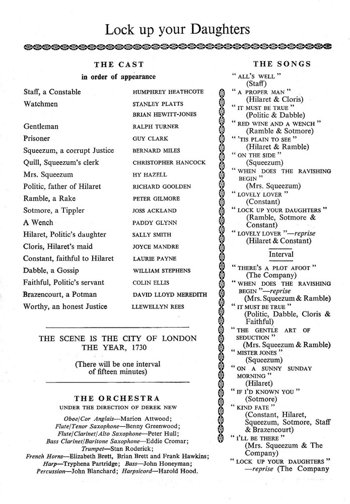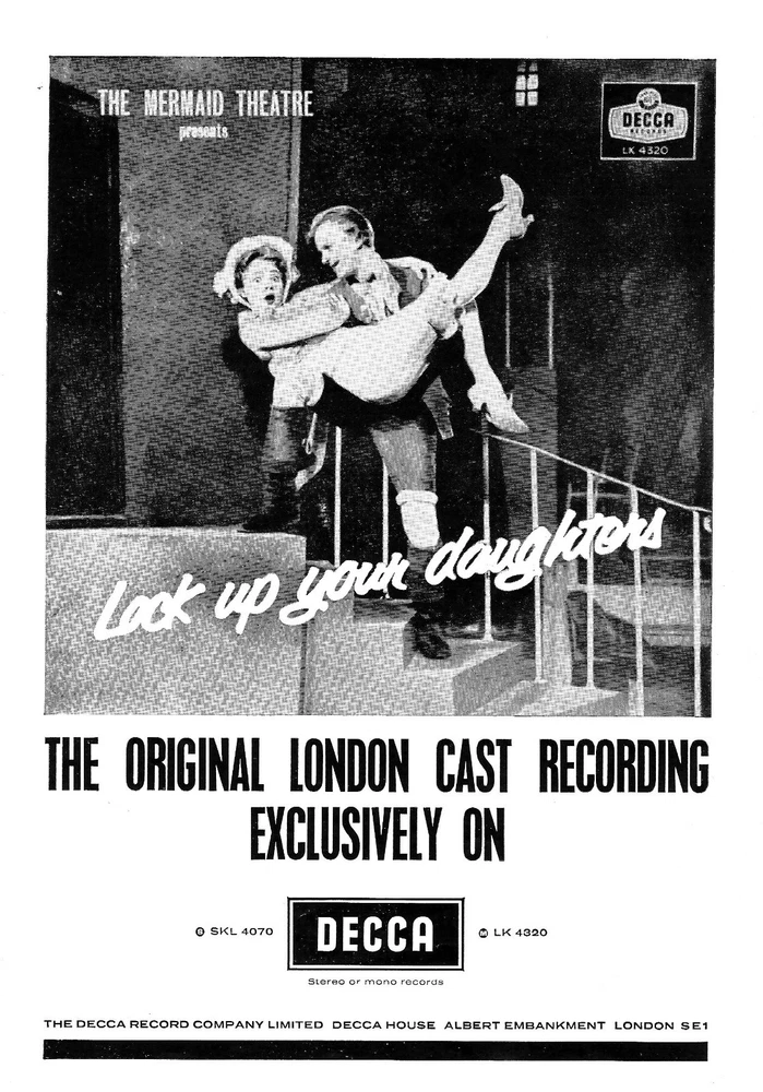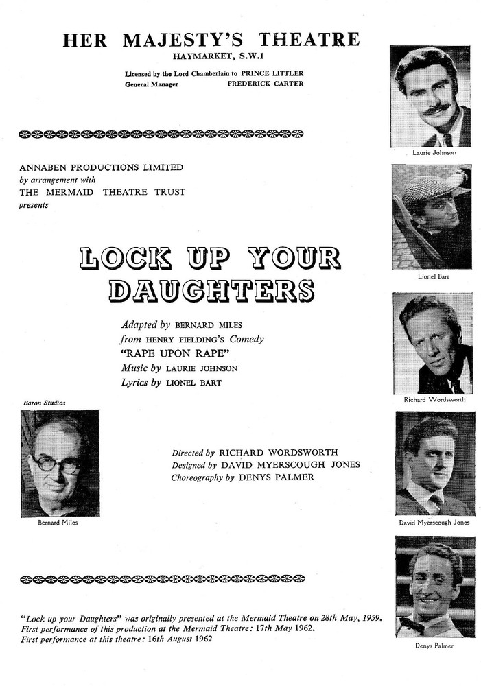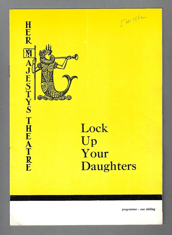 This is a beautiful November 15th, 1962 programme (playbill) from the London revival of the LIONEL BART and LAURIE JOHNSON musical "LOCK UP YOUR DAUGHTERS!" at Her Majesty's Theatre in London. (The Original London production opened May 28th, 1959 at the new Mermaid Theatre and ran for 330 performances. This revival opened May 17th, 1962 at the Mermaid Theatre and after 111 performances transferred to Her Majesty's Theatre on August 16th, 1962 for an additional 553 performances.) ..... When the Mermaid Theatre at Puddle Dock opened in 1959, it was the first new theatre to be built in the City of London for nearly 300 years. "Lock Up Your Daughters", adapted by the Mermaid Theatre's manager was the inaugural production and was intended to run for a six-week season, but the overwhelming success of the show resulted in a six-month extension. The revival once again starred HY HAZELL and the cast included JOSS ACKLAND, BERNARD MILES, SALLY SMITH, PETER GILMORE, LAURIE PAYNE, RICHARD GOOLDEN, HUMPHREY HEATHCOTE, WILLIAM STEPHENS, LLEWELLYN REES, COLIN ELLIS, CHRISTOPHER HANCOCK, DAVID LLOYD MEREDITH, JOYCE MANDRE, STANLEY PLATTS, BRIAN HEWITT-JONES, GUY CLARK and RALPH TURNER ..... CREDITS: Music by LAURIE JOHNSON; Book adapted by BERNARD MILES from the comedy "Rape Upon Rape" by HENRY FIELDING; Lyrics by LIONEL BART ("Oliver!", "Blitz", "Lock Up Your Daughters", "Maggie May", "Fings Ain't Wot They Used T' Be", "Twang", "La Strada"); Sets designed by DAVID MYERSCOUGH JONES; Choreographed by DENYS PALMER; Directed by RICHARD WORDSWORTH; Produced by THE MERMAID THEATRE ..... DETAILS: The sixteen page playbill measures 6 5/8" X 9 3/8" inches and includes full production credits, cast list, synopsis of scenes, list of musical numbers, promotional and historical text, individual photos of each member of the creative team, two pages of production photos and wonderful vintage advertising, but no cast bios ..... CONDITION: With the exception of the date written on the cover, light creasing and minor edge wear, this playbill is in excellent condition and will make a wonderful addition to the collection of any musical theatre aficionado or historian. This item will be carefully packaged in a protective, carded sleeve and backed by stiff cardboard.
