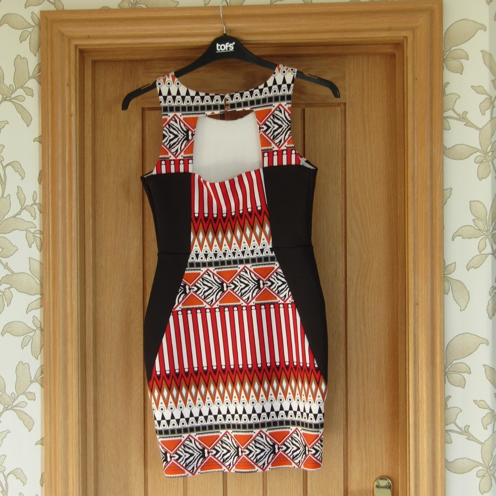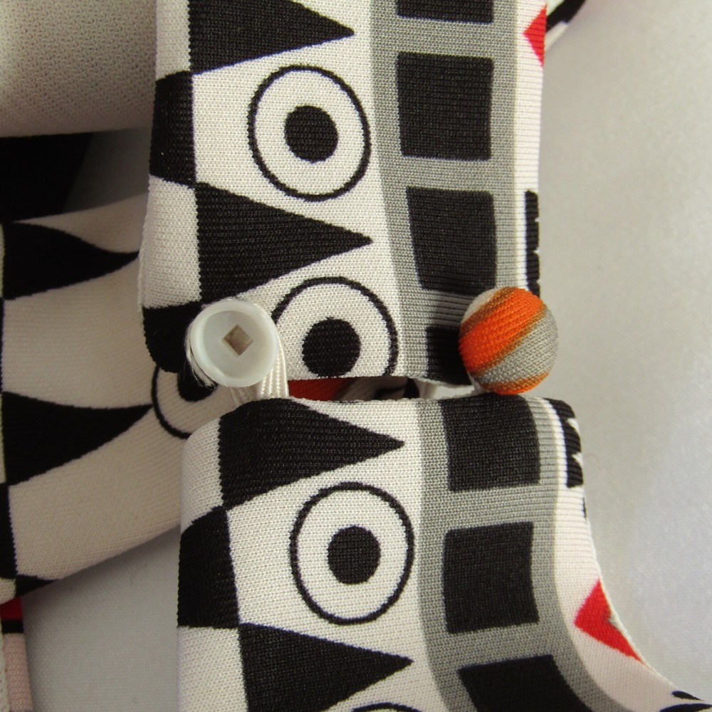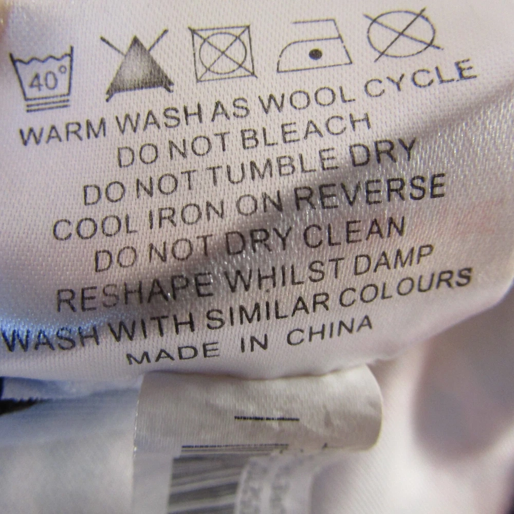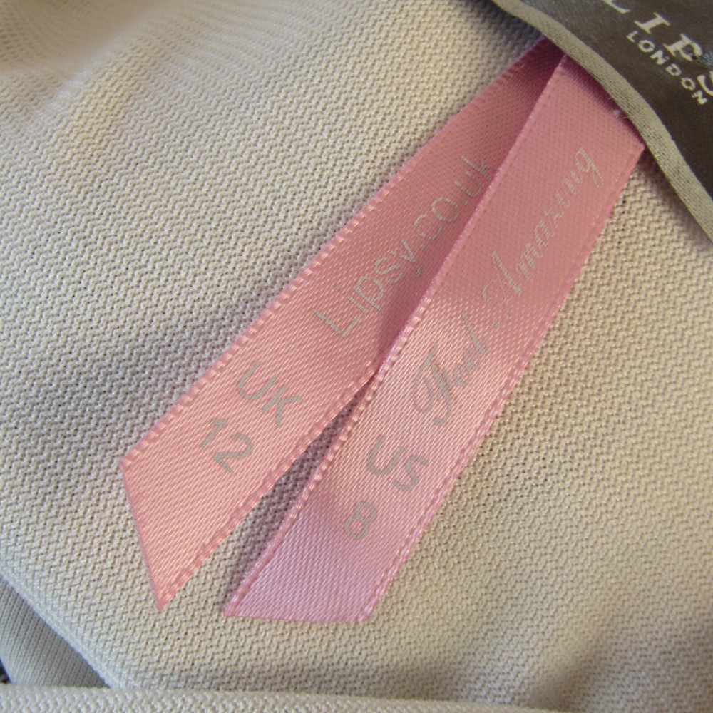 concealed side zip with hook and eye fastening, 2 buttons on collar with elastic loops - one button has lost its fabric covering - see photo, top lined - inside front neckline a few stitches missing attaching lining, label says size 12 - stretches to 12 but better fit 10