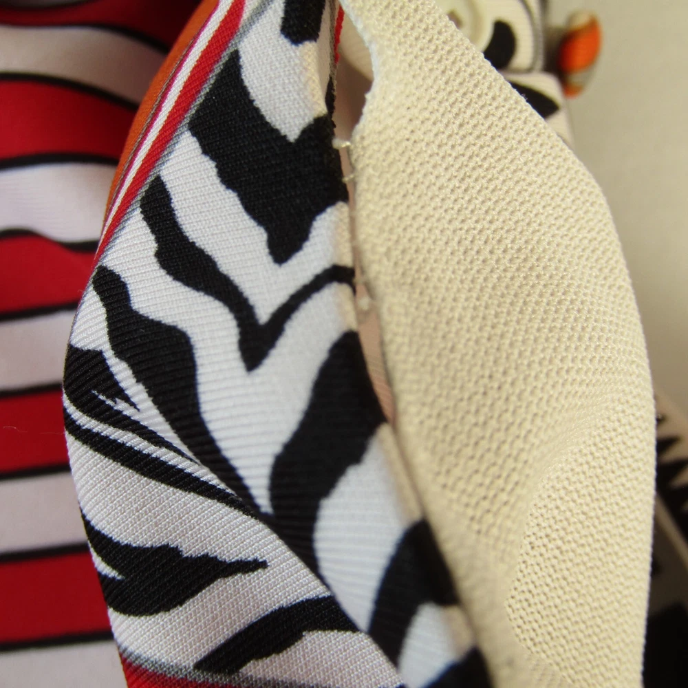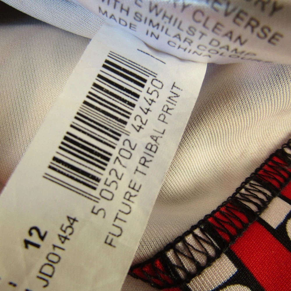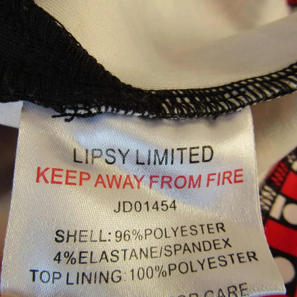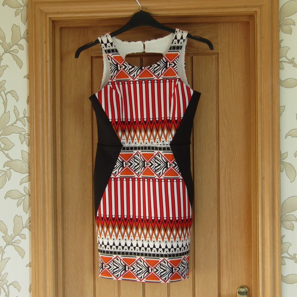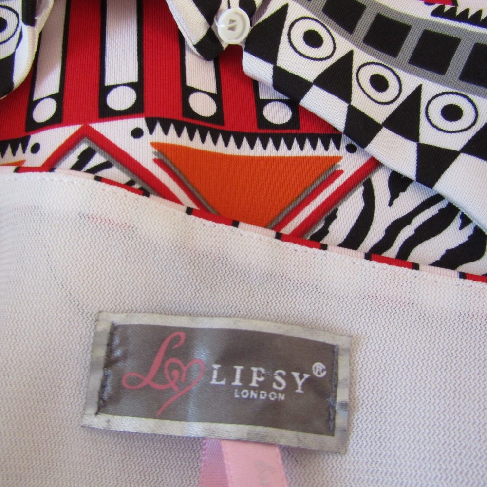 concealed side zip with hook and eye fastening, 2 buttons on collar with elastic loops - one button has lost its fabric covering - see photo, top lined - inside front neckline a few stitches missing attaching lining, label says size 12 - stretches to 12 but better fit 10