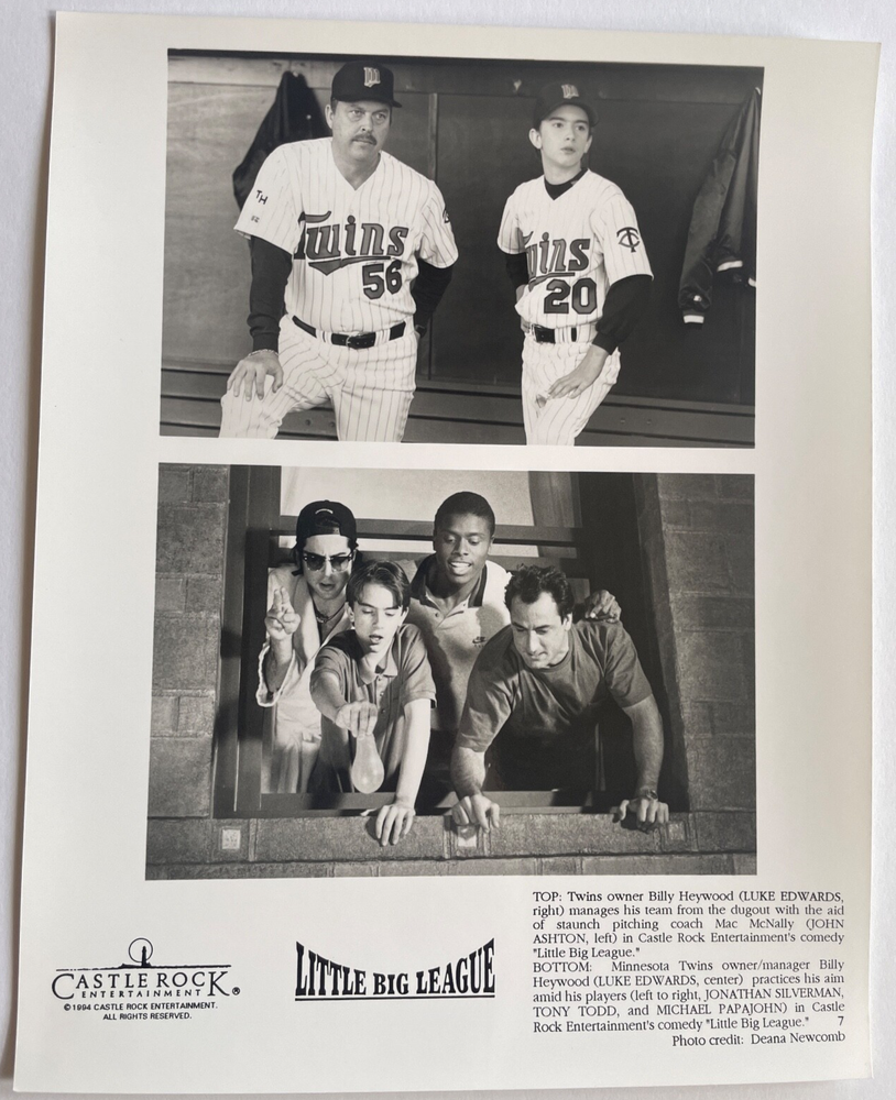 Movie: Little Big League, 1994, Castle Rock Entertainment Actor(s)/person(s) in photo: Luke Edwards,John Ashton, Jonathan Silverman, Tony Todd, Michael Papajohn. Caption: Top: Twins owner Billy Heywood (Luke Edwards, right) manages his team from the dugout with the aid of staunch pitching coach Mac McNally (John Ashton, left) in Castle Rock Entertainment's comedy "Little Big League." Bottom: Minnesota Twins owner/manager Billy Heywood (Luke Edwards, center) practices his aim amid his players (left to right, Jonathan Silverman, Tony Todd, and Michael Papajohn) in Castle Rock Entertainment's comedy "Little Big League." Photo: Deana Newcomb Photo Subject: 2 scenes from the film. About 8" x 10" publicity photo is in black and white. About this Item: This vintage press publicity photo is a limited archival item. It was the actual print that was produced to be sent to newspapers and magazine publishers to promote the release of this movie. This is not a reprint or digital print. Item dates to just prior to the film's original theatrical release. This is a unique collectible item. It captures an era of time before the modern digital age when physical photographs were sent to periodicals to promote films. Each photo has its own story and depicts a moment of an iconic film. Many of these photos were destroyed by time, use, or neglect. Condition: This is a vintage press publicity photo. It may have creases, blemishes, or folds from how it was stored previously. See pictures. Shipping: This item ships in a poly sleeve sandwiched in a rigid material for protection. Buying multiple press photos from our collection? We can combine shipping. CHECK OUT OUR OTHER PRESS PHOTOS! We had the good fortune to acquire a small collection of vintage press publicity photos. Check out our other press photo listings: https://www.ebay.com/str/unpredictablefinds/Vintage-Press-Photos/_i.html?store_cat=37795133017 Unpredictable Finds has hundreds of vintage, antique, and other items available for sale: https://www.ebay.com/str/unpredictablefinds (B6-44)
