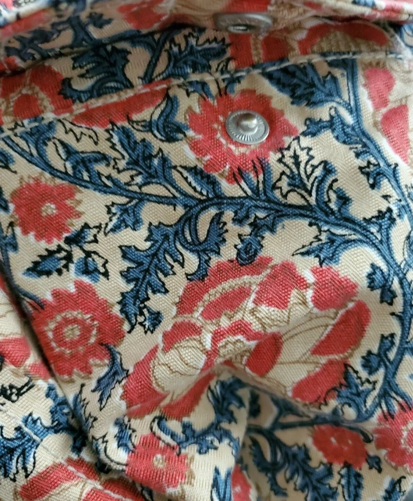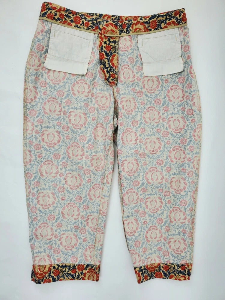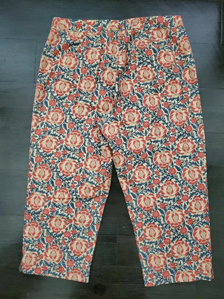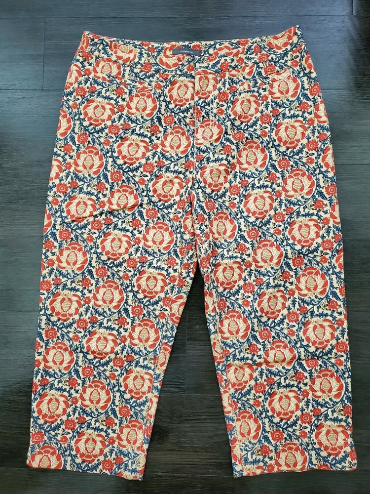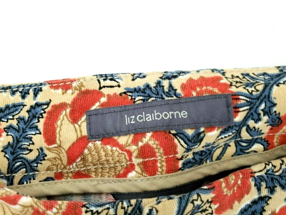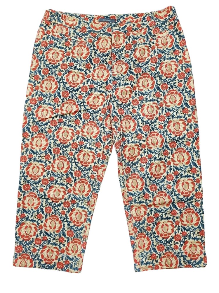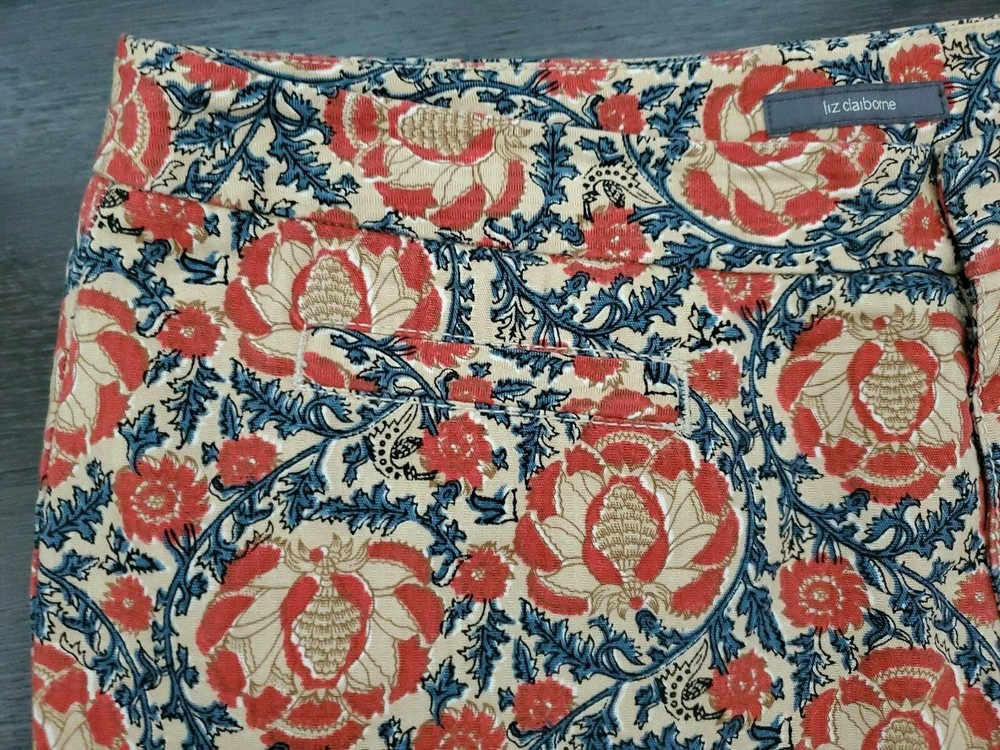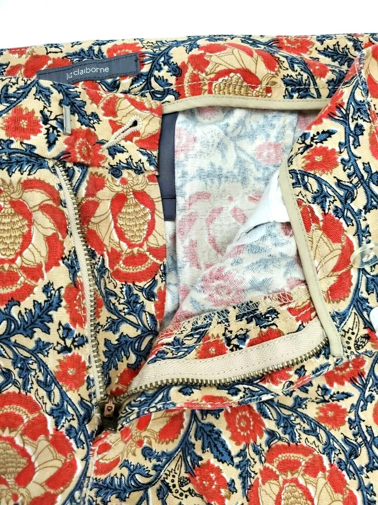 Fabrication: 100% Cotton Details: Liz Claiborne Capri Pant Size 14 Orange & Navy print Side slits Zip/Button front Functional front pockets (one still sewn down) Functional back flap snap pocket Flat no belt loop waistline Approximate Measurements: 37" Waist 13" Rise 23" Inseam Care Instructions: Machine Wash Cold
