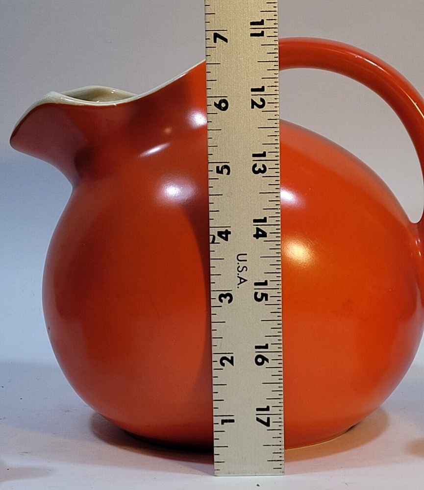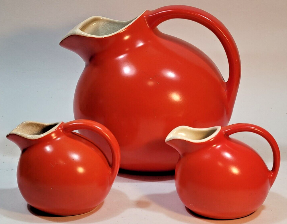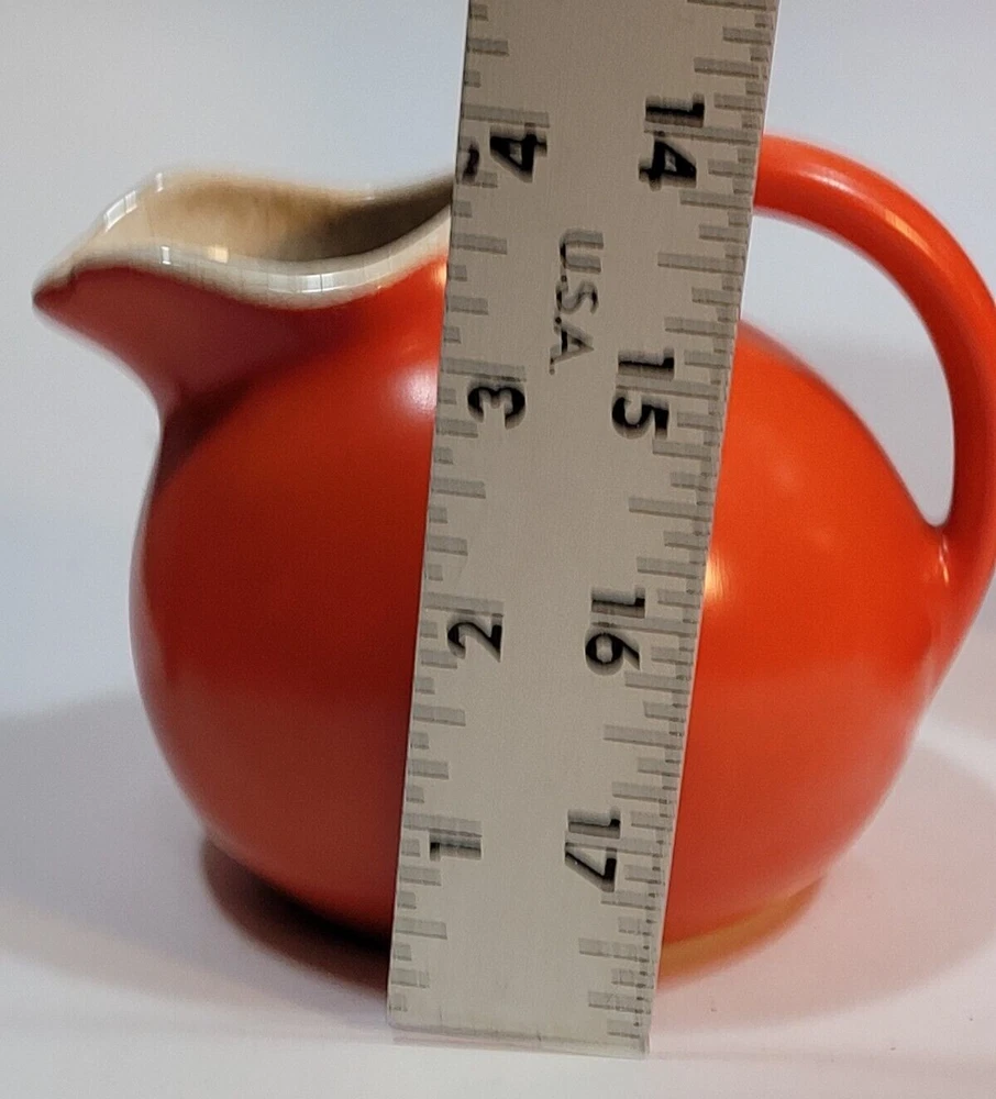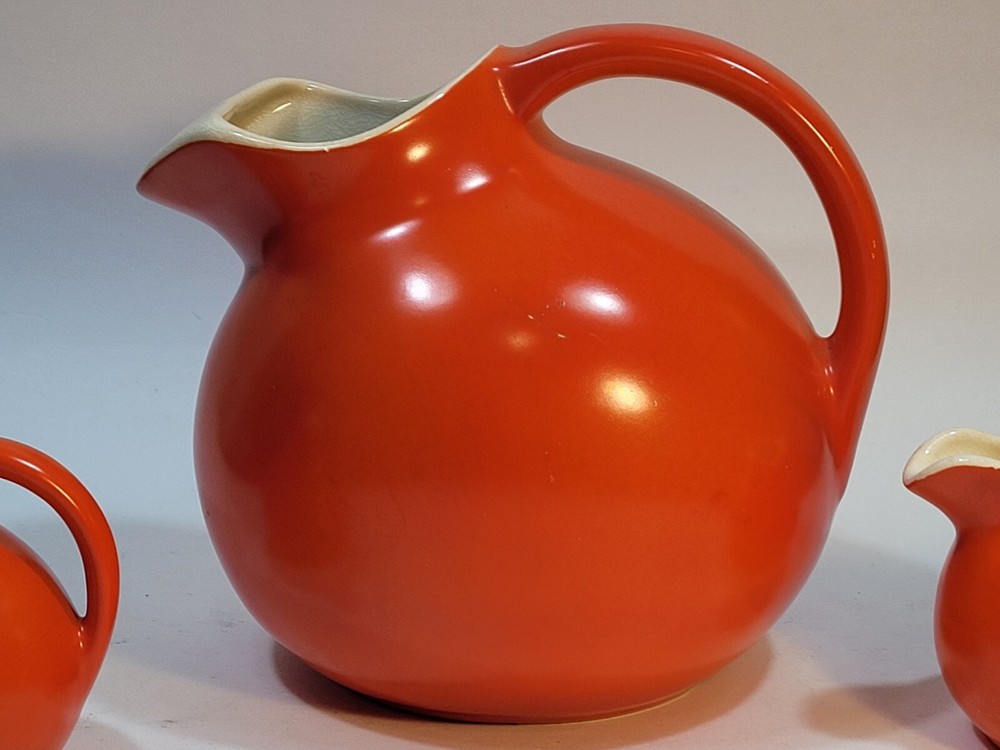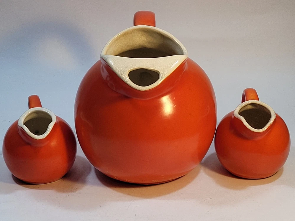 Lot 3 Ball Jug Pitchers All are Unbranded Large Pitcher has "USA" stamped in bottom Mid-Century MCM Color: Orange Significant Crazing on interiors of all 3 items Large Pitcher is 7 inches tall X 6 inches wide 2 Small Pitchers are 3.5 inches tall and 3.5 inches wide Used Items - Scuffs and marks - The large pitcher has a few manufacturer paint flaws around the base - see last photo - significant crazing on interior of all 3 items - see photos for close-ups of items and marks and scuffs on all 3 items - Overall good working condition - great decorative pieces Shipping is UPS Ground
