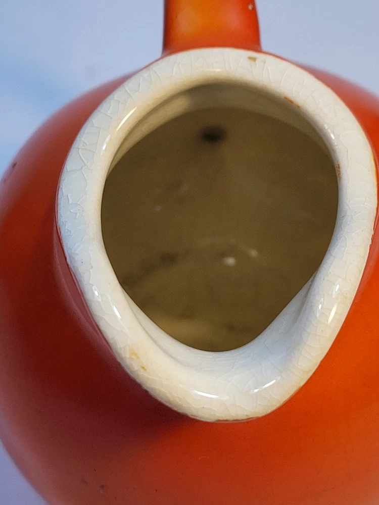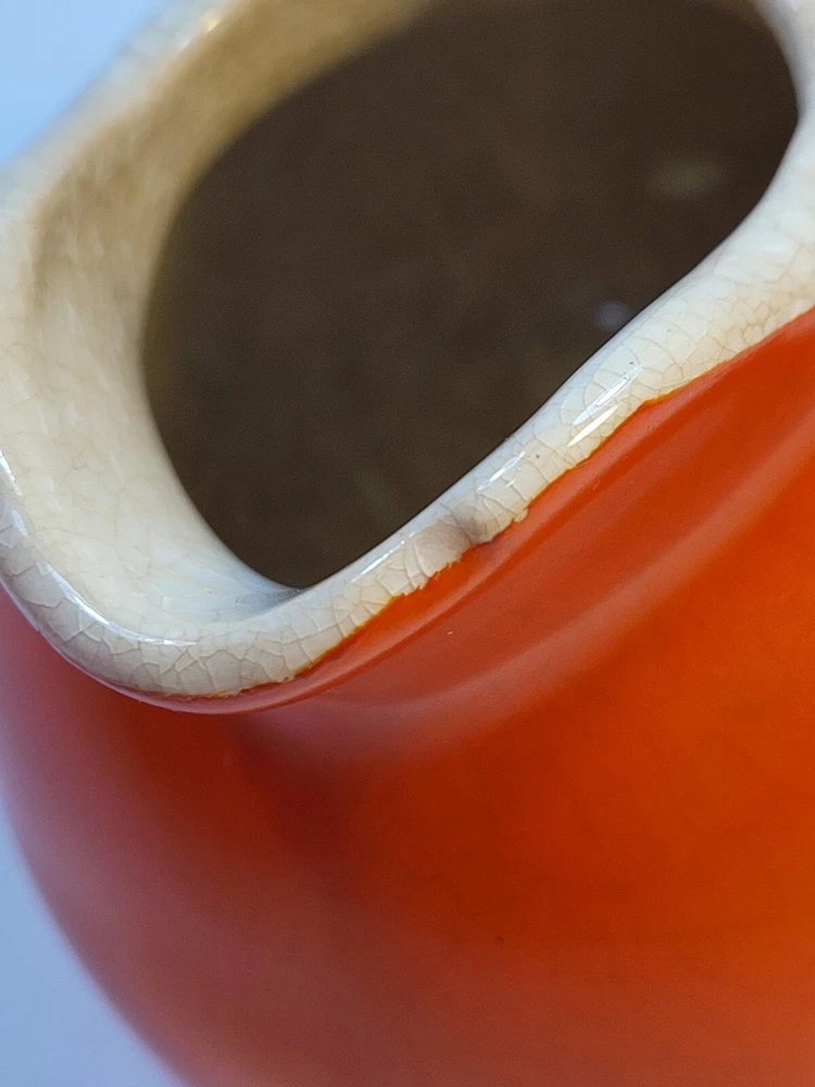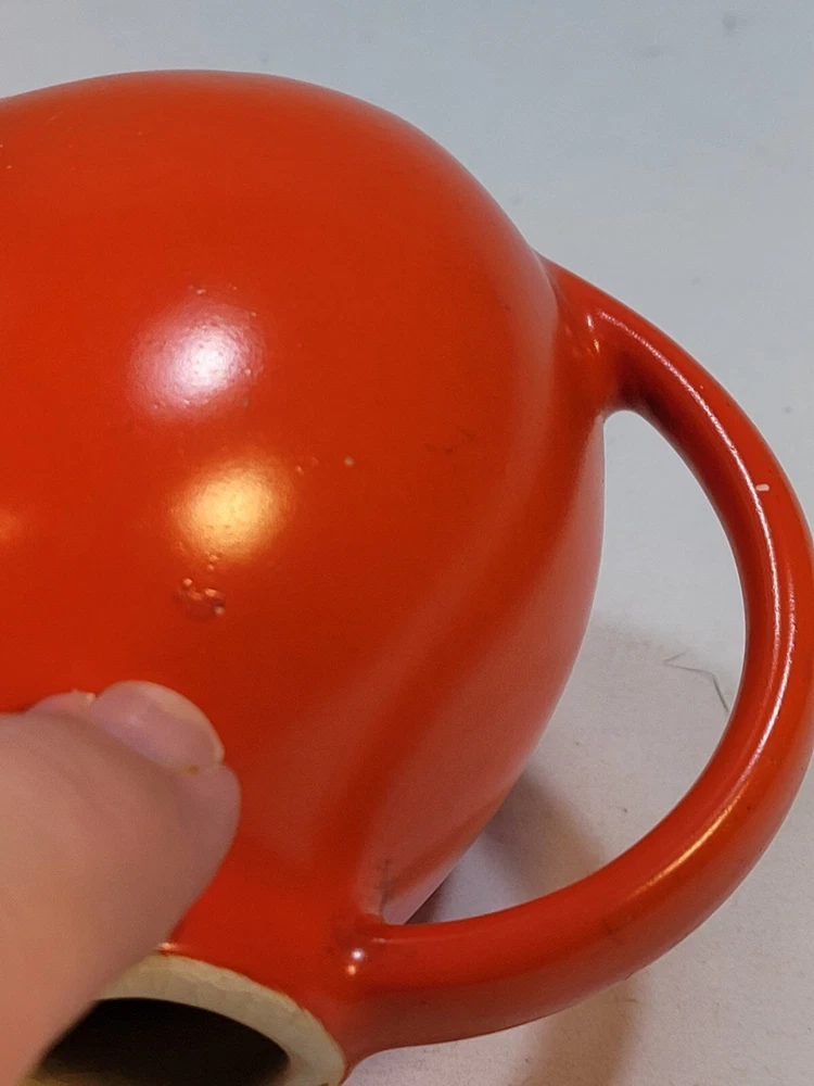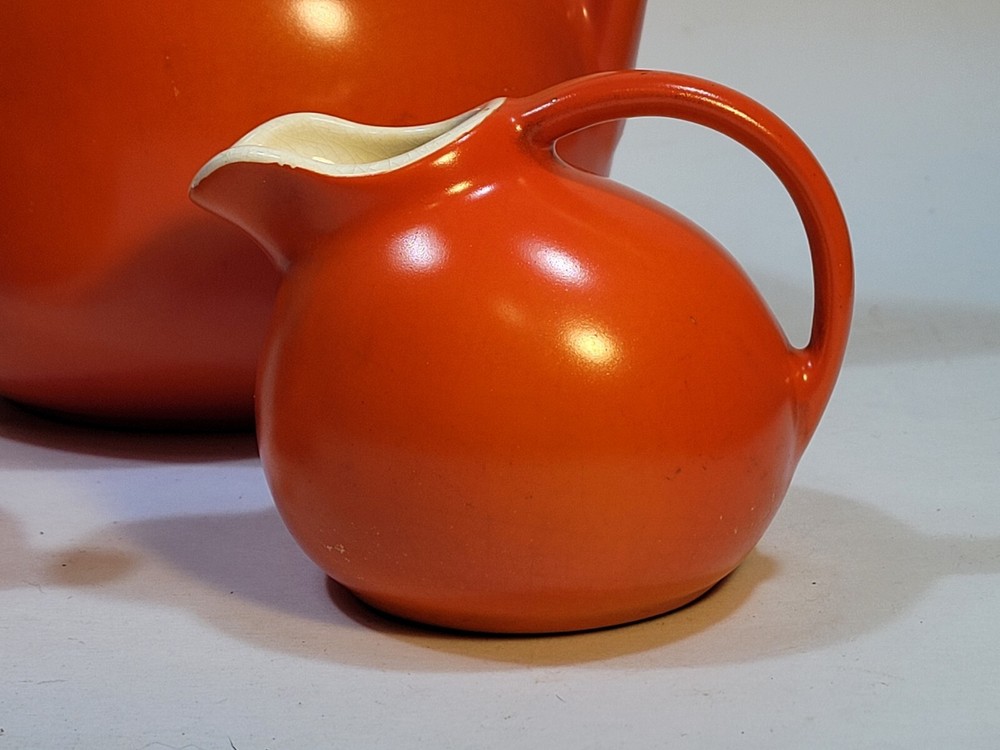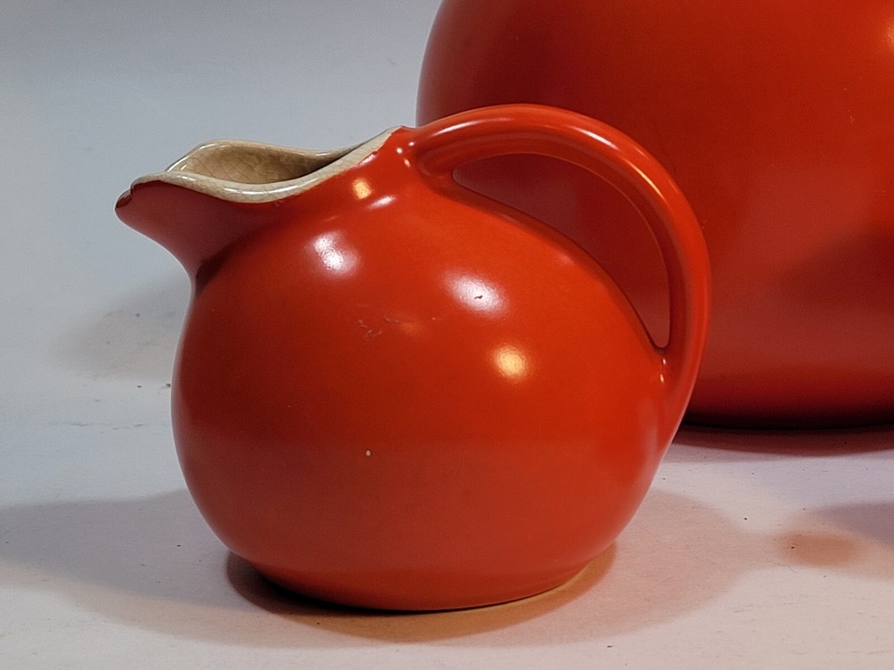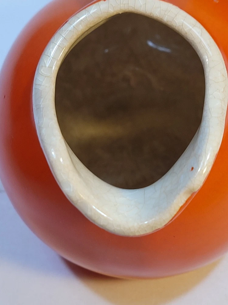 Lot 3 Ball Jug Pitchers All are Unbranded Large Pitcher has "USA" stamped in bottom Mid-Century MCM Color: Orange Significant Crazing on interiors of all 3 items Large Pitcher is 7 inches tall X 6 inches wide 2 Small Pitchers are 3.5 inches tall and 3.5 inches wide Used Items - Scuffs and marks - The large pitcher has a few manufacturer paint flaws around the base - see last photo - significant crazing on interior of all 3 items - see photos for close-ups of items and marks and scuffs on all 3 items - Overall good working condition - great decorative pieces Shipping is UPS Ground